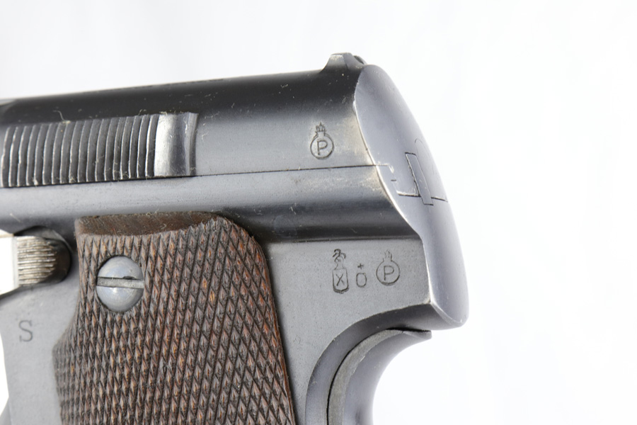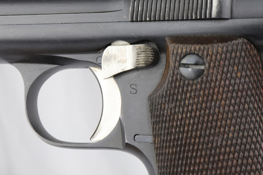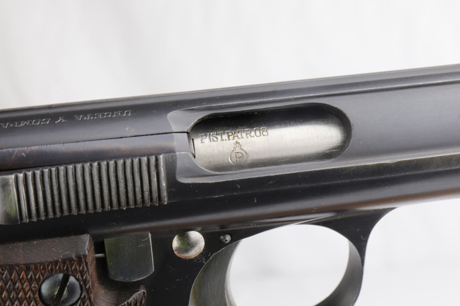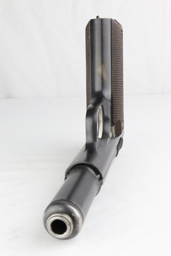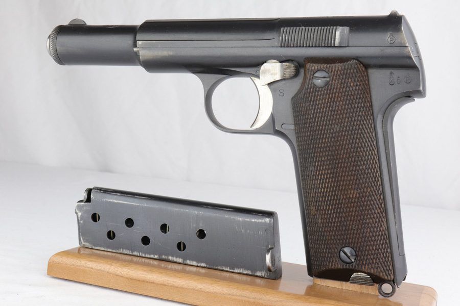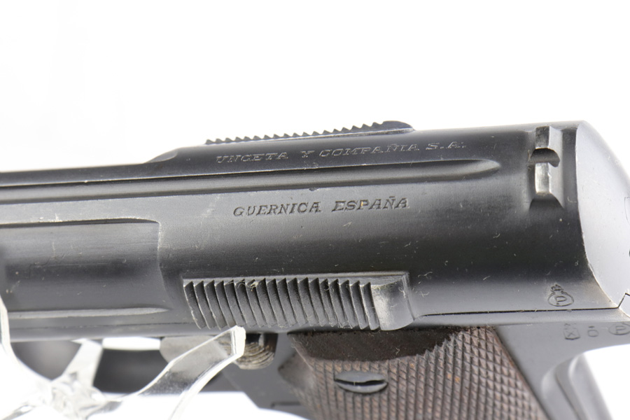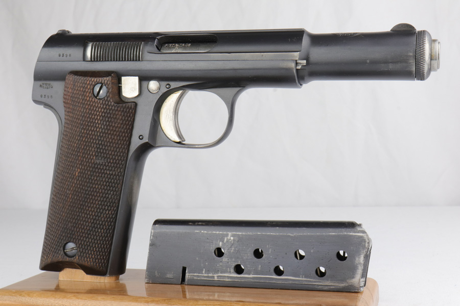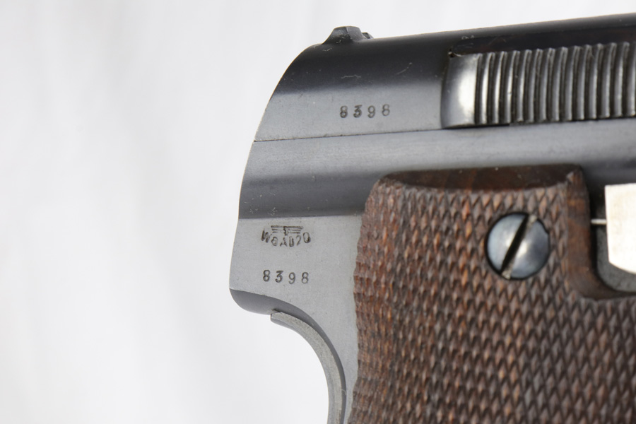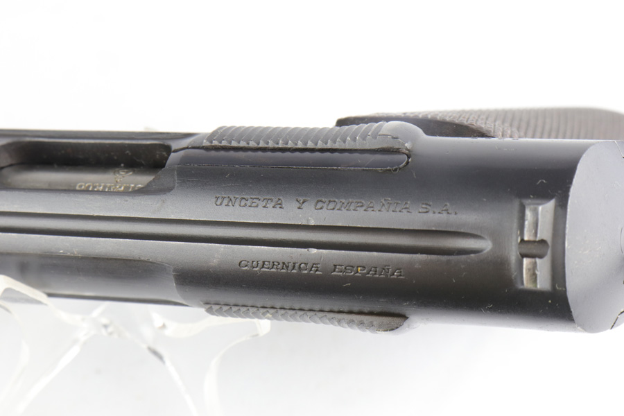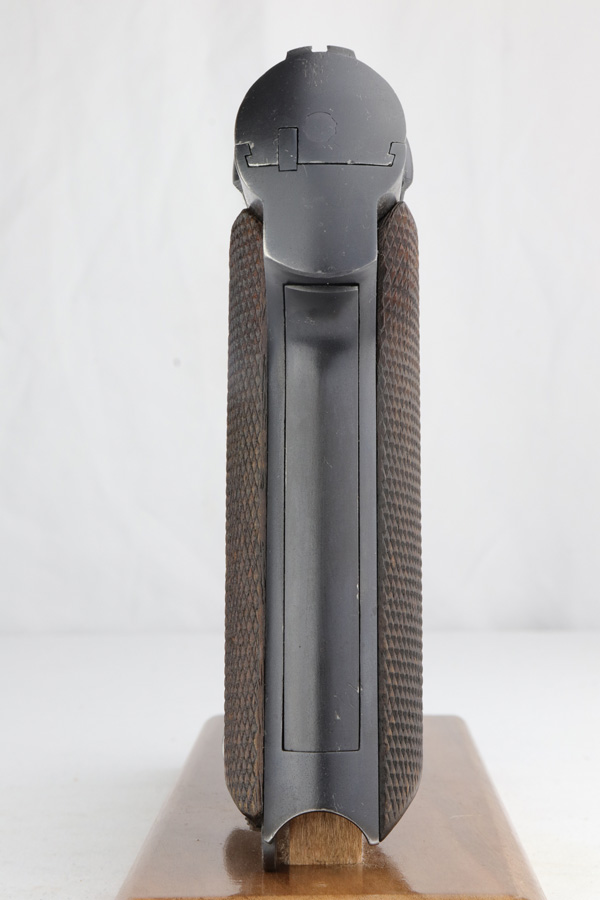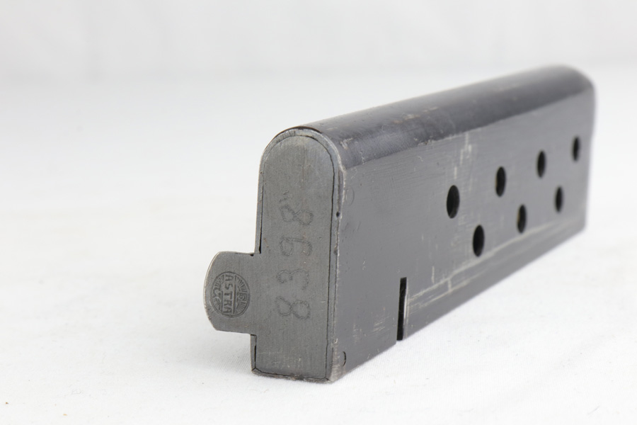 3/12/19 – This is a very nice and honest example of a scarce Astra 600 that is waffen marked and part of the first Nazi contract for these pistols. This pistol was delivered on July 16 of 1944 in the last batch of Nazi ordered Astra 600s, and it retains about 95-97% of the original blue with minor edge wear, and a couple small areas of finish loss on the trigger guard and front strap. These pistols were delivered to German Army via the Spanish-French border before it was closed by the Allies. Only about 10,000 waffen marked Astra 600s were delivered before this point. Excellent bore. Grips show minor handling wear and pistol has correct magazine. The magazine has the serial number of the pistol etched on the bottom of the floor plate.