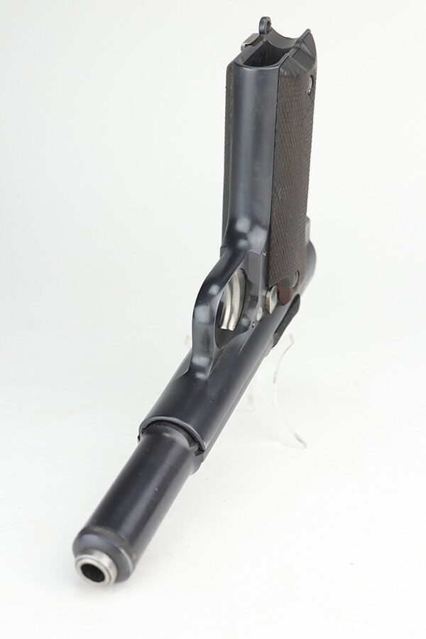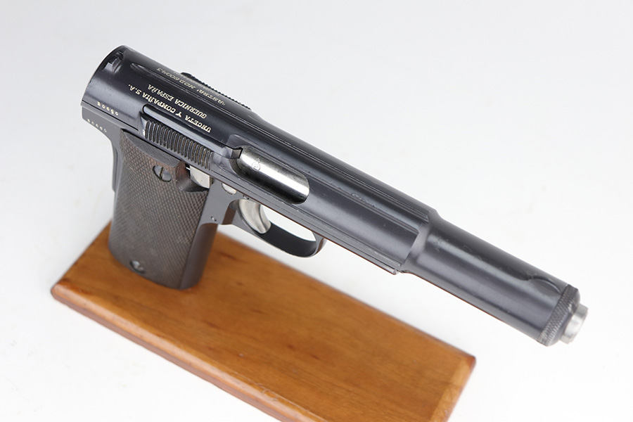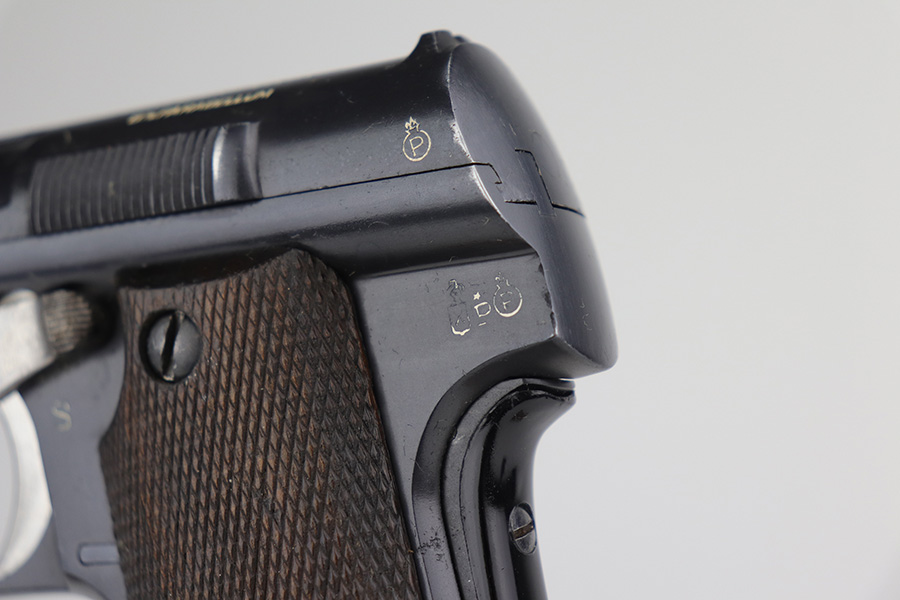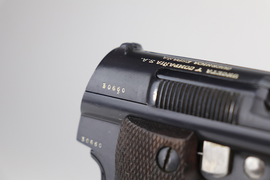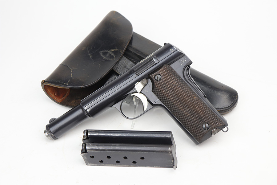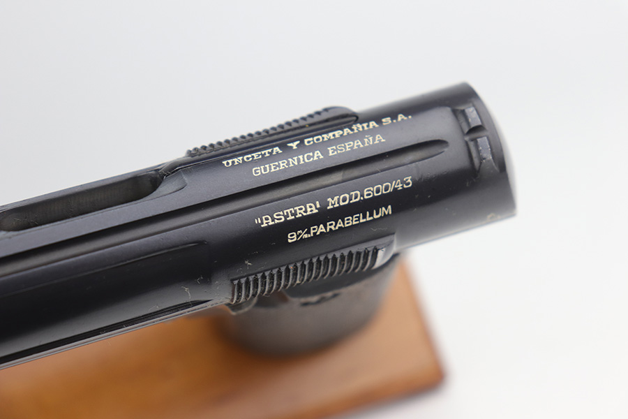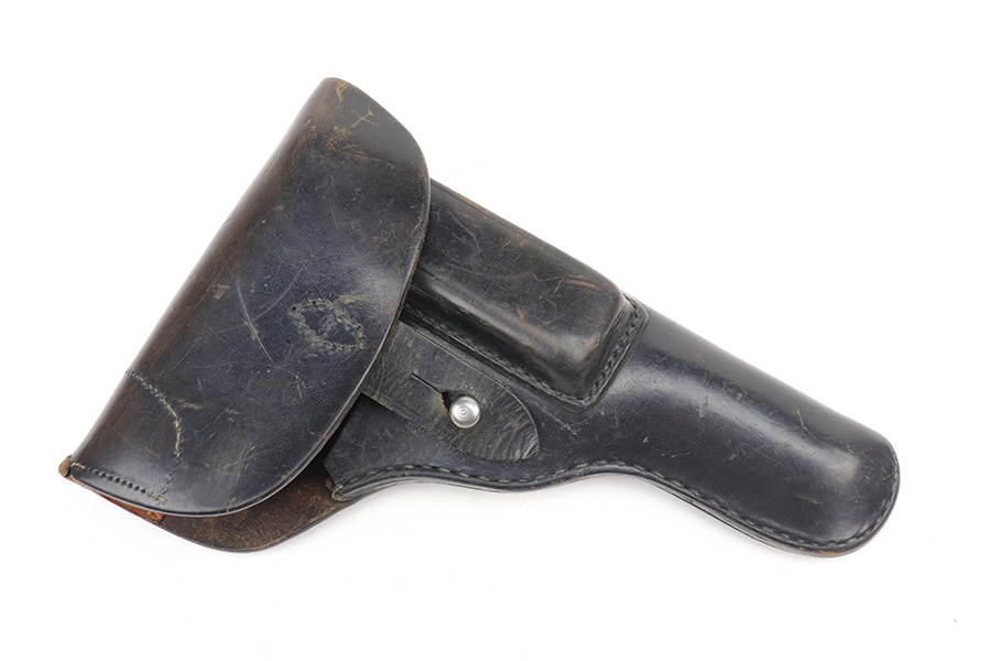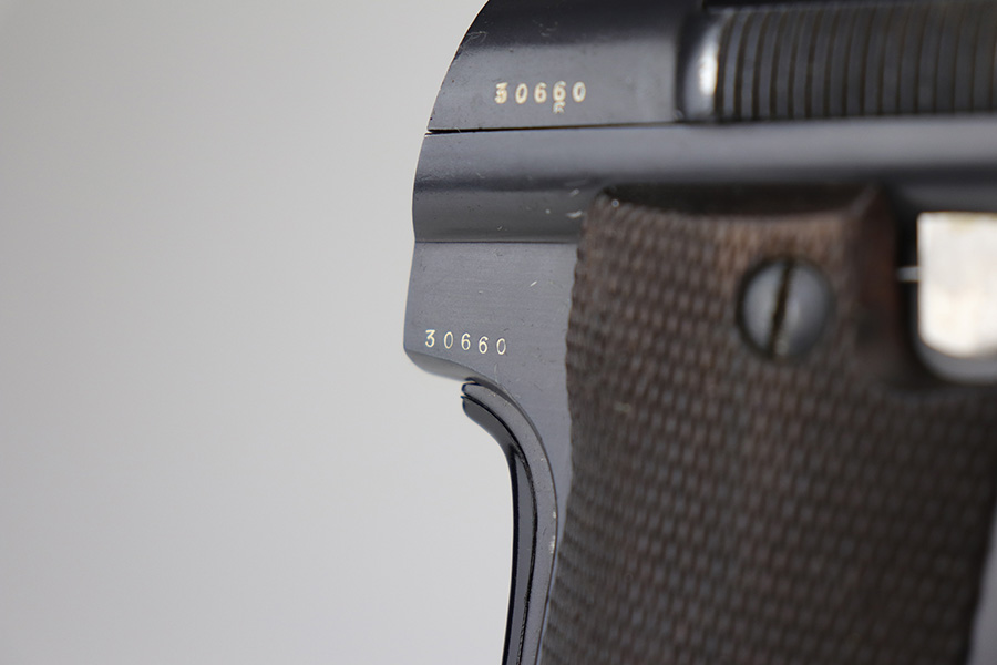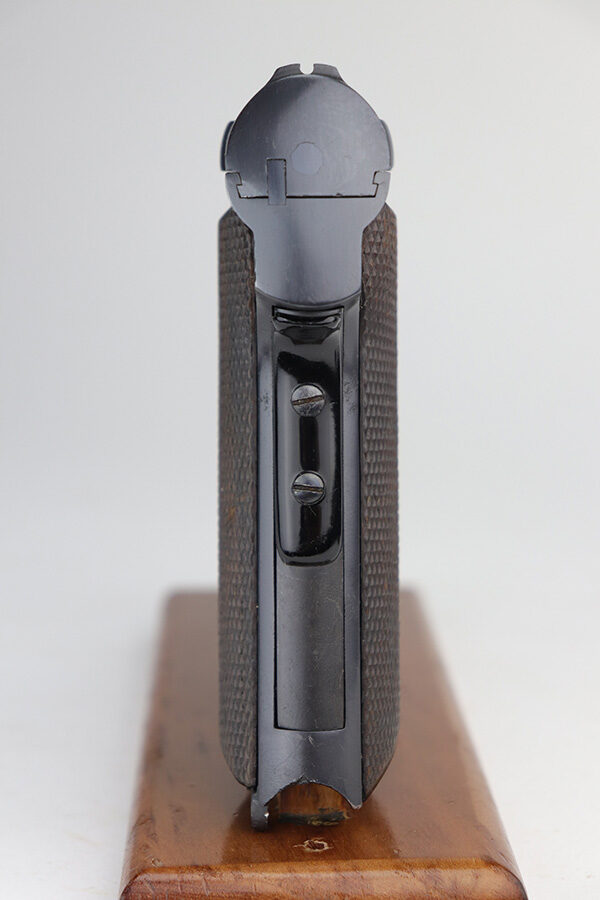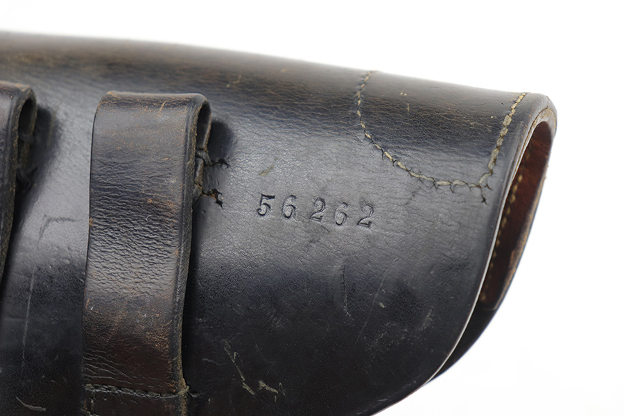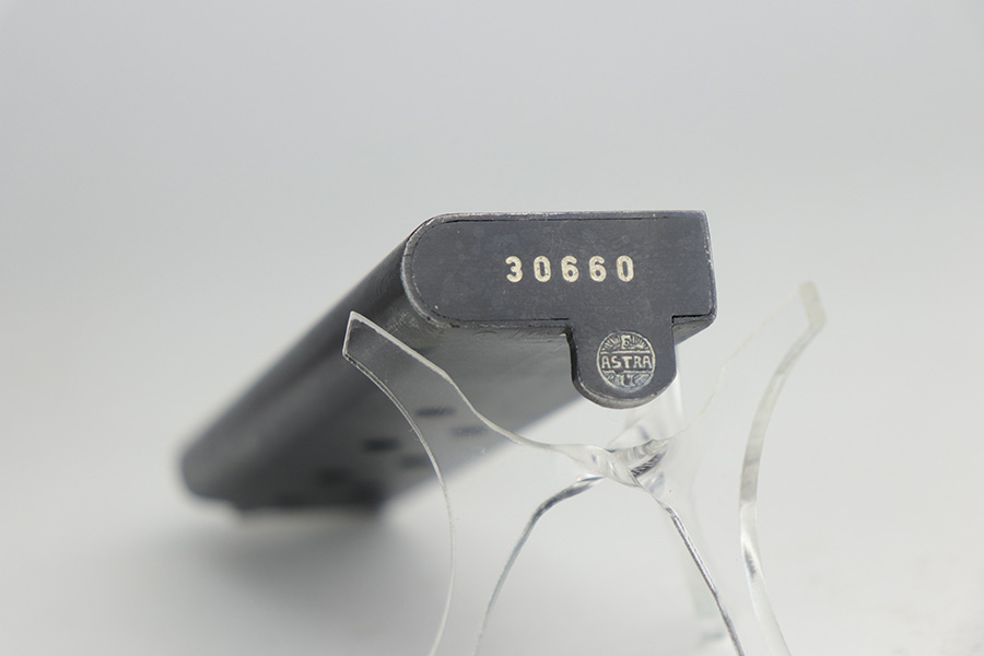 11/5/21 – This is an excellent example of an Astra 600 manufactured some time after WW2. It is all matching and has the proper Spanish proofs on the left side of the frame and slide, near the tang. There is a factory double-stamp of the “6” serial number on the right side of the slide. It comes with a matching-numbered magazine, indicating this gun was likely issued to a West German police organization. The gun comes as a rig with two period-correct magazines (one matching) and an excellent post-WW2 black leather holster. It is a police holster, numbered on the back but not matching to the gun. The gun has retained about 97-98% of its original finish. There are just hints of wear on some of the high edges and some very light handling marks here and there. Comes with excellent wood grips. The bore has good rifling with tiny pits in the grooves.