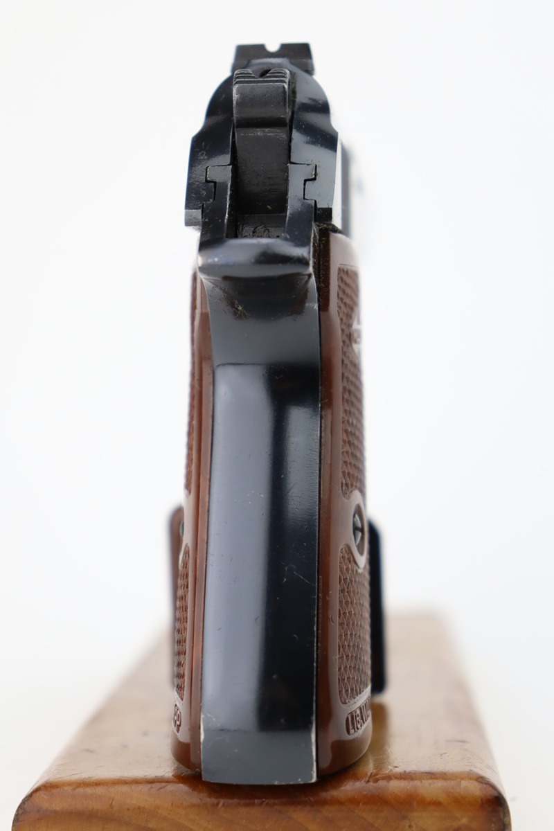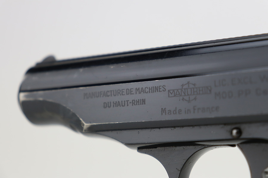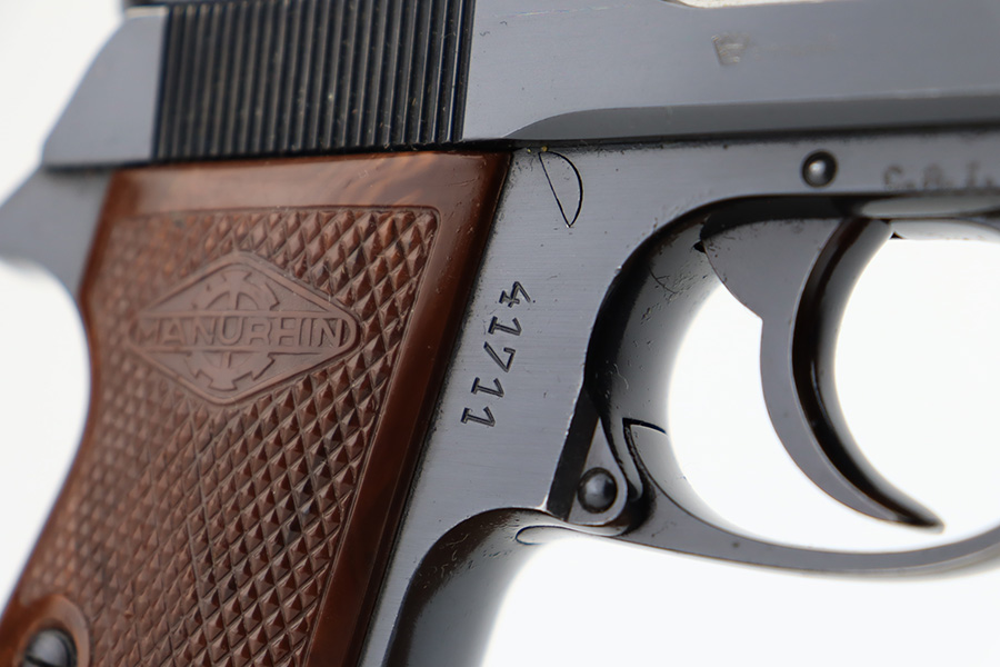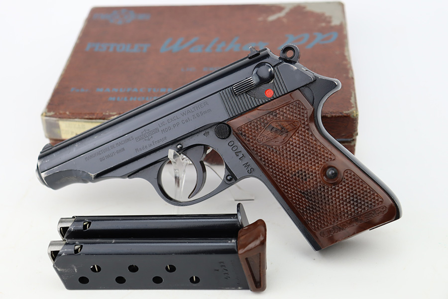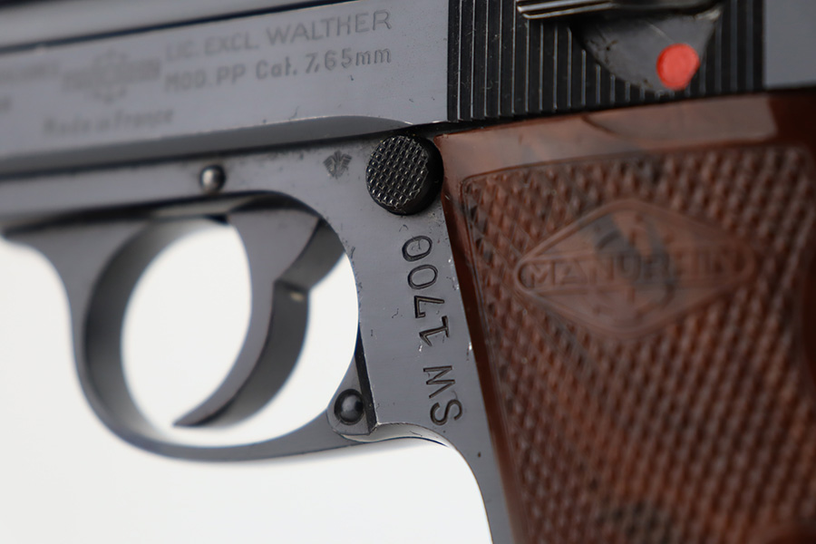 12/27/23 – This is an excellent example of a French Manurhin PP that was issued to the Austrian Police after WW2. The gun is all matching and has the proper “Austrian Eagle” and “SW 6520” Austrian police unit marking on the left side of the frame. “St. Etienne” marking on the barrel and slide. Import mark on the right side of the frame. It comes with the original matching box, cleaning rod, one finger extension magazine, and one flat bottom magazine. Both mags are matching to the gun. The gun has retained roughly 98% of its original finish. There are a few spots of wear along the slide, and a couple scratches on the top strap. Some very minor finish loss on both sides where the slide tapers at the muzzle, and a bit of wear along some of the high edges. Stone mint bore and excellent grips.