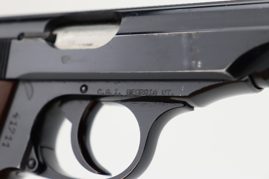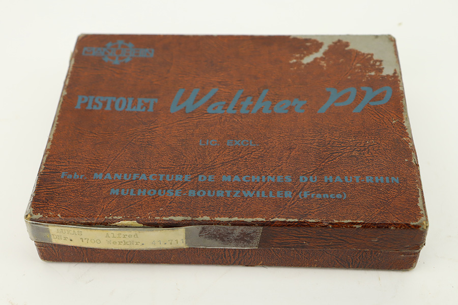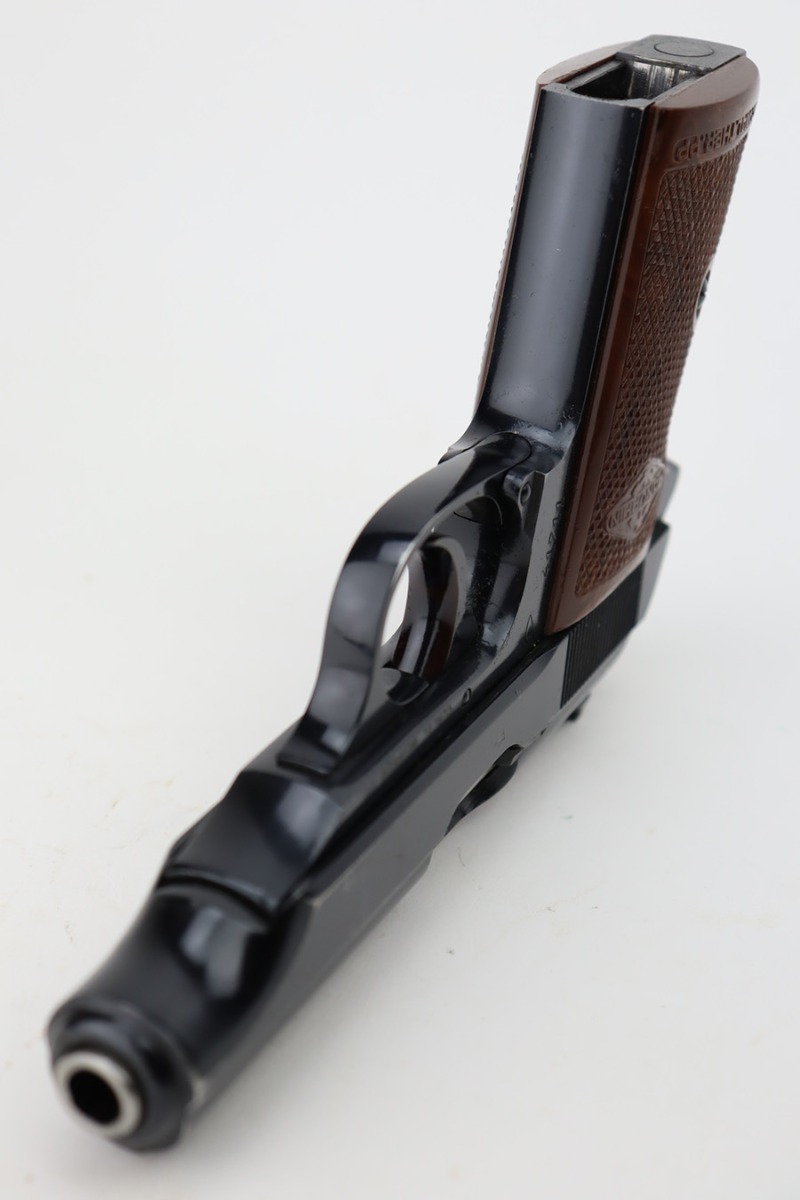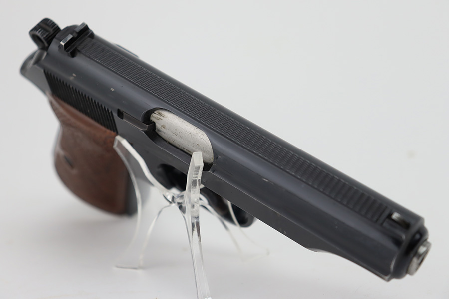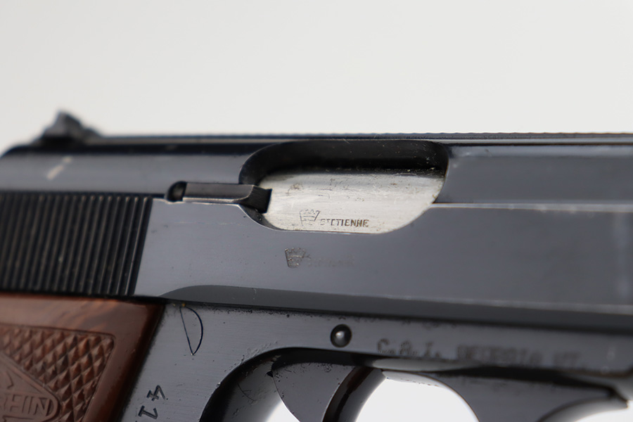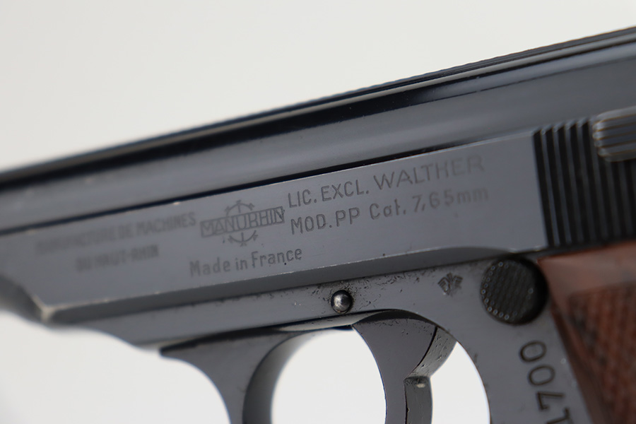 12/27/23 – This is an excellent example of a French Manurhin PP that was issued to the Austrian Police after WW2. The gun is all matching and has the proper “Austrian Eagle” and “SW 6520” Austrian police unit marking on the left side of the frame. “St. Etienne” marking on the barrel and slide. Import mark on the right side of the frame. It comes with the original matching box, cleaning rod, one finger extension magazine, and one flat bottom magazine. Both mags are matching to the gun. The gun has retained roughly 98% of its original finish. There are a few spots of wear along the slide, and a couple scratches on the top strap. Some very minor finish loss on both sides where the slide tapers at the muzzle, and a bit of wear along some of the high edges. Stone mint bore and excellent grips.