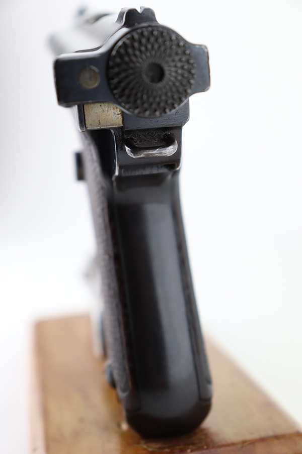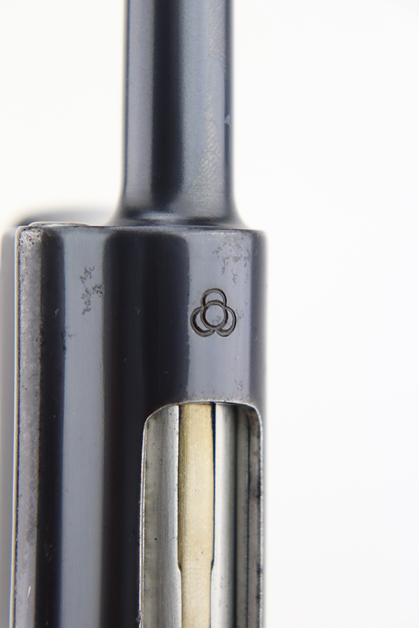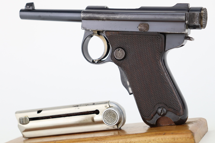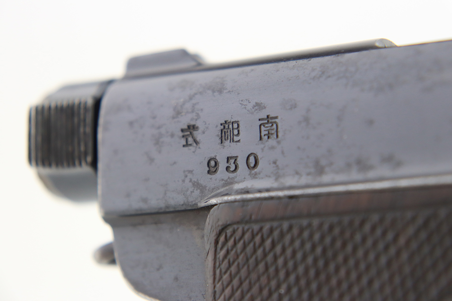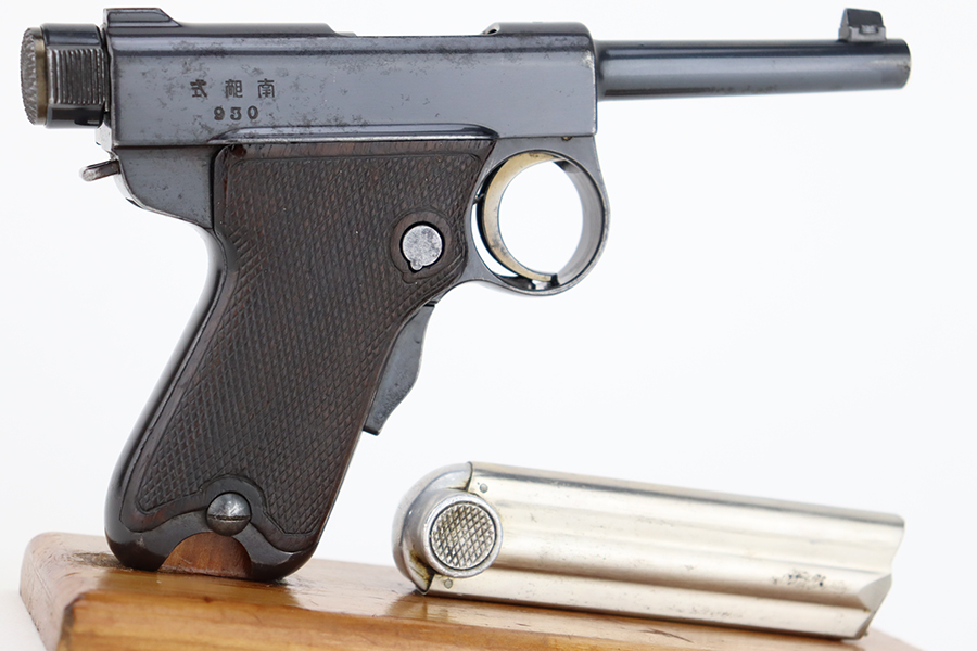 1/18/24 – This is an excellent example of a Baby Nambu pistol issued to a Japanese officer. The gun is matching and was made in the Tokyo Arsenal. It has retained about 97% of its original bluing with very minor high edge wear and some very light pin-pricking on the upper. There is minor freckling on the straps and very minor high edge wear. It comes with original matching grips (a small chip along the top edge of the left panel) and one original matching magazine. Mint bore.
