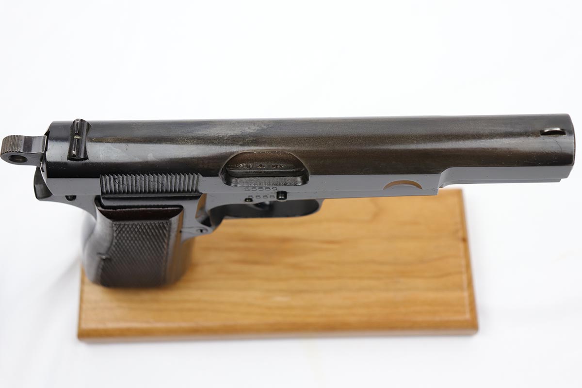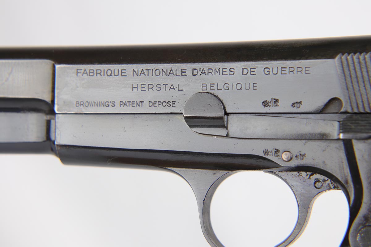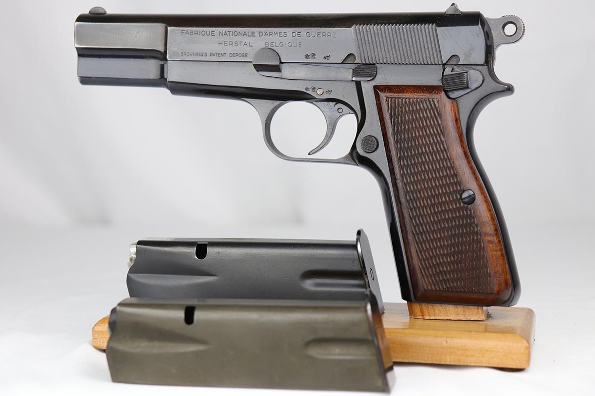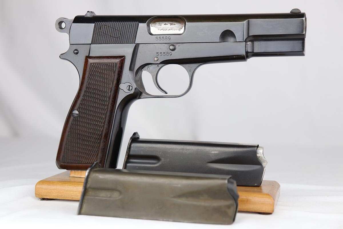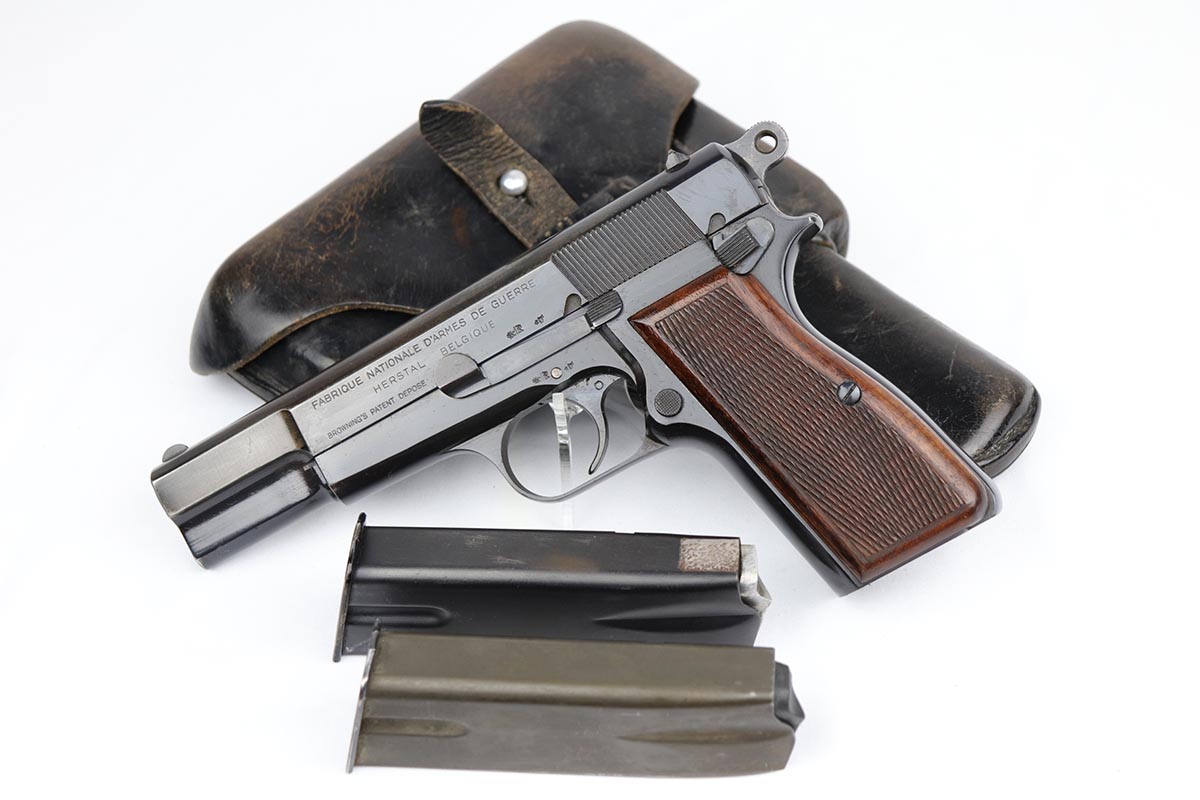 11/15/18 – This is an excellent FN Browning Hi Power rig from the early 1950s. The original blue rates at 95-97% with minor thinning/patina along the top of the slide. Minty bore and grips. Comes with two magazines, both unmarked, one blued and the other phosphated. It comes with a commercial holster from the era, which is 1956 dated and maker marked.