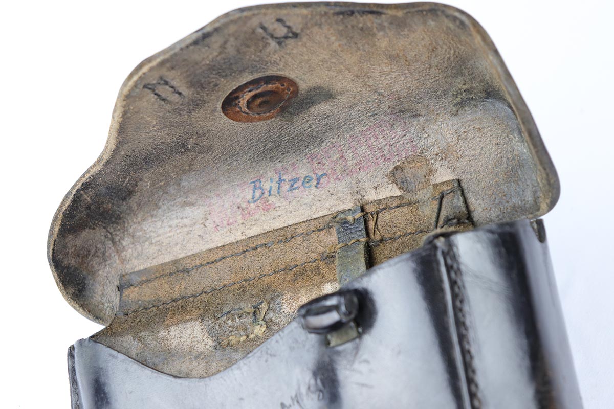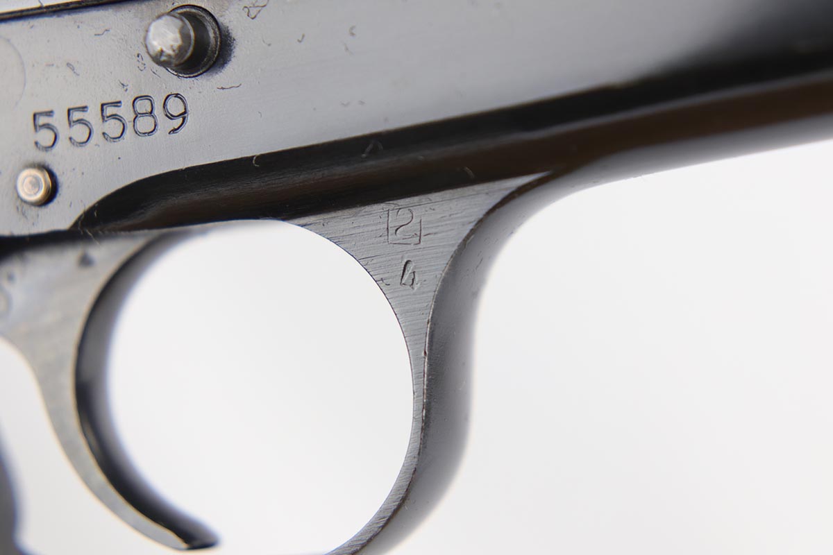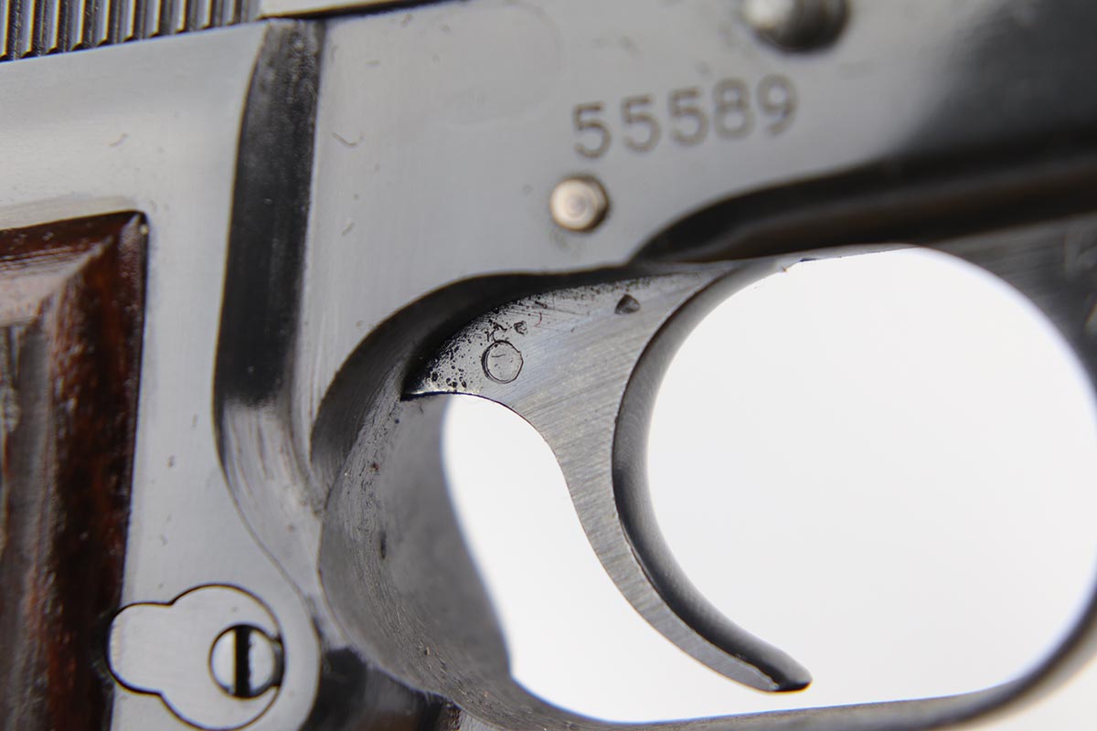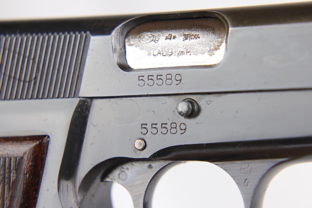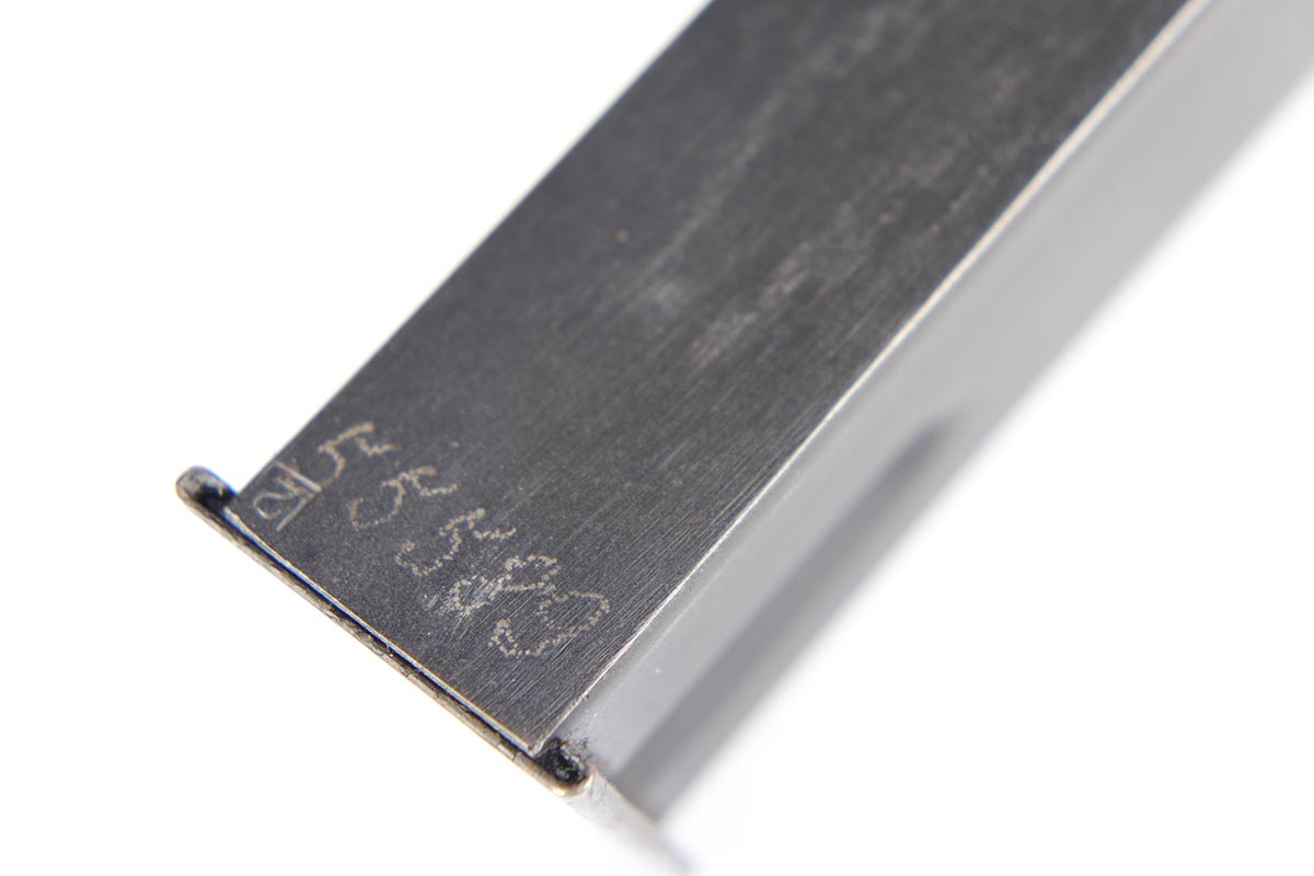 11/15/18 – This is an excellent FN Browning Hi Power rig from the early 1950s. The original blue rates at 95-97% with minor thinning/patina along the top of the slide. Minty bore and grips. Comes with two magazines, both unmarked, one blued and the other phosphated. It comes with a commercial holster from the era, which is 1956 dated and maker marked.