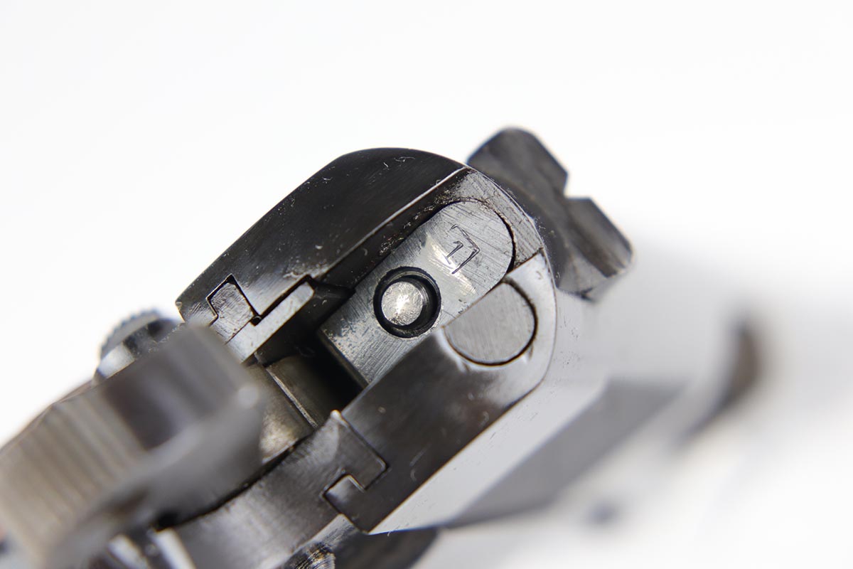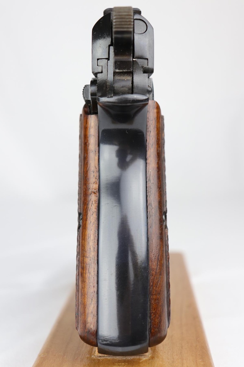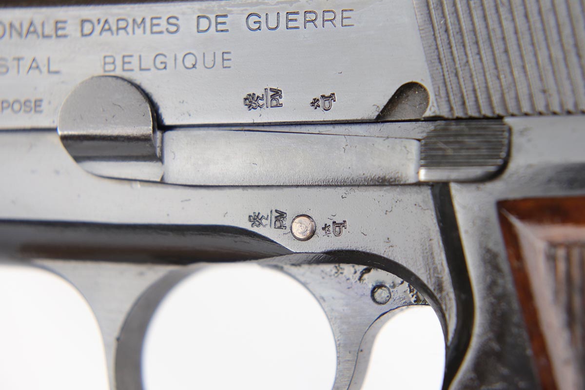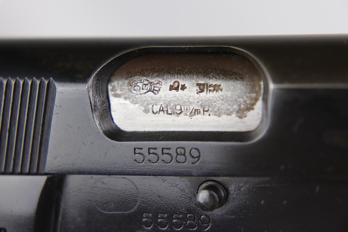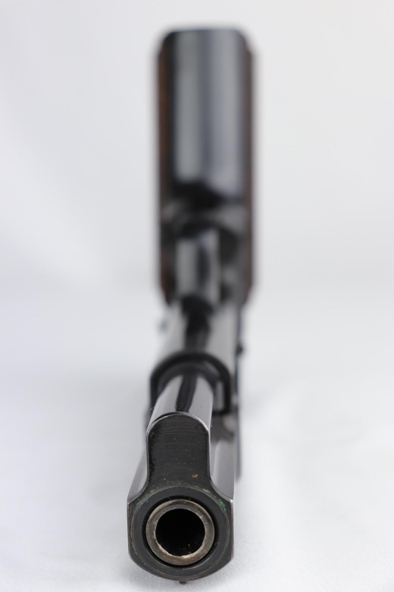 11/15/18 – This is an excellent FN Browning Hi Power rig from the early 1950s. The original blue rates at 95-97% with minor thinning/patina along the top of the slide. Minty bore and grips. Comes with two magazines, both unmarked, one blued and the other phosphated. It comes with a commercial holster from the era, which is 1956 dated and maker marked.