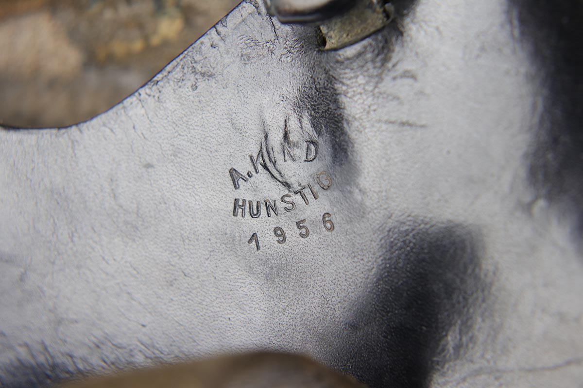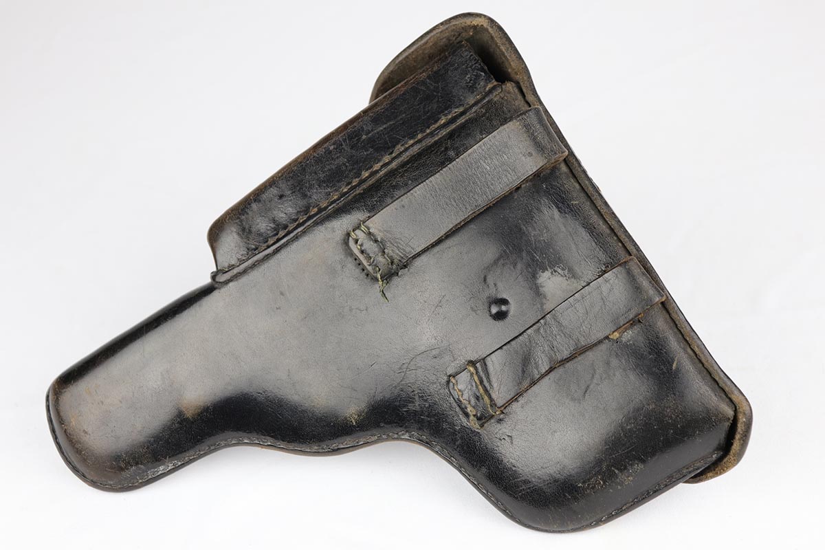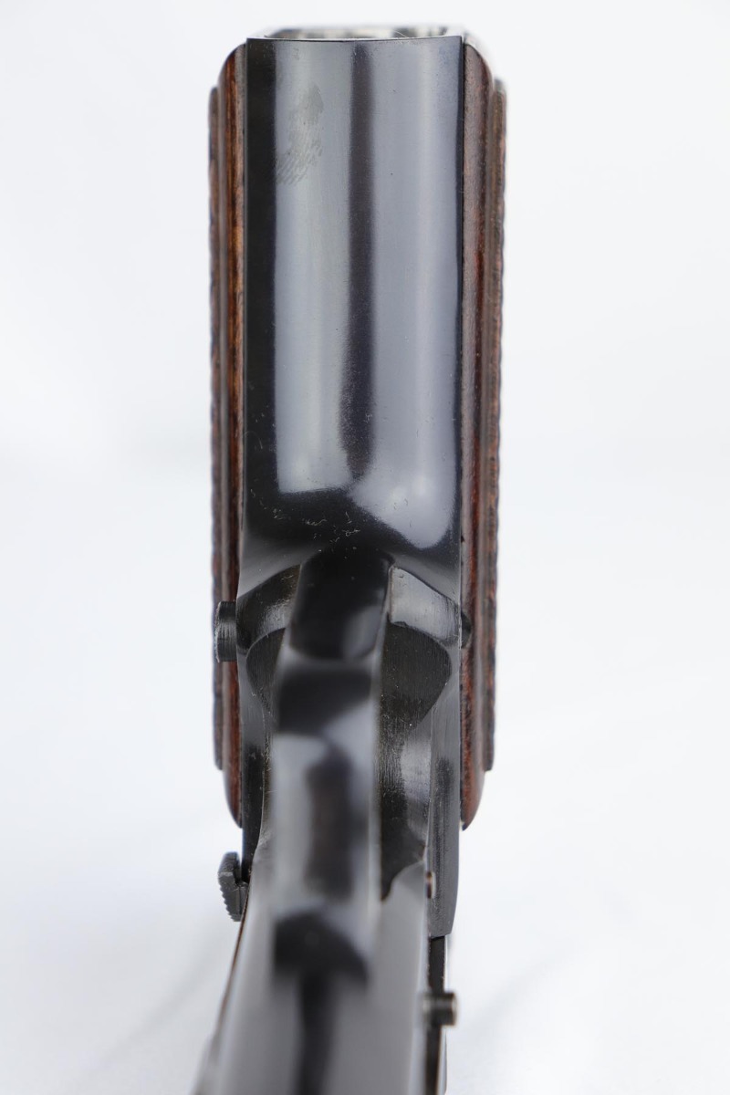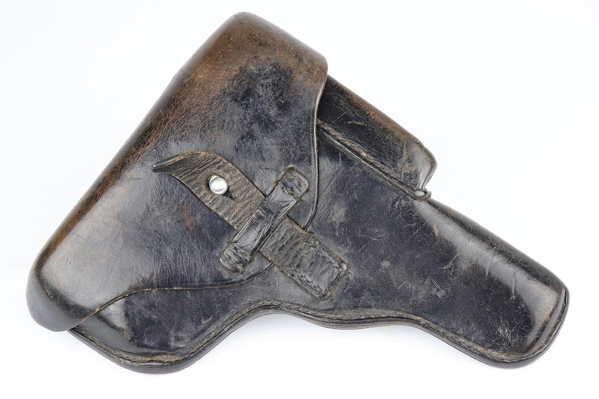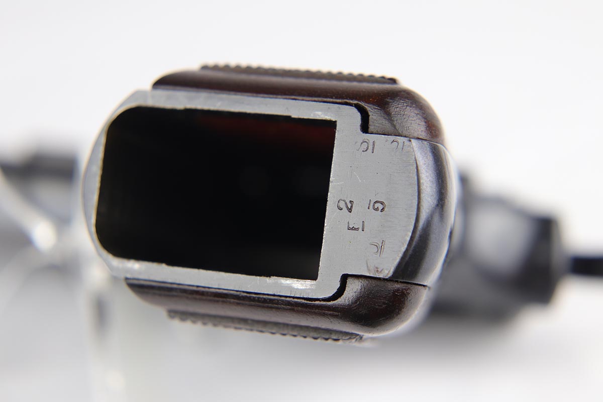 11/15/18 – This is an excellent FN Browning Hi Power rig from the early 1950s. The original blue rates at 95-97% with minor thinning/patina along the top of the slide. Minty bore and grips. Comes with two magazines, both unmarked, one blued and the other phosphated. It comes with a commercial holster from the era, which is 1956 dated and maker marked.