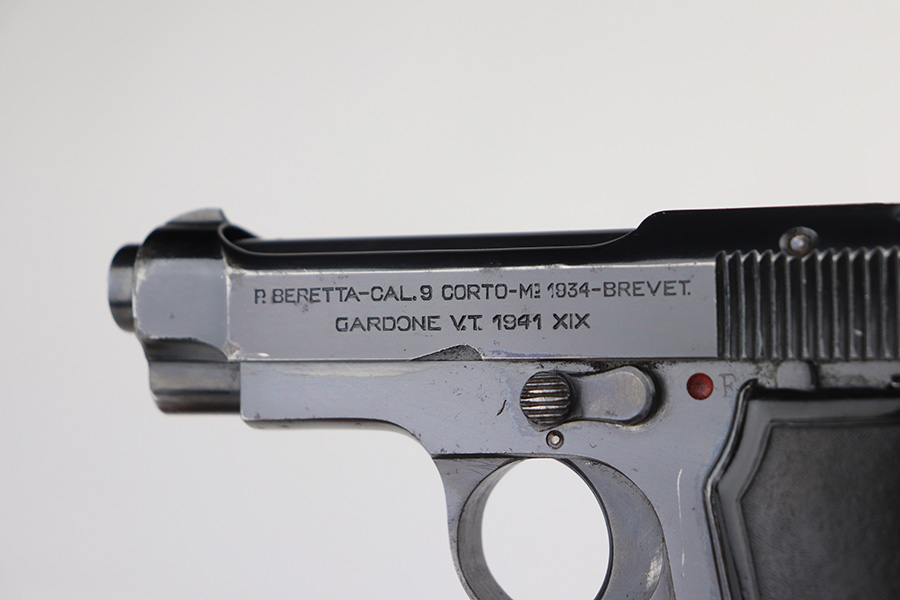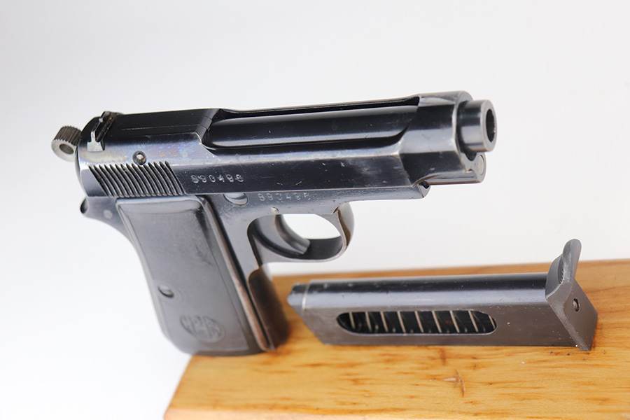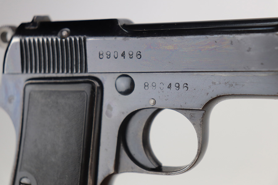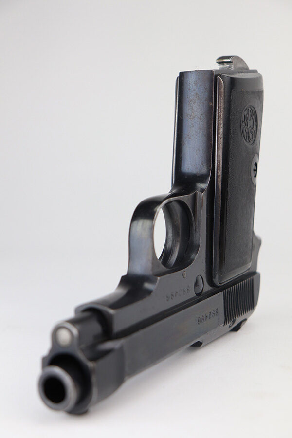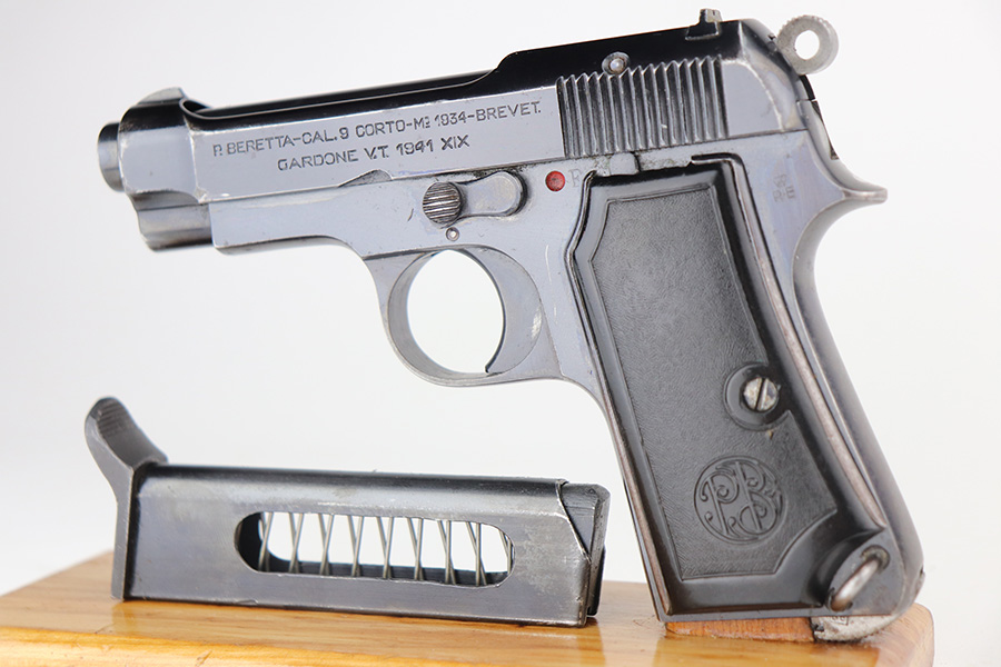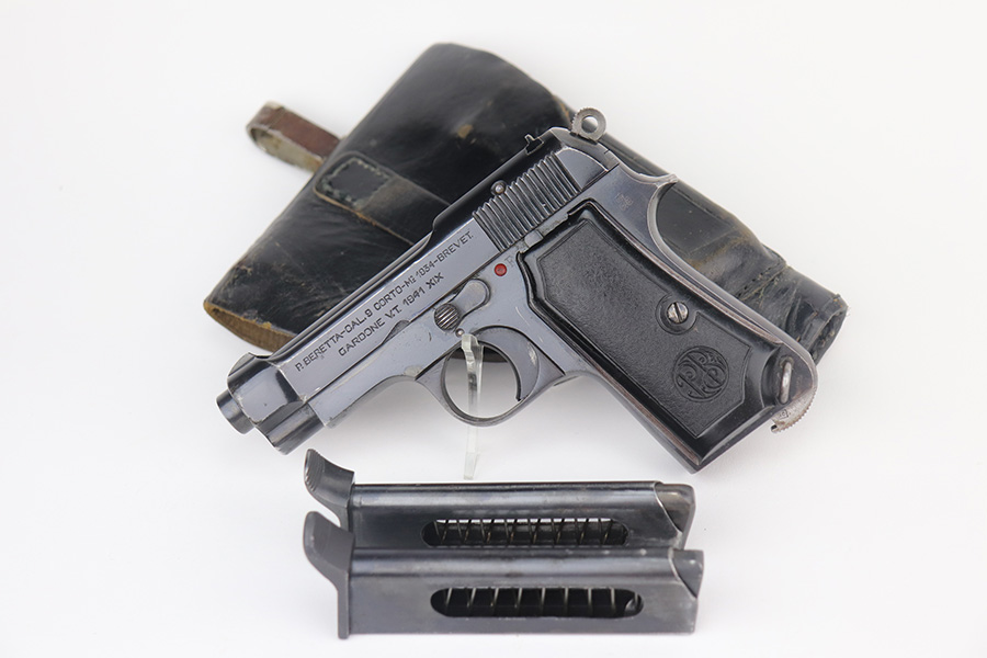 6/18/21 – This is an excellent example of a Beretta Model 1934 rig issued to the Italian military in 1941. The gun is all matching and has the proper “Crown RE” Italian military proof. The rig comes with a period-correct holster and two period-correct magazines. The holster was made for the Italian police or “Carabineri”, a part of the Italian Army during WW2. That makes this a fairly rare holster. It has retained about 96-97% of its high polish finish. Minor wear on the high edges of the slide and around the muzzle. There are small dots of oxidation here and there, most noticeable on the straps. One noticeable scratch on the left side of the frame. Excellent grips. Very nice bore with strong rifling and minor frosting in the grooves.