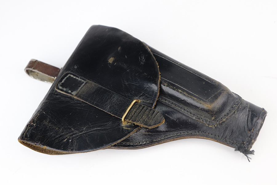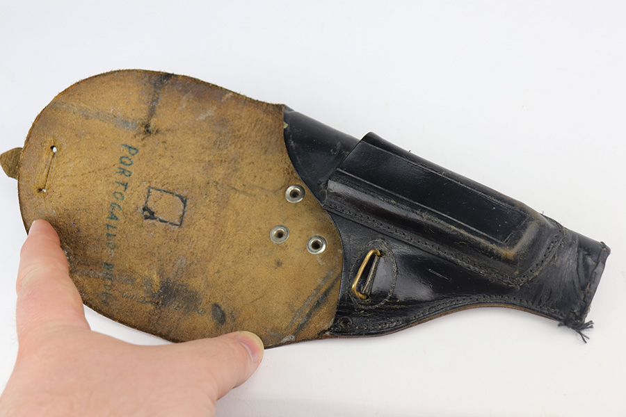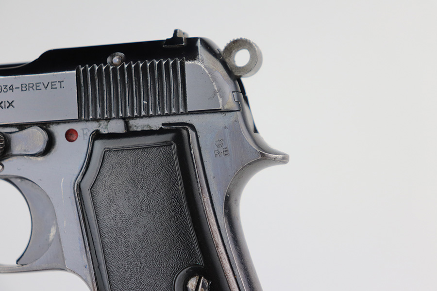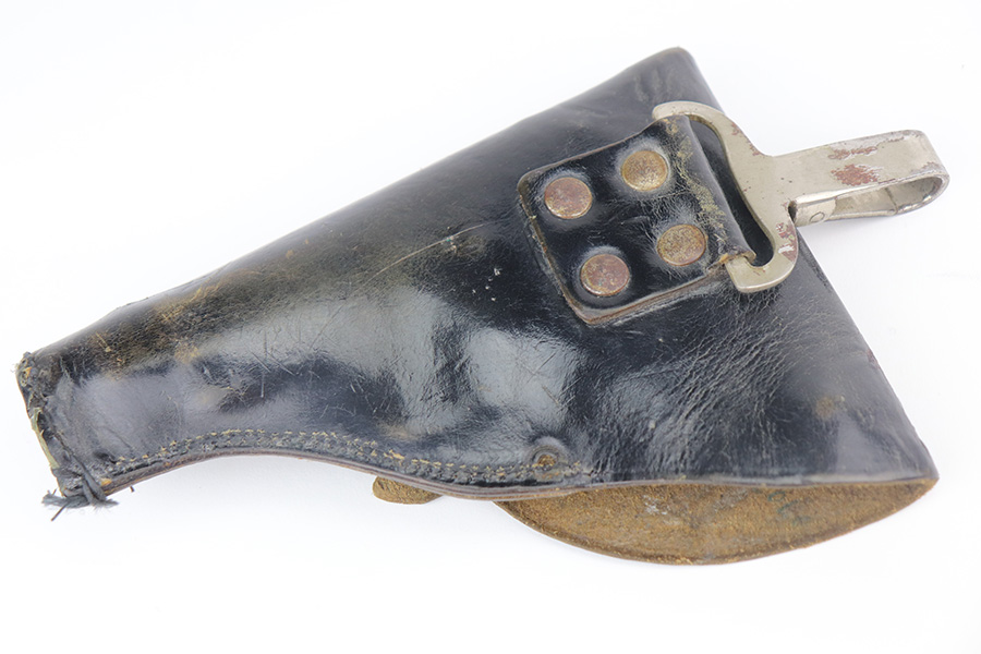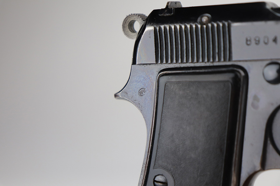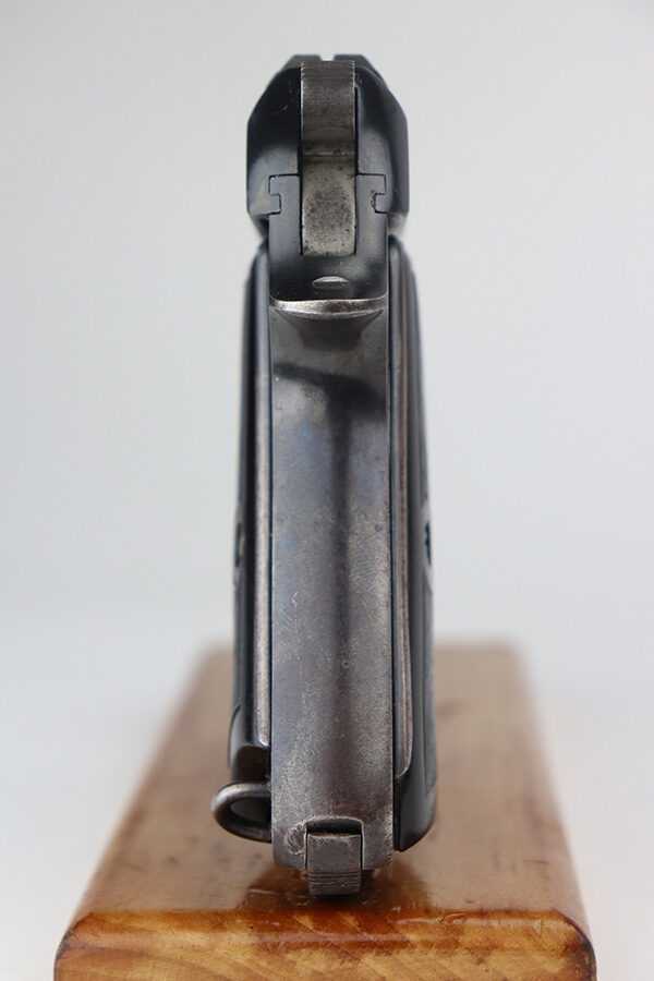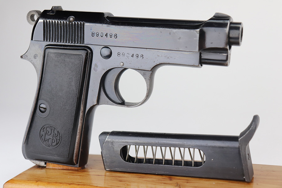 6/18/21 – This is an excellent example of a Beretta Model 1934 rig issued to the Italian military in 1941. The gun is all matching and has the proper “Crown RE” Italian military proof. The rig comes with a period-correct holster and two period-correct magazines. The holster was made for the Italian police or “Carabineri”, a part of the Italian Army during WW2. That makes this a fairly rare holster. It has retained about 96-97% of its high polish finish. Minor wear on the high edges of the slide and around the muzzle. There are small dots of oxidation here and there, most noticeable on the straps. One noticeable scratch on the left side of the frame. Excellent grips. Very nice bore with strong rifling and minor frosting in the grooves.
