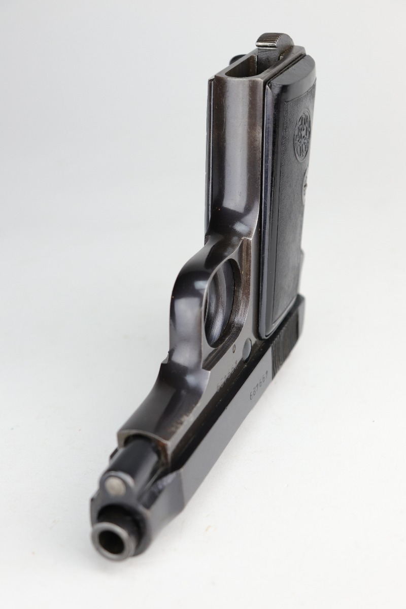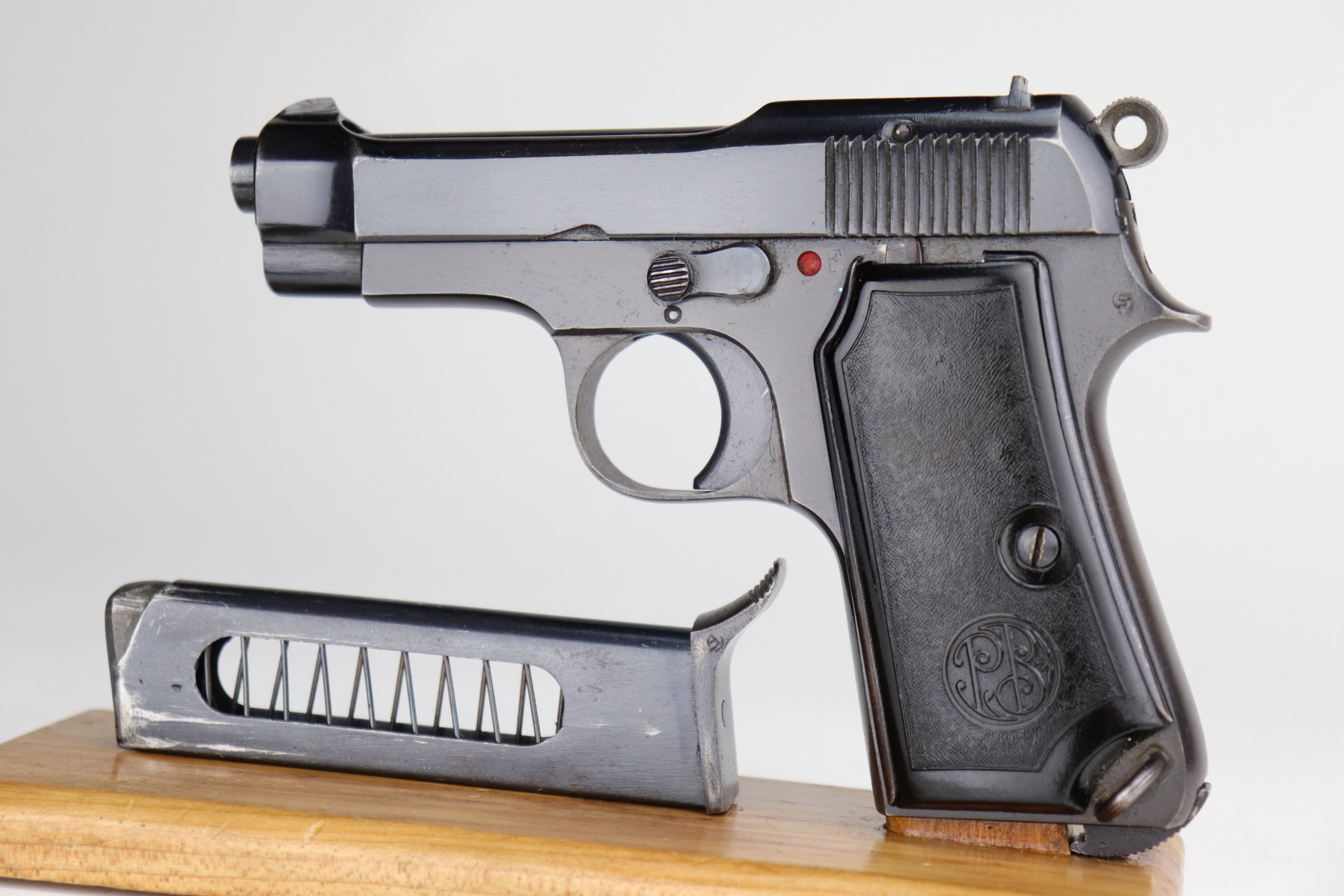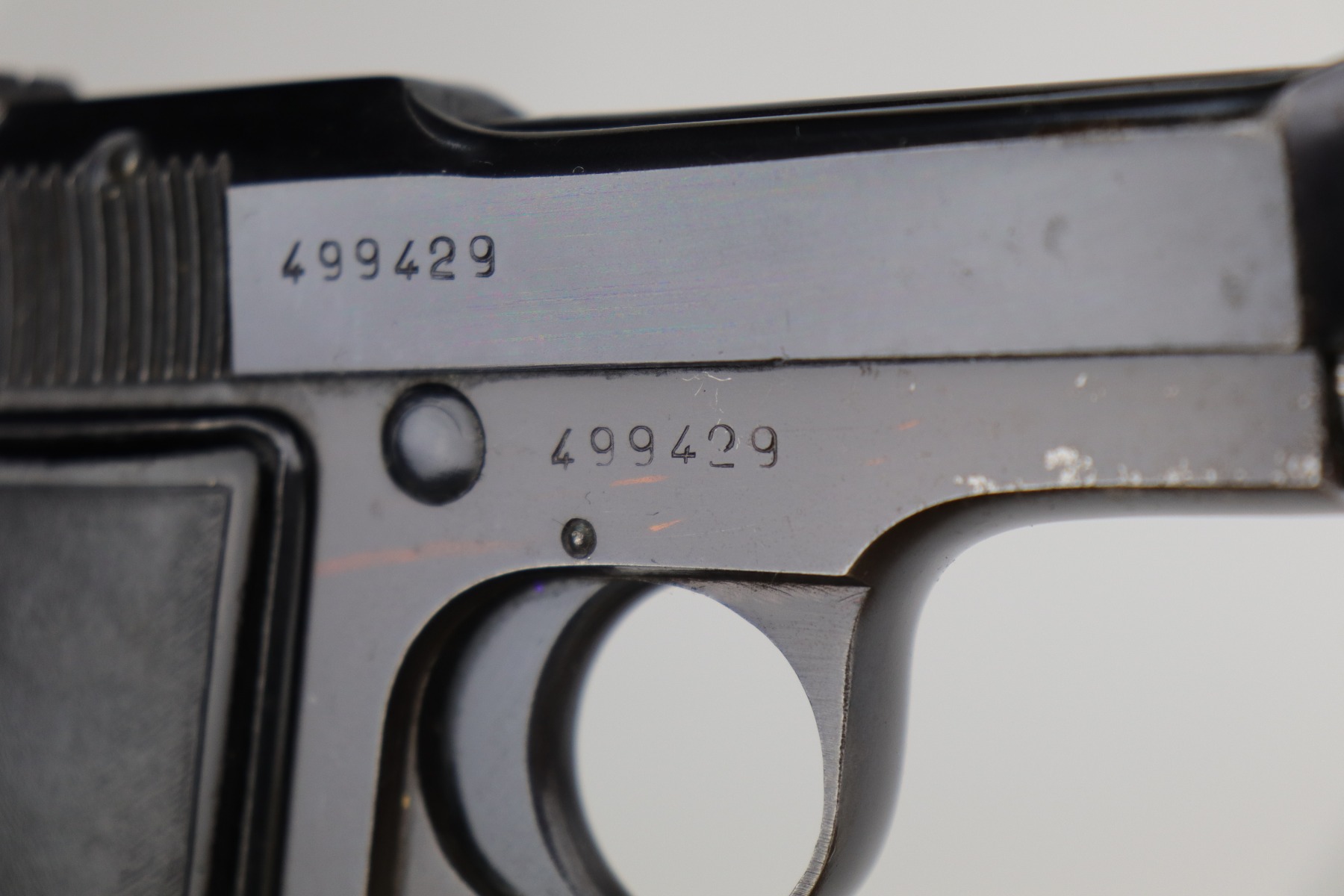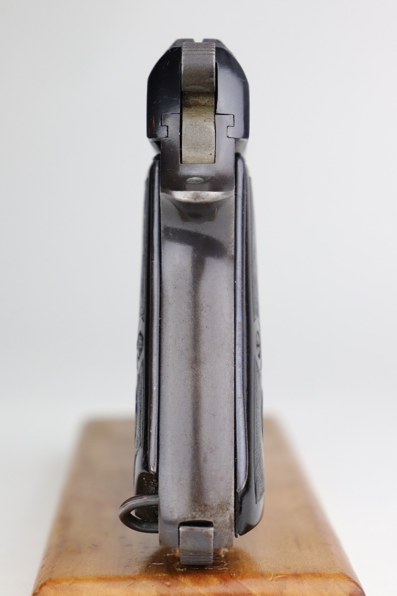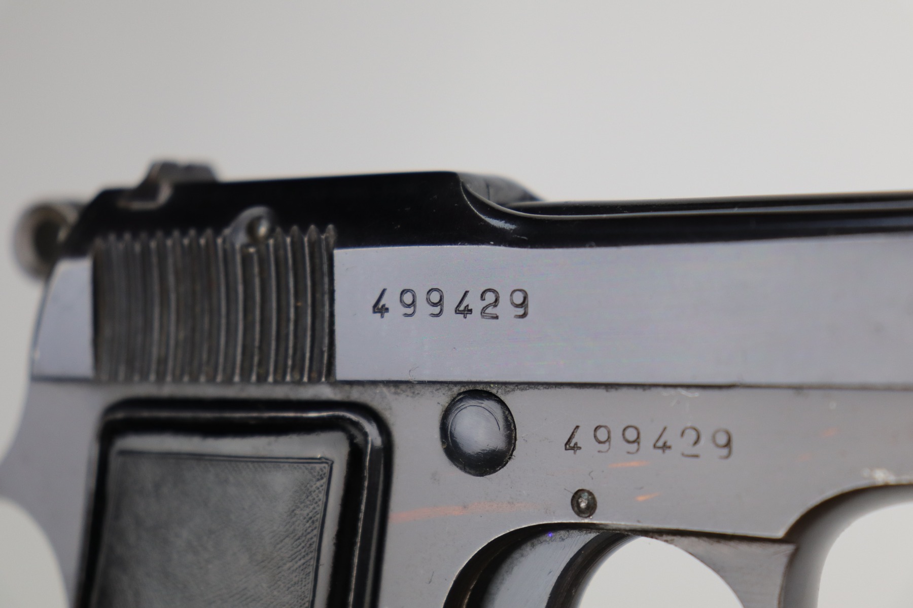 2/9/21 – This is an excellent example of an Italian Beretta Model 1935 made in around 1943 and chambered in 7.65mm. The gun is matching and has a “CF” proof on the tang. We weren’t able to find much information on its meaning. It has retained about 96-97% of its original bluing. There is minor wear on the high edges of the slide and very minor thinning and patina on the straps. There is a small area of splotchy discoloration on the right side of the frame. It comes with excellent grips and a period-correct magazine. The mag is a little tough to remove when the slide is racked. The rifling in the bore is worn and there is oxidation throughout.