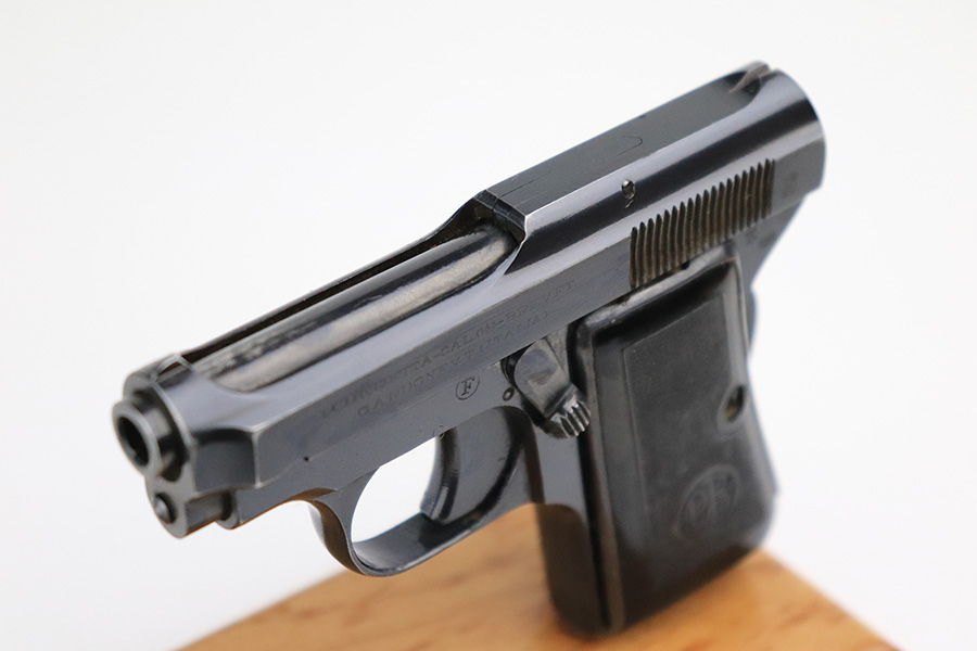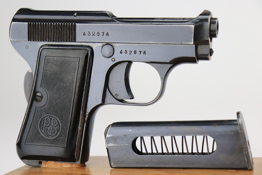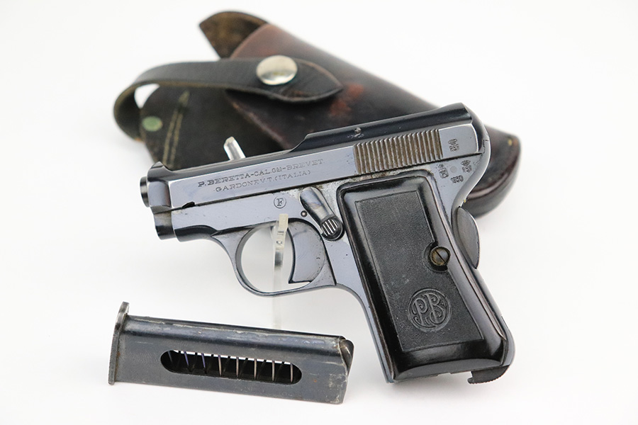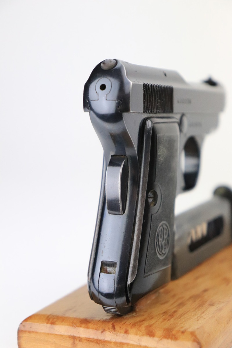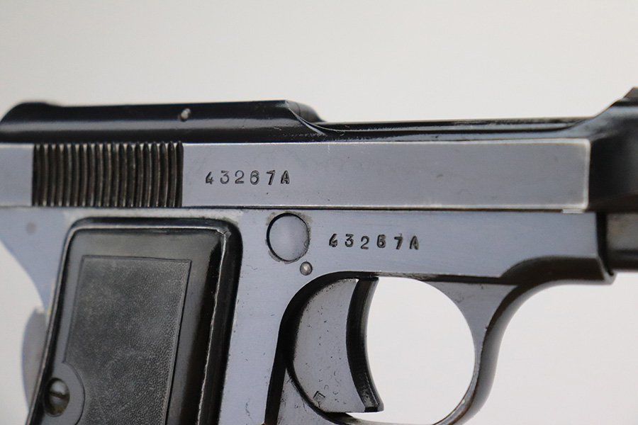 7/13/22 – This is an excellent example of a Beretta Model 418 manufactured in 1950. It is all matching and has the proper Italian proofs throughout. It comes as a rig with one proper magazine and a leather holster that fits the gun well. The gun itself has retained about 97% of its original high polish finish with just very minor wear around some of the high edges. Comes with excellent period-correct black bakelite grips. Minty bore.
