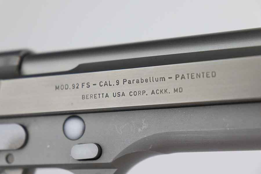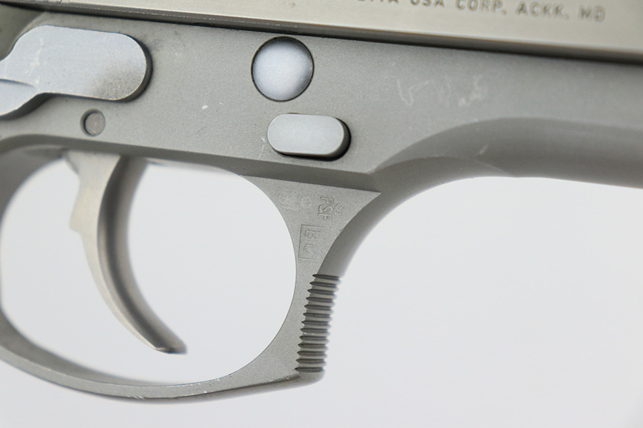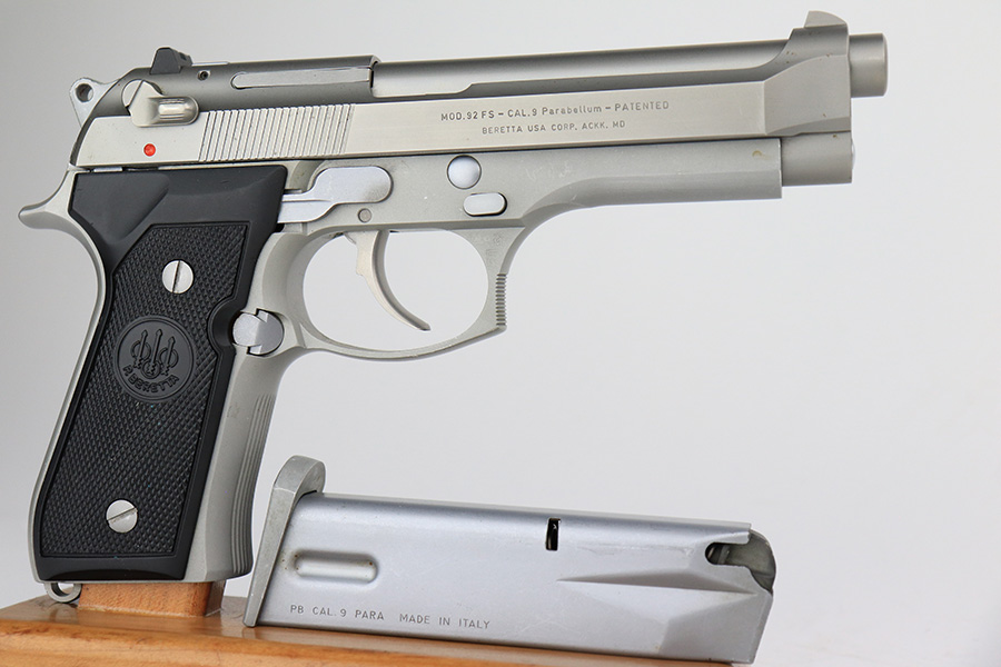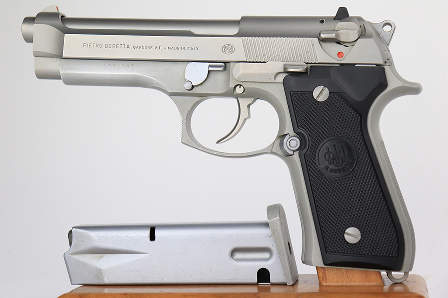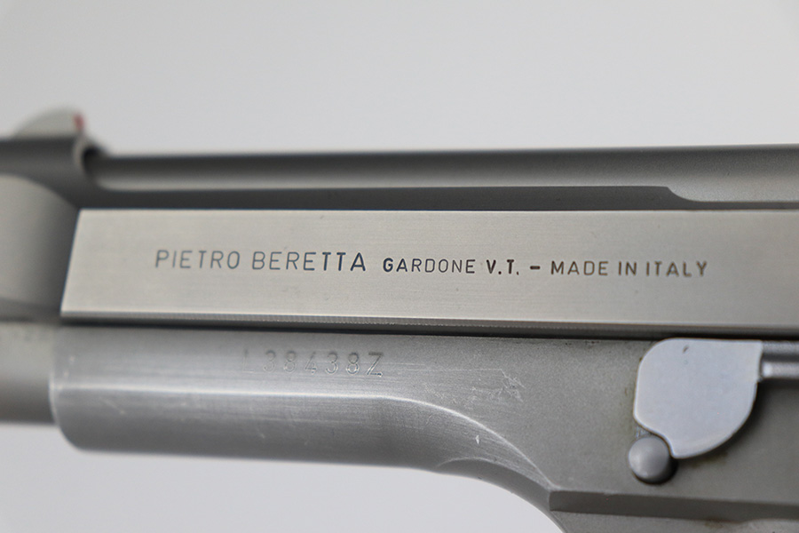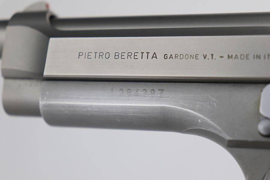 6/1/23 – This is an excellent example of a Beretta Model 92FS manufactured in 1993. It is matching, has the proper Italian proofs, and has a nice matte stainless finish. There is not much sign of wear except for some light scuffs on both sides of the frame and a couple of small areas with very light freckling on the slide. Fitted with excellent black plastic grips. Comes with one proper magazine. Mint bore.