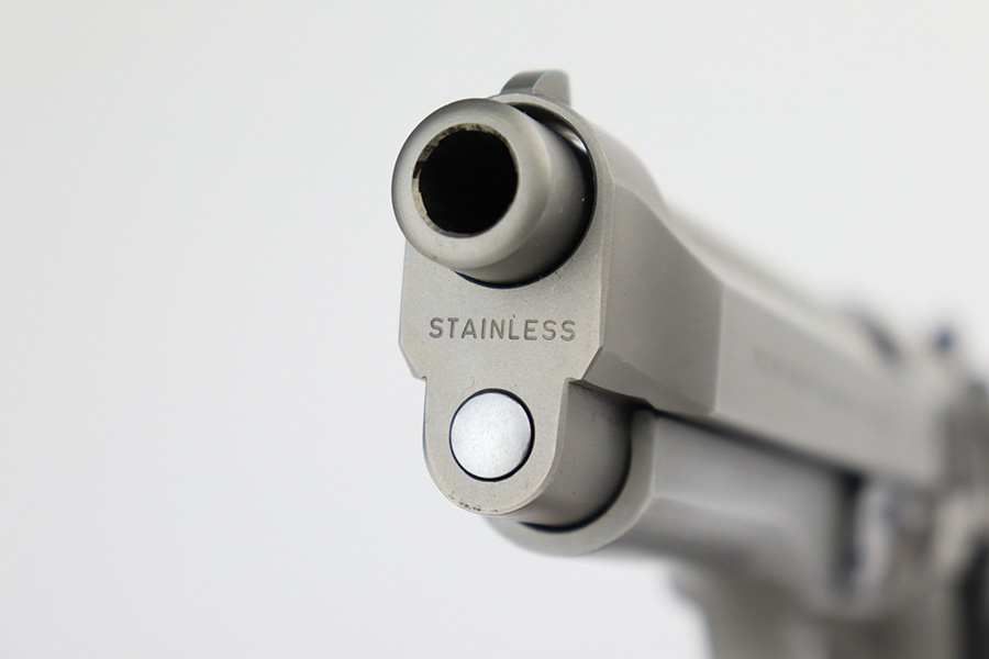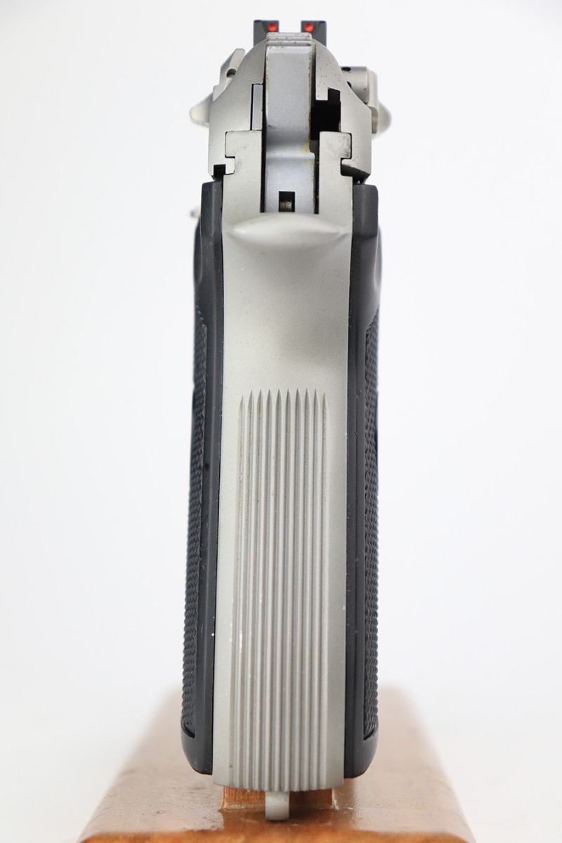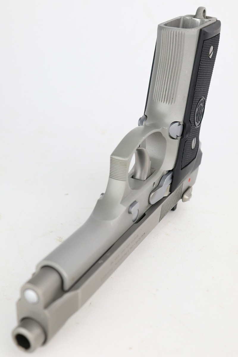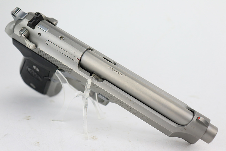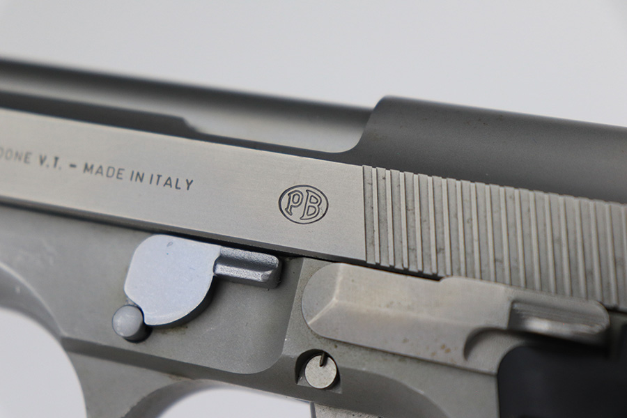 6/1/23 – This is an excellent example of a Beretta Model 92FS manufactured in 1993. It is matching, has the proper Italian proofs, and has a nice matte stainless finish. There is not much sign of wear except for some light scuffs on both sides of the frame and a couple of small areas with very light freckling on the slide. Fitted with excellent black plastic grips. Comes with one proper magazine. Mint bore.