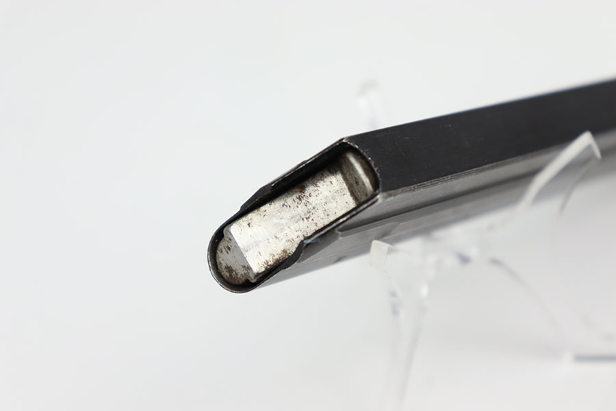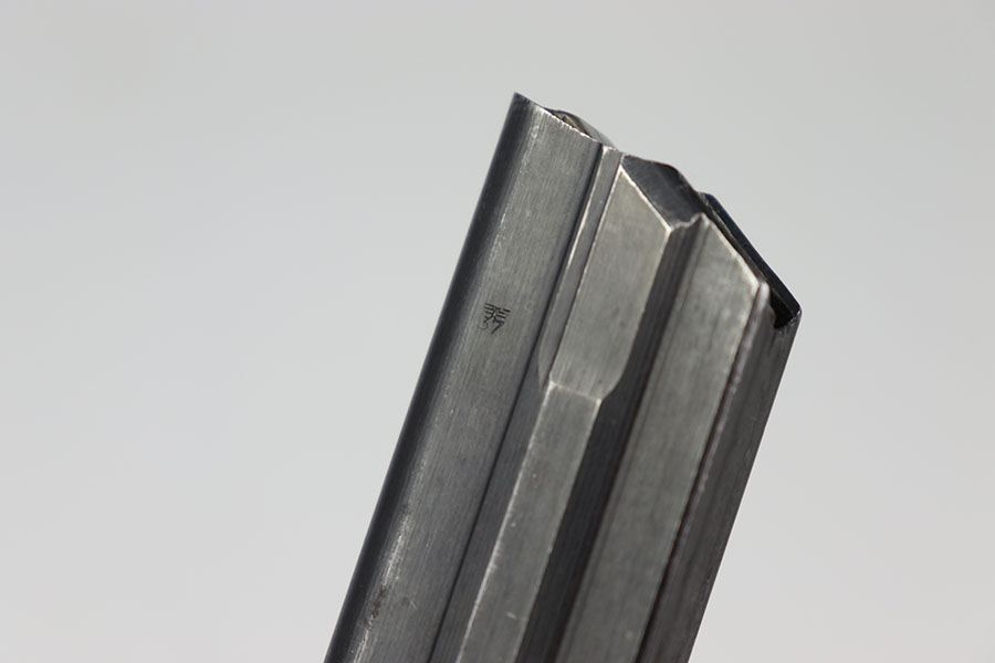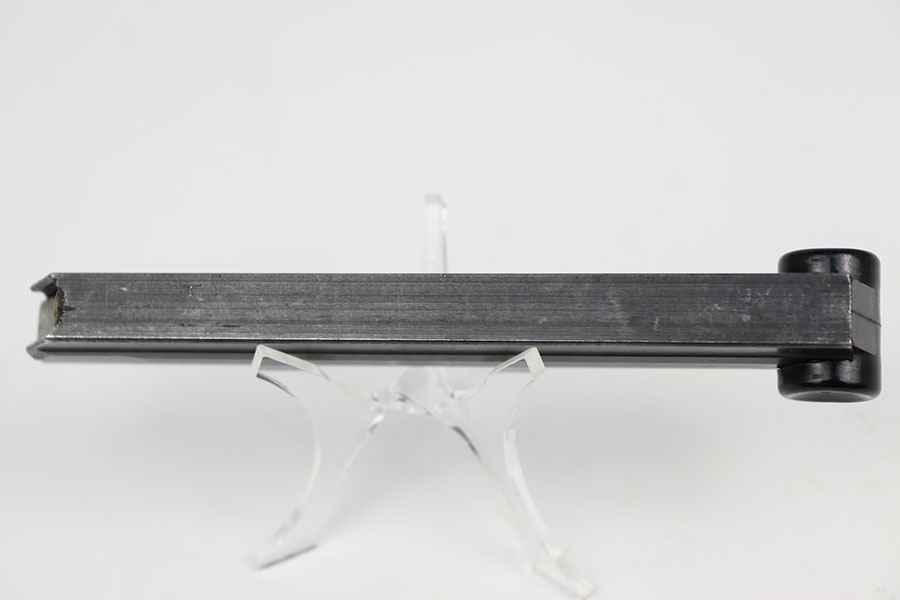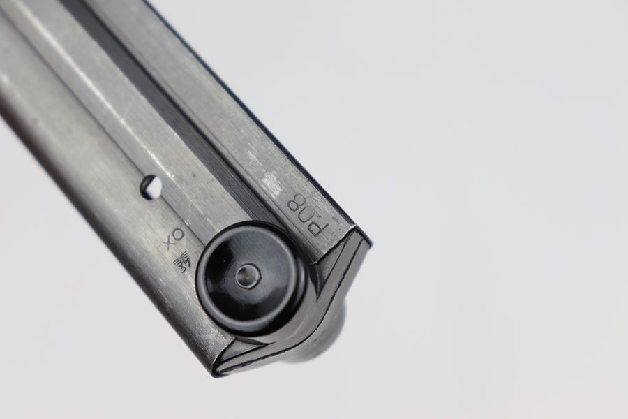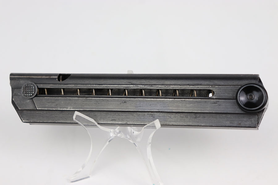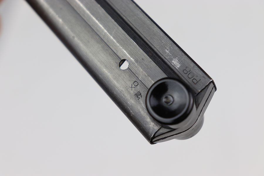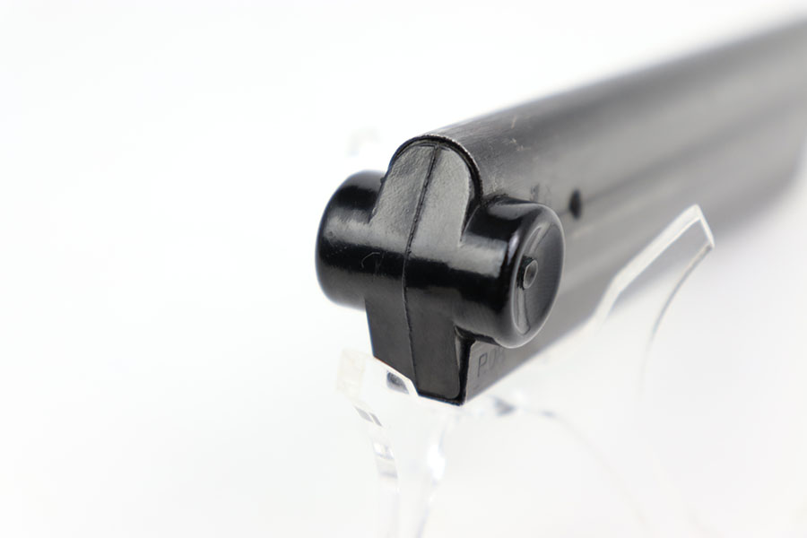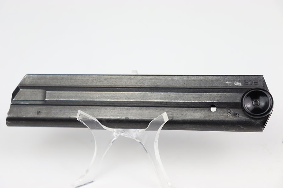 8/31/24 – This is an original WW2 FXO Luger magazine with a black bakelite base. These are commonly paired with and referred to as Black Widow Luger magazines. The magazine is in excellent+ condition with only minor signs of wear, mainly on the front edge of the tube. The left side of the tube is “fxo” maker stamped by Haenel with two eagle/37 proof stamps. The base is very clean with no cracks, chips, or markings. The spring is strong and fully functional.
