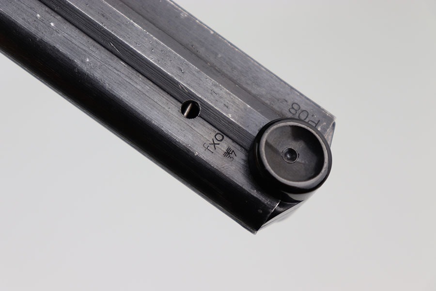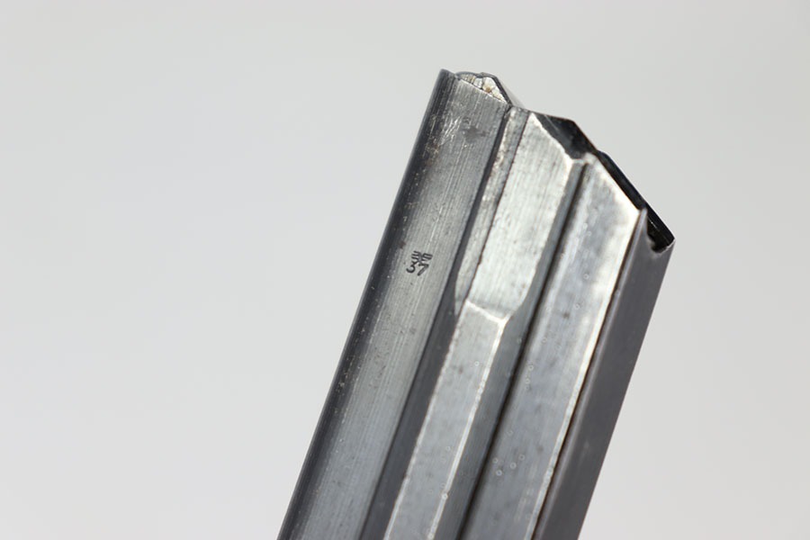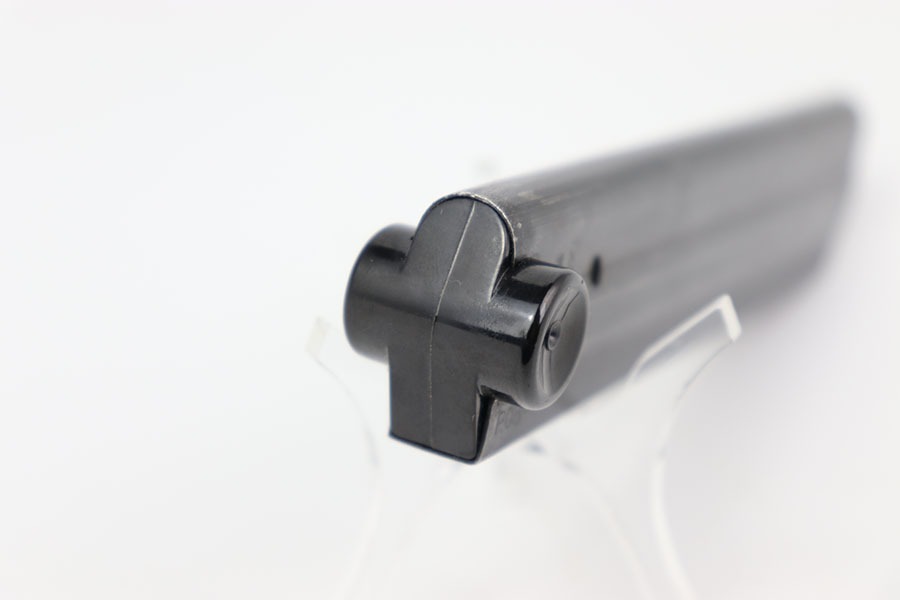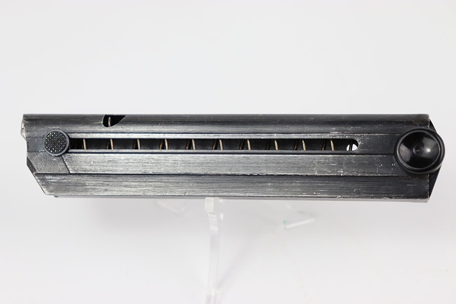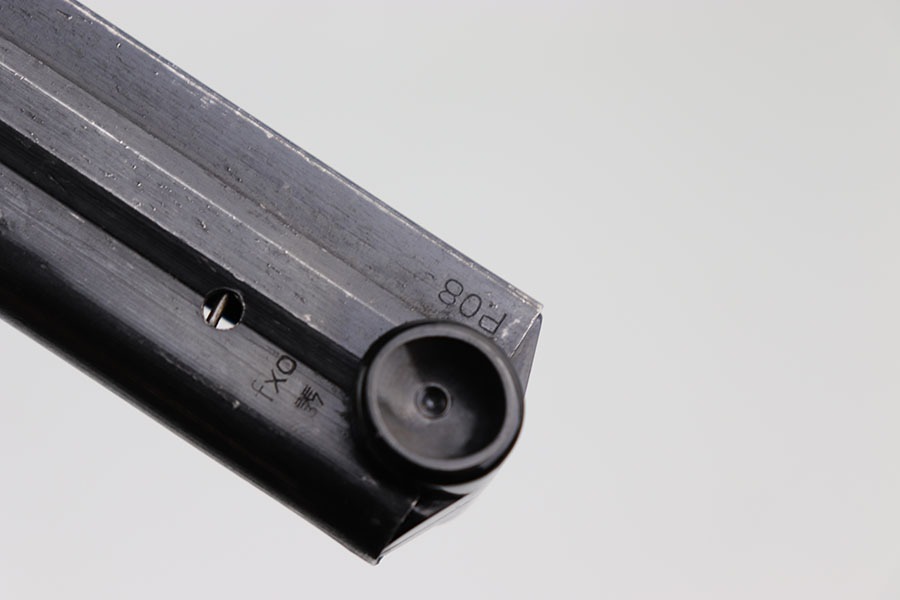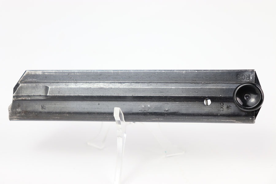10/23/24 – This is an original WW2 FXO Luger magazine with a black bakelite base. These are commonly paired with and referred to as Black Widow Luger magazines. The magazine is in excellent condition with only minor signs of wear, mainly on the spine of the tube. The left side of the tube is “fxo” maker stamped by Haenel with two eagle/37 proof stamps. The base is very clean with no cracks, chips, or markings. The spring is strong and fully functional.