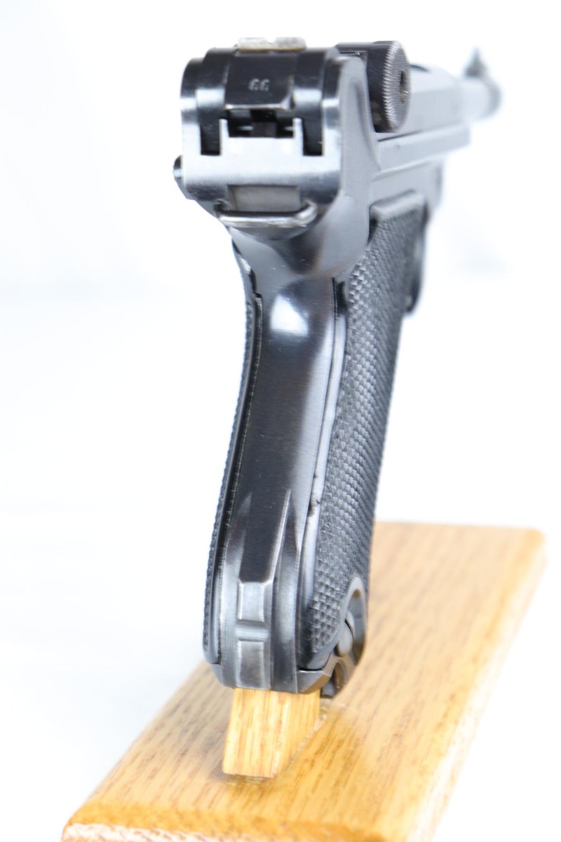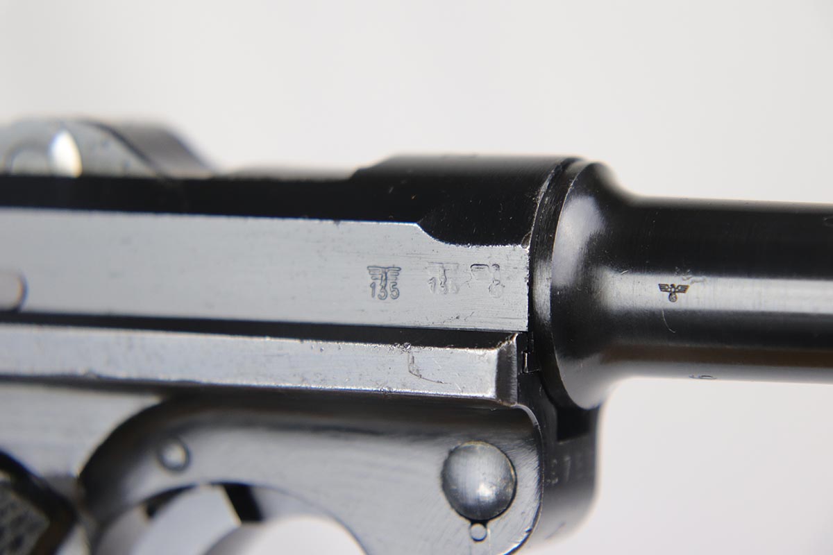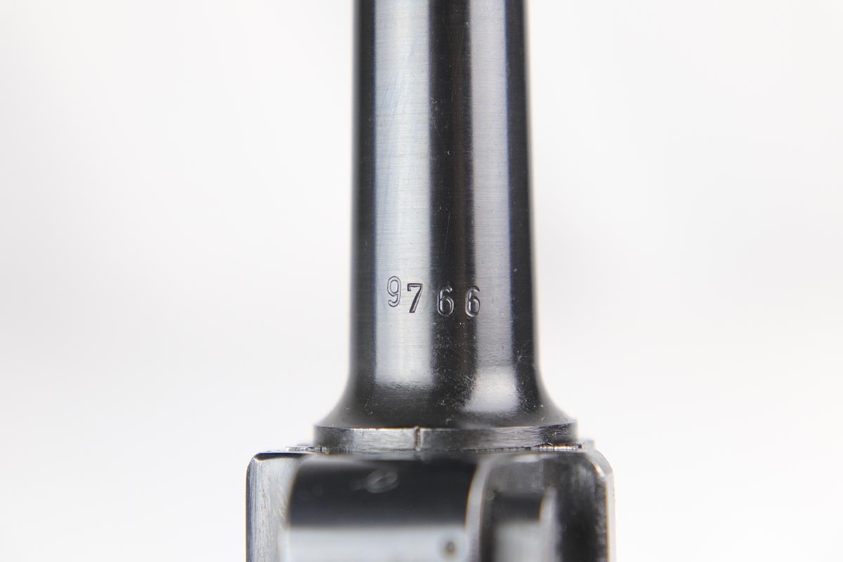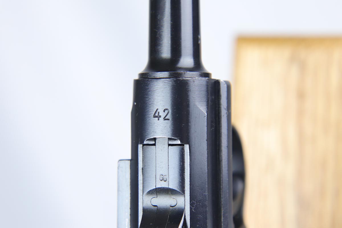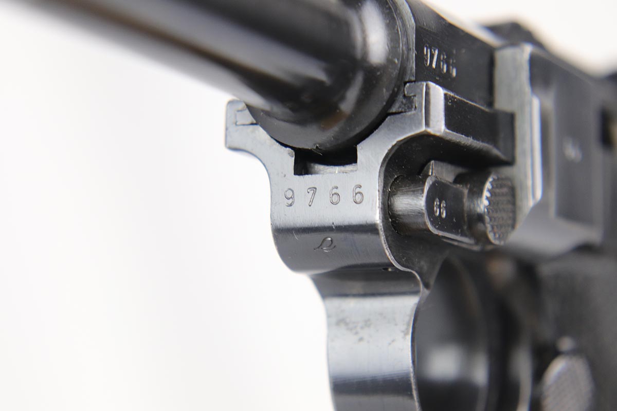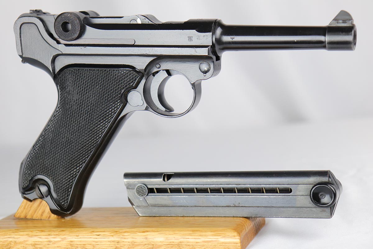 3/12/18 – This is an excellent example of a Black Widow Mauser luger from World War II.  Issued to the Nazi army in 1942, this pistol is all matching and original with 97-98% blue remaining.  The finish loss can be seen on the side plate and on the bottom of the front strap.  All matching numbered parts.  Original Black Widow style grips and magazine.  Excellent bore.