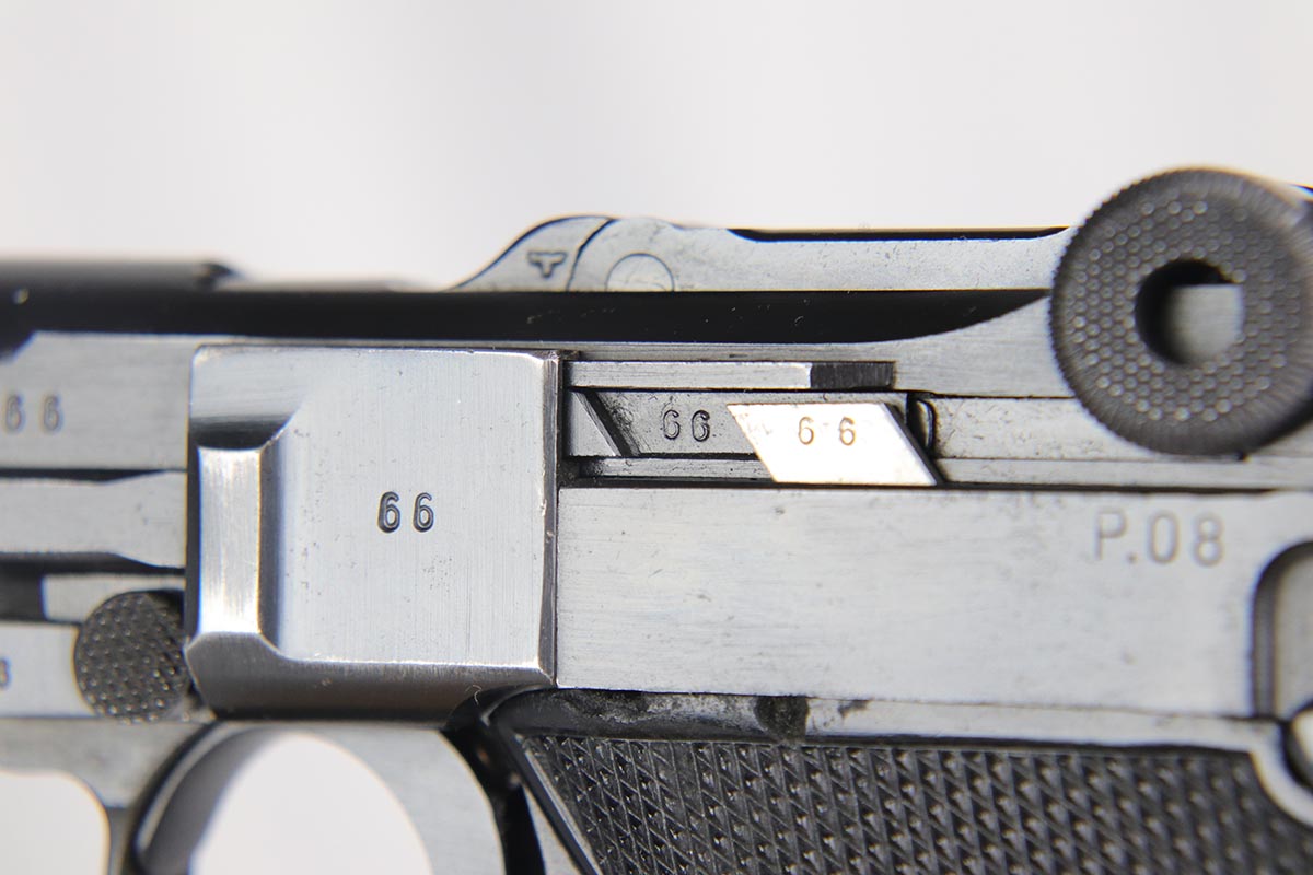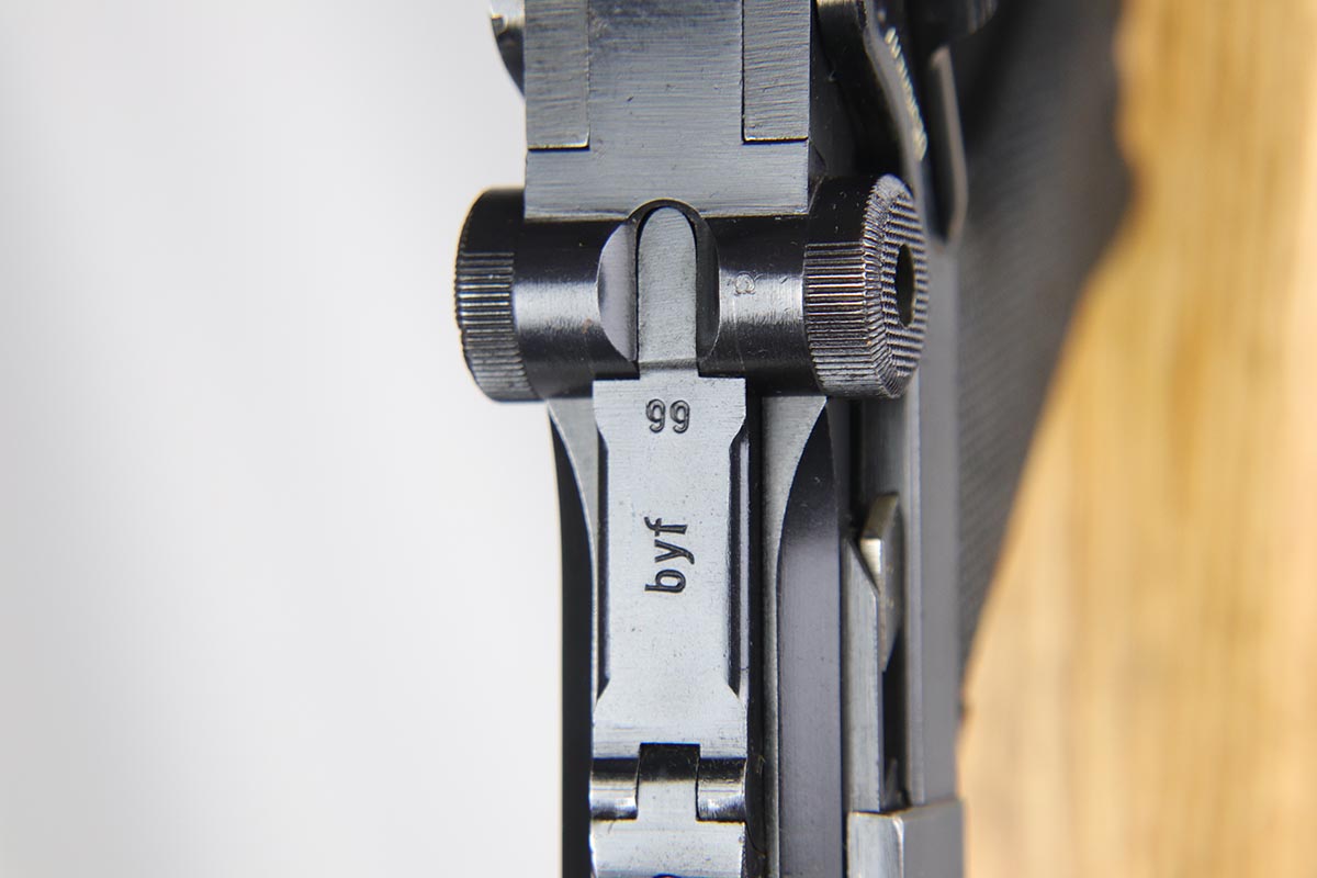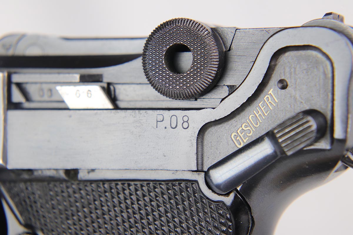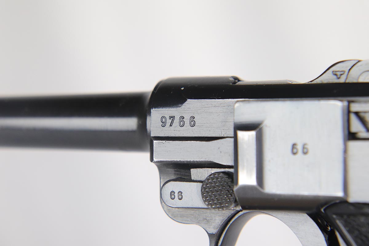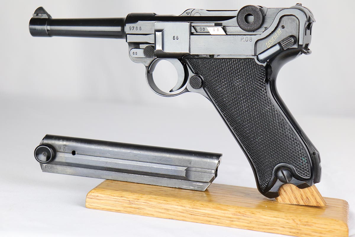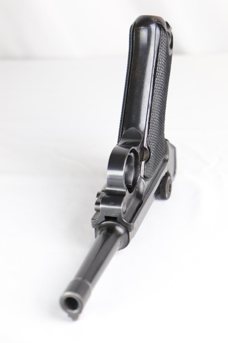 3/12/18 – This is an excellent example of a Black Widow Mauser luger from World War II.  Issued to the Nazi army in 1942, this pistol is all matching and original with 97-98% blue remaining.  The finish loss can be seen on the side plate and on the bottom of the front strap.  All matching numbered parts.  Original Black Widow style grips and magazine.  Excellent bore.