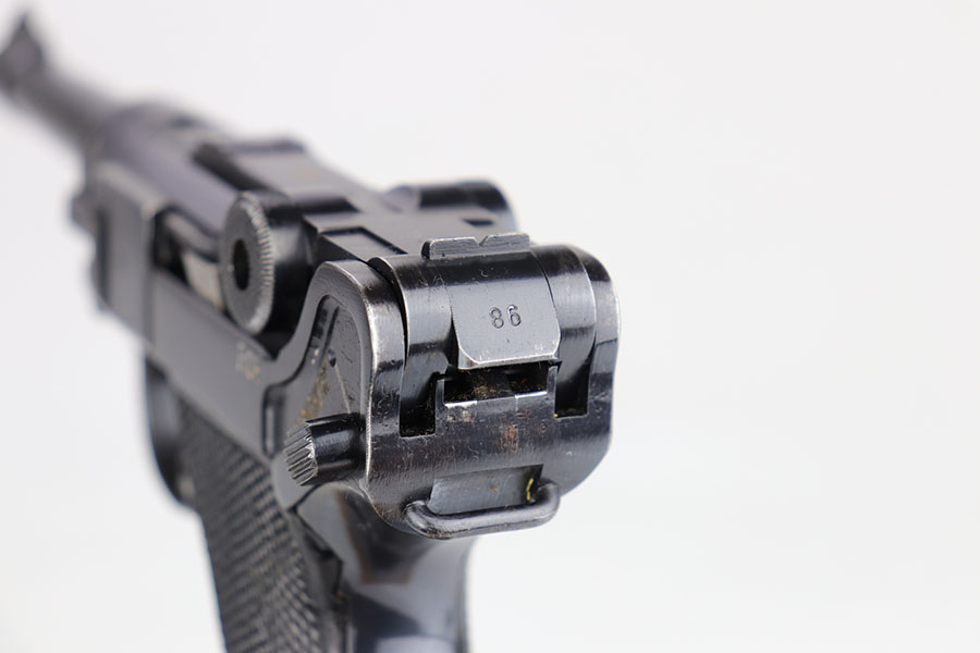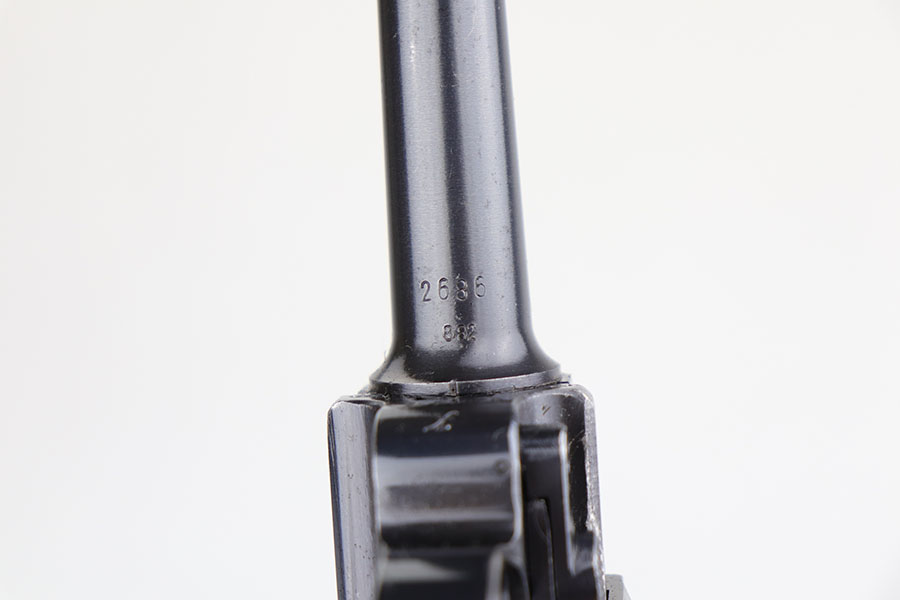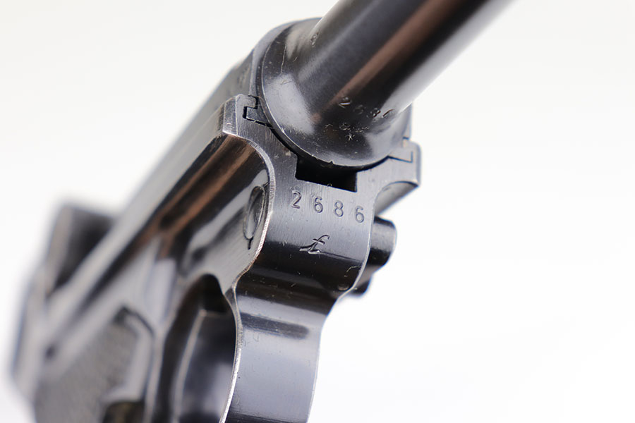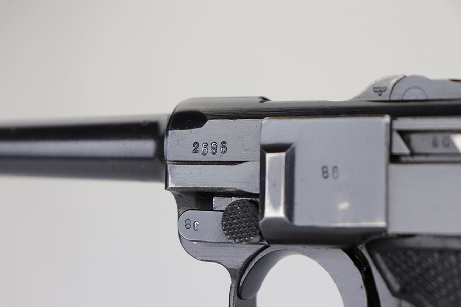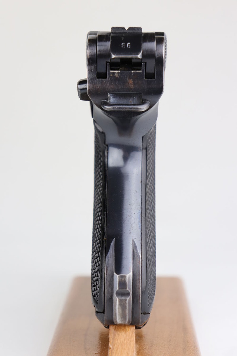 4/3/20 – This is a matching and original Black Widow Mauser Luger in excellent condition. It has about 95% of the original blue with standard high edge wear in the common places, and a bit of finish loss on the front strap. Minty bore and excellent magazine. Original Black Widow grips, with some obvious smoothing/handling wear on the left panel.