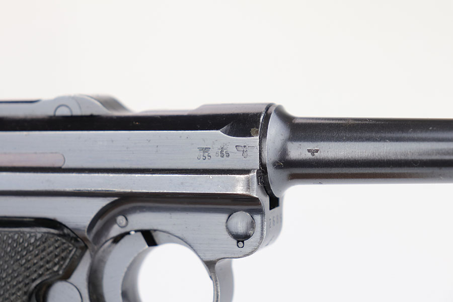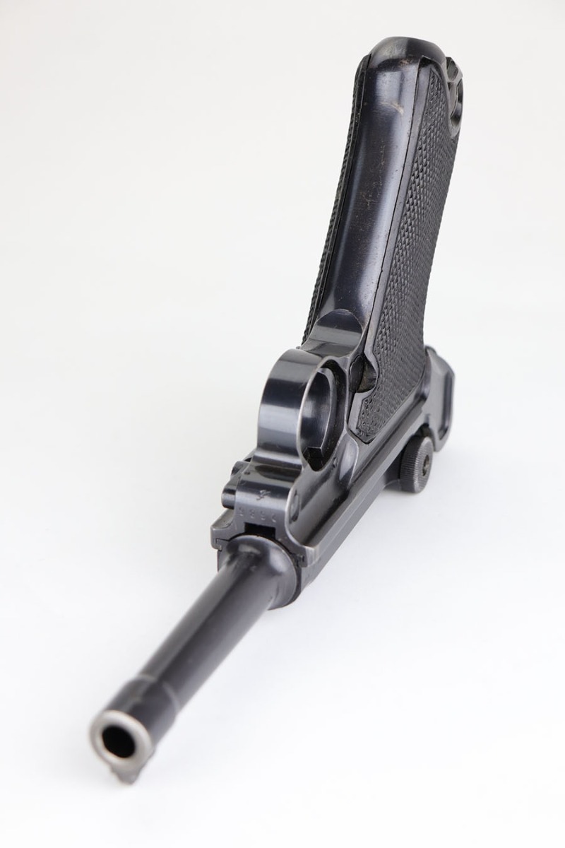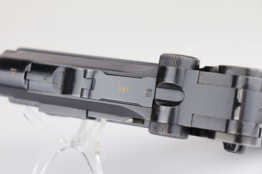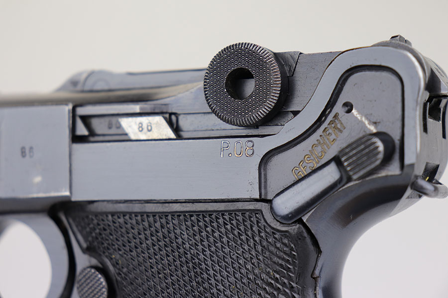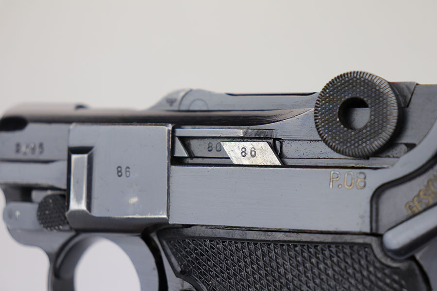 4/3/20 – This is a matching and original Black Widow Mauser Luger in excellent condition. It has about 95% of the original blue with standard high edge wear in the common places, and a bit of finish loss on the front strap. Minty bore and excellent magazine. Original Black Widow grips, with some obvious smoothing/handling wear on the left panel.