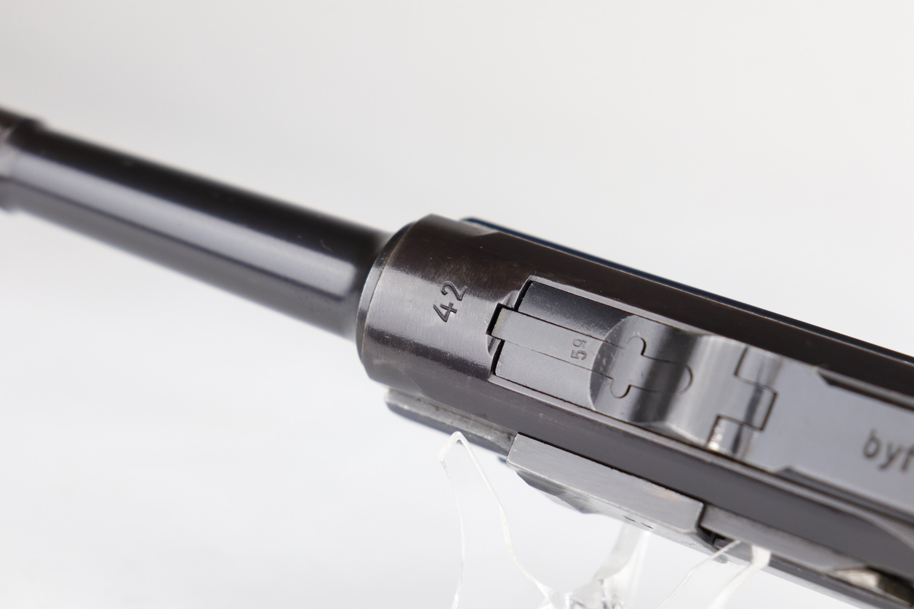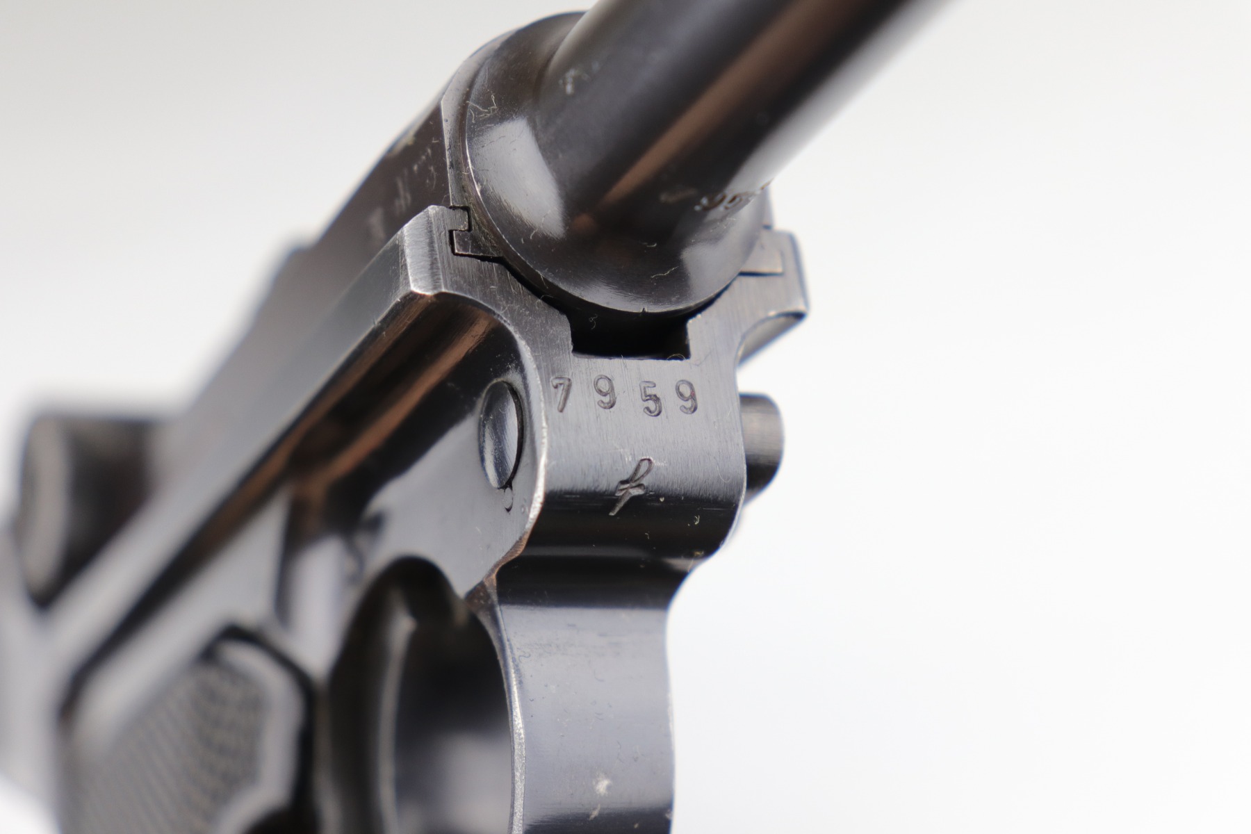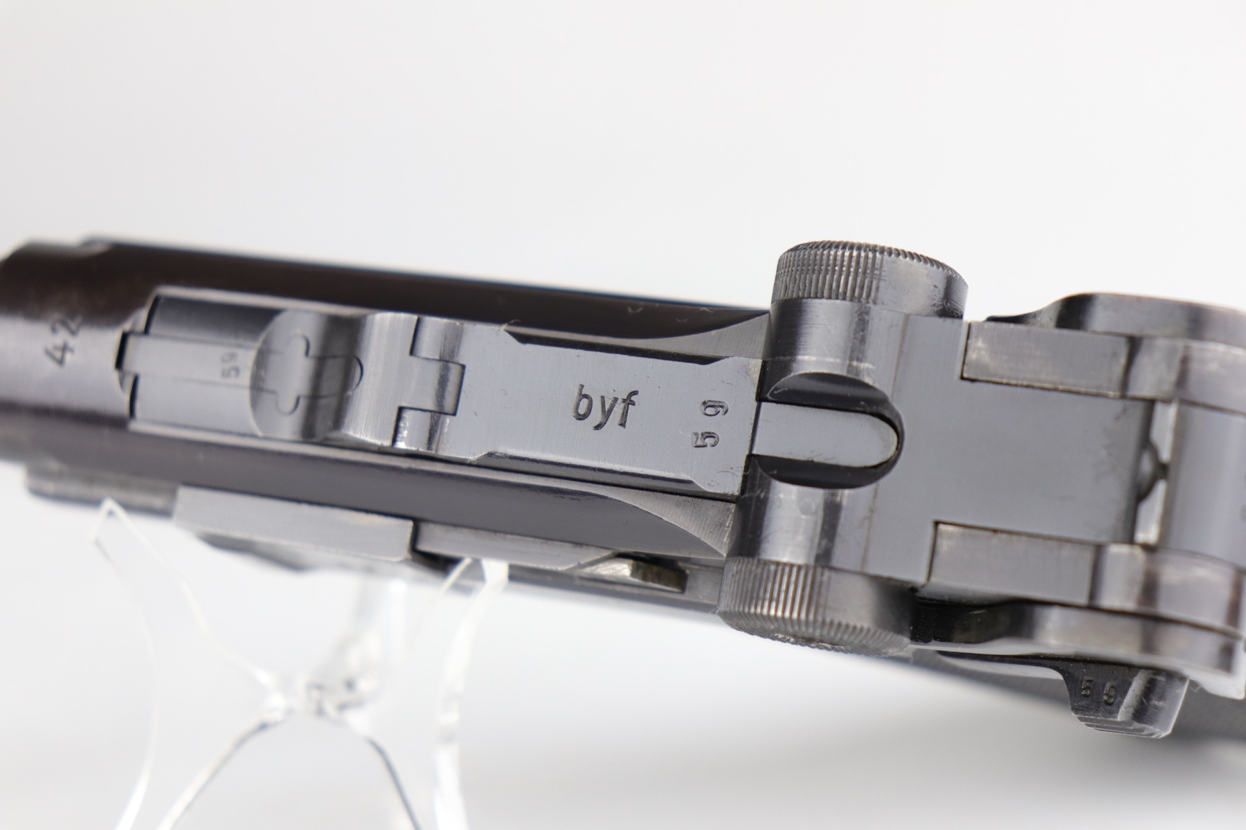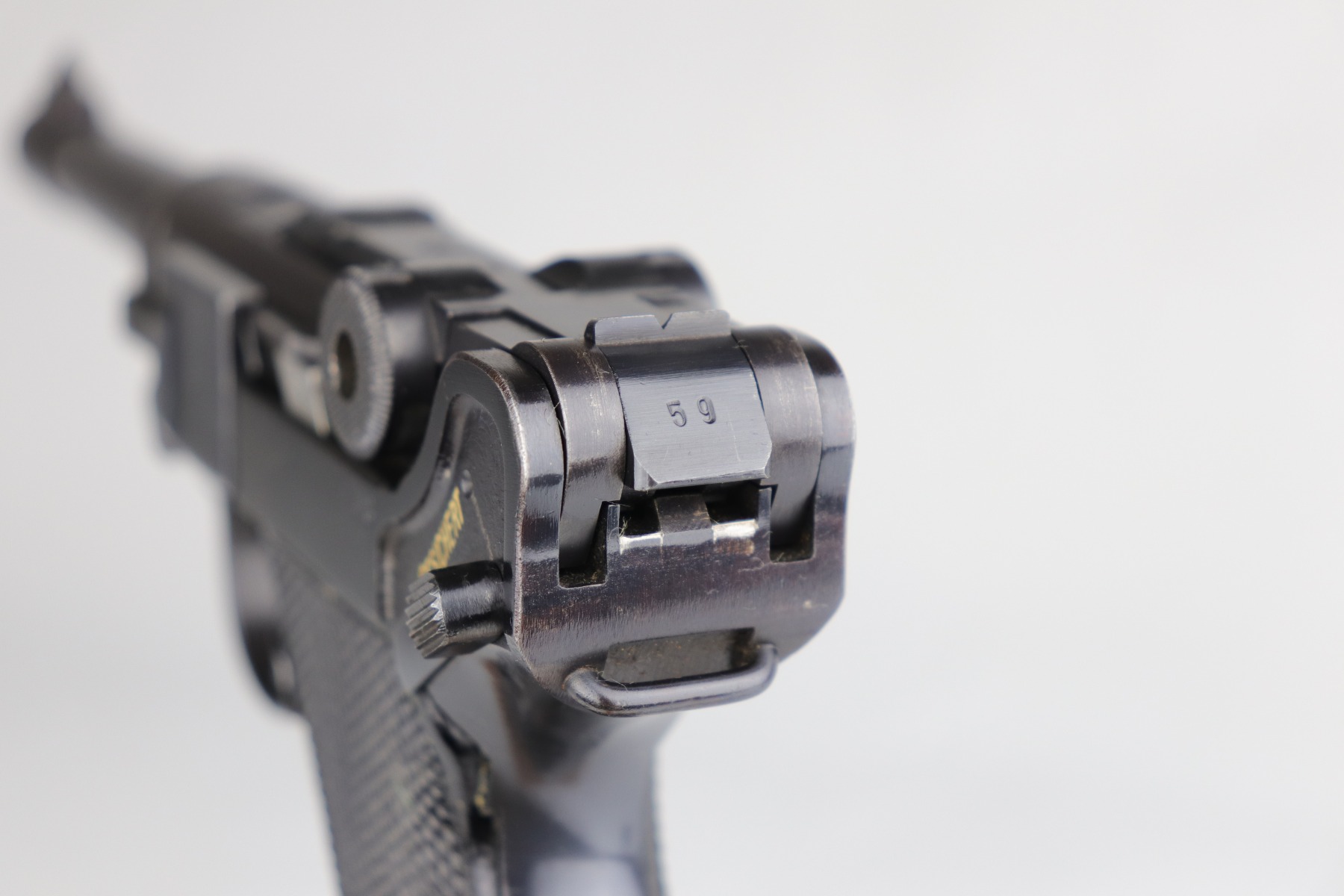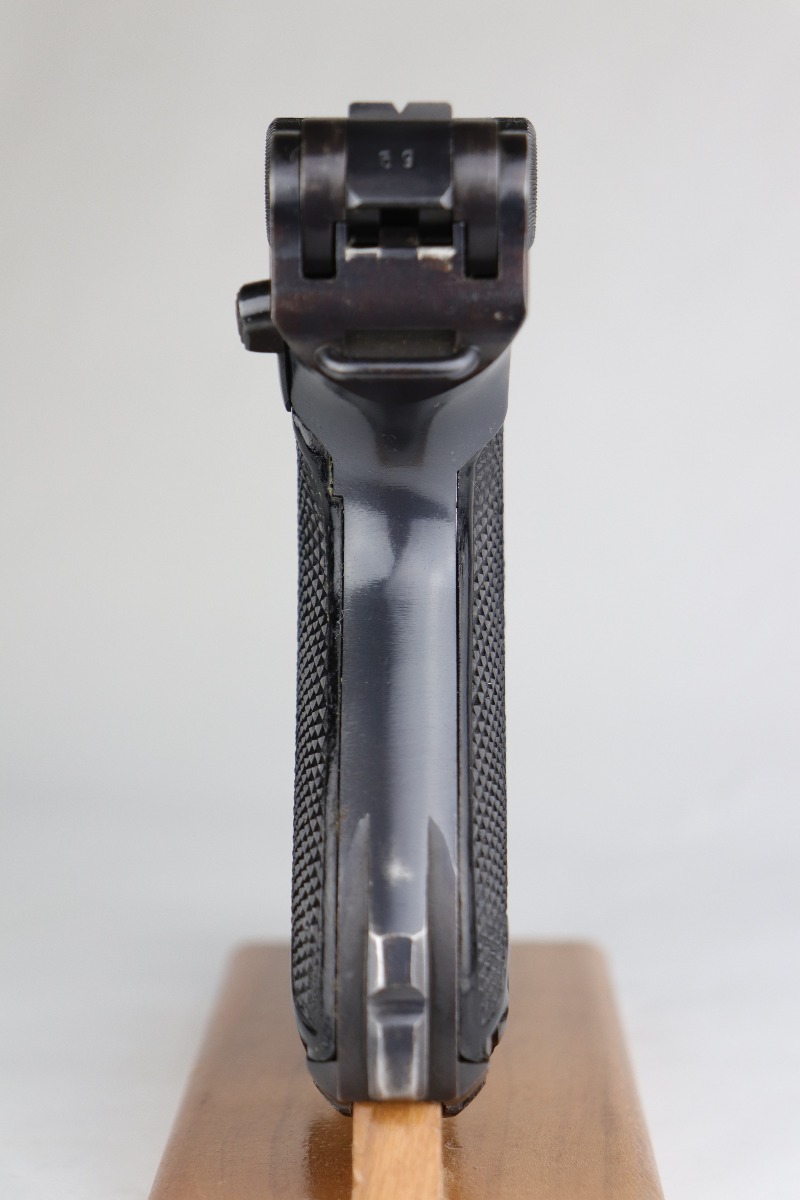7/21/20 – This is a Mauser-made byf 42 luger, nicknamed the Black Widow due to its black grips and black plastic bottom on the magazine.  This one is all correct and matching.  The original finish on this pistol rates at about 96-97%, with very minor wear near the muzzle, one small spot on the right side of the frame, and two very small spots on the straps near the butt.  Correct fxo magazine. Bore is shiny with strong rifling.