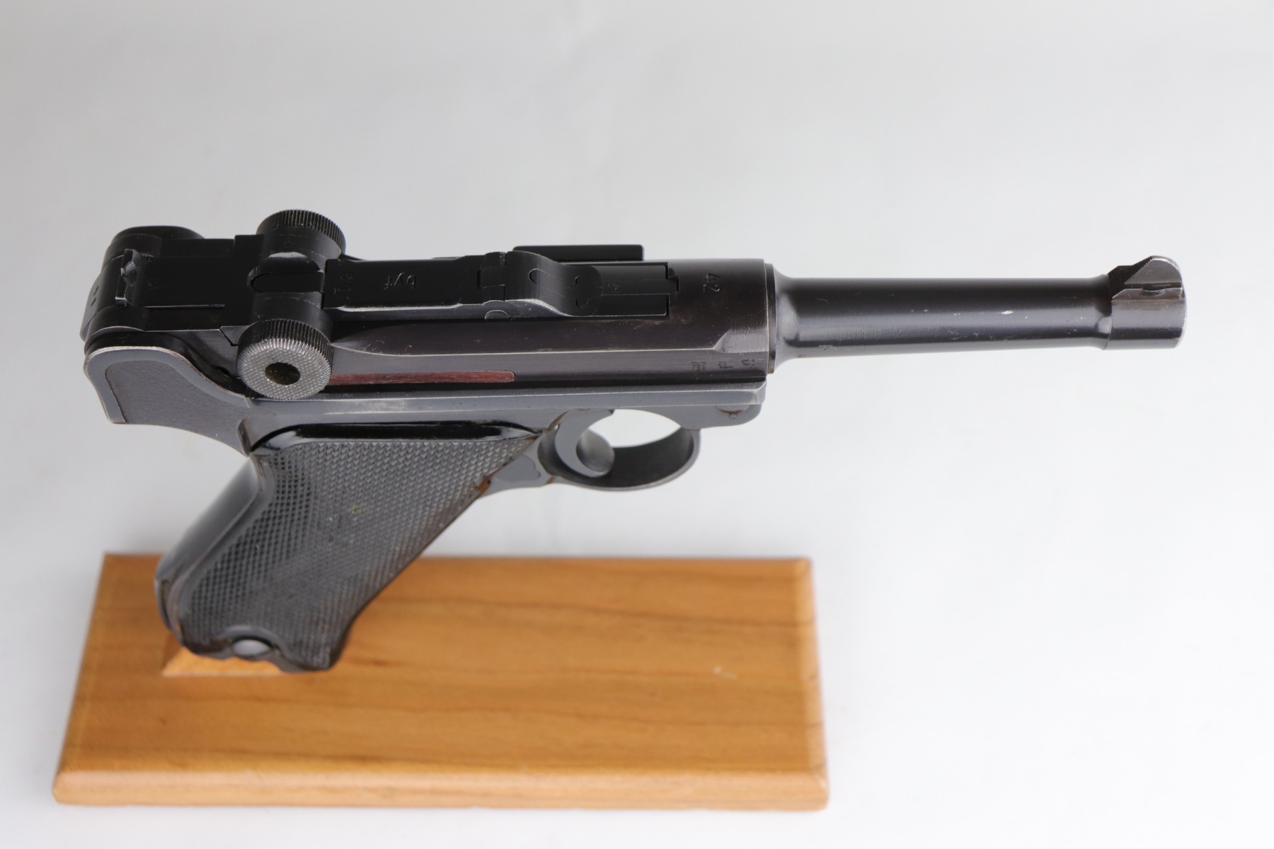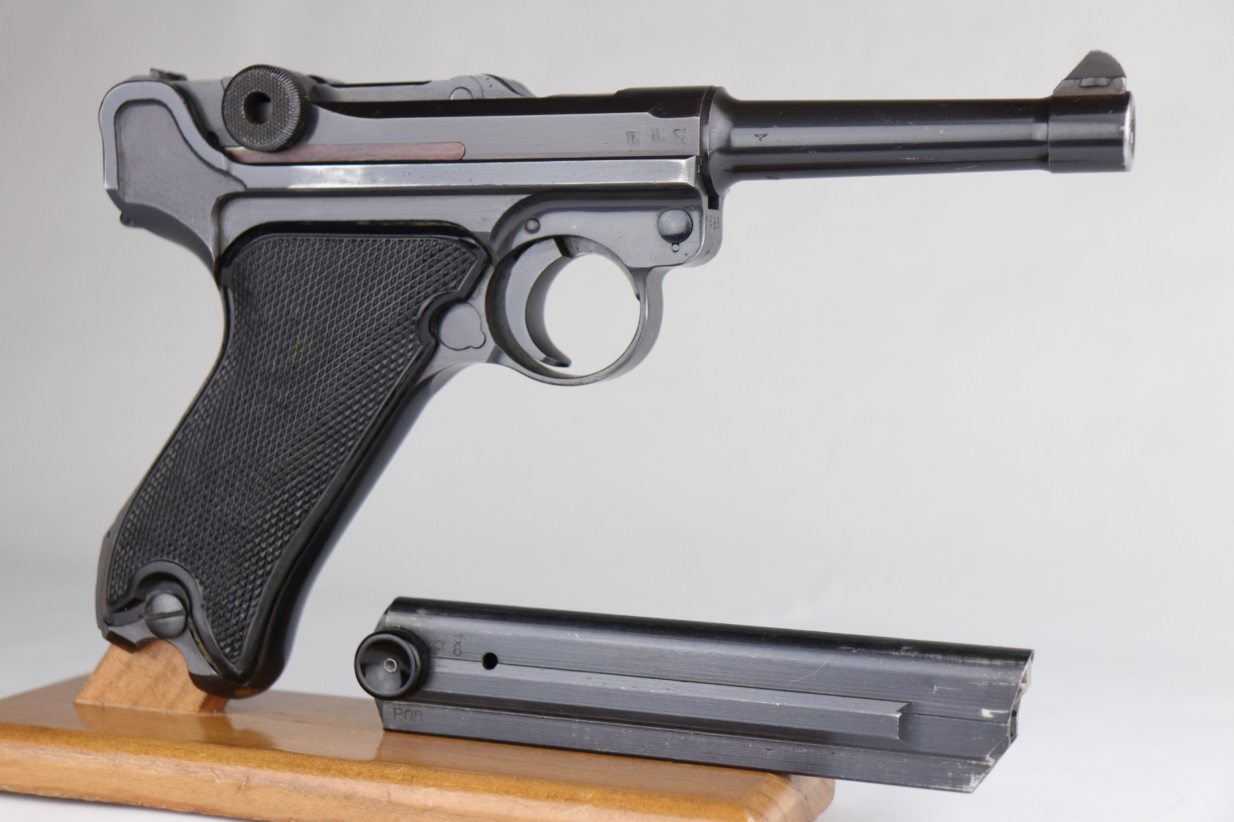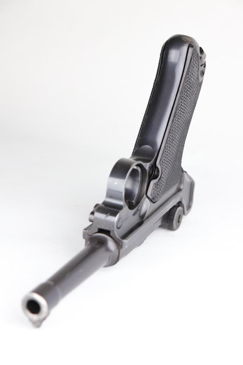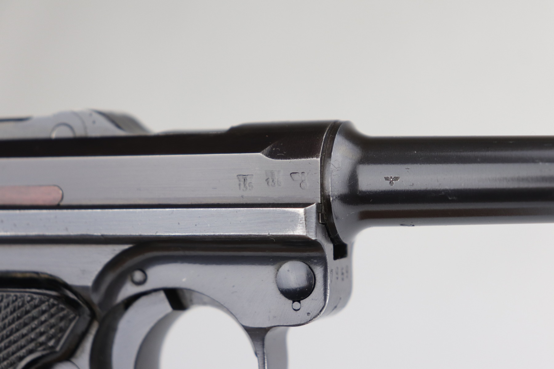 7/21/20 – This is a Mauser-made byf 42 luger, nicknamed the Black Widow due to its black grips and black plastic bottom on the magazine.  This one is all correct and matching.  The original finish on this pistol rates at about 96-97%, with very minor wear near the muzzle, one small spot on the right side of the frame, and two very small spots on the straps near the butt.  Correct fxo magazine. Bore is shiny with strong rifling.