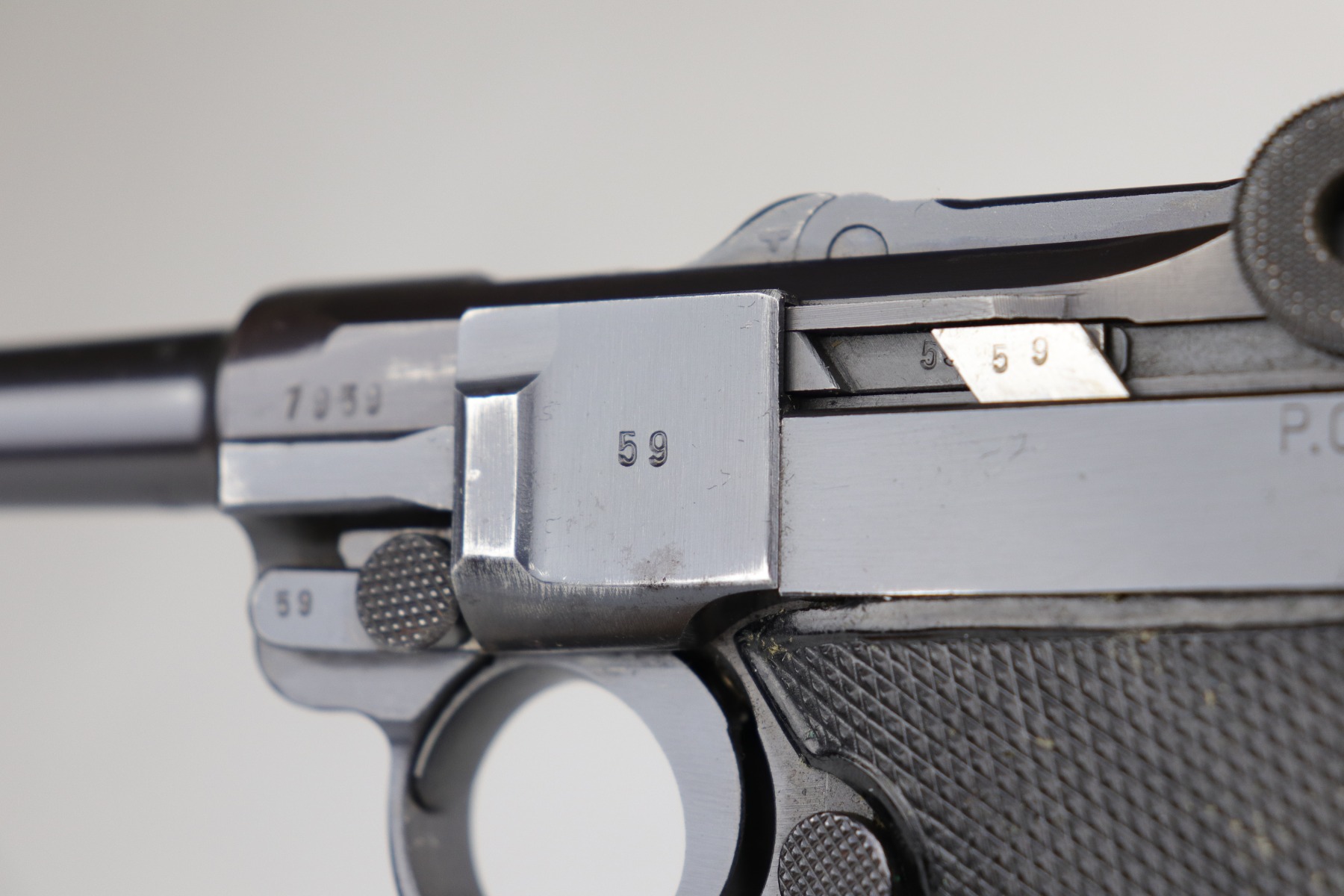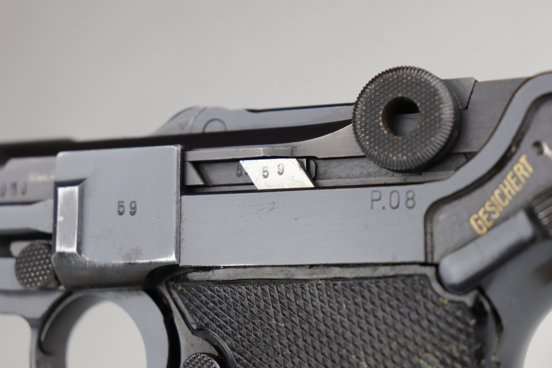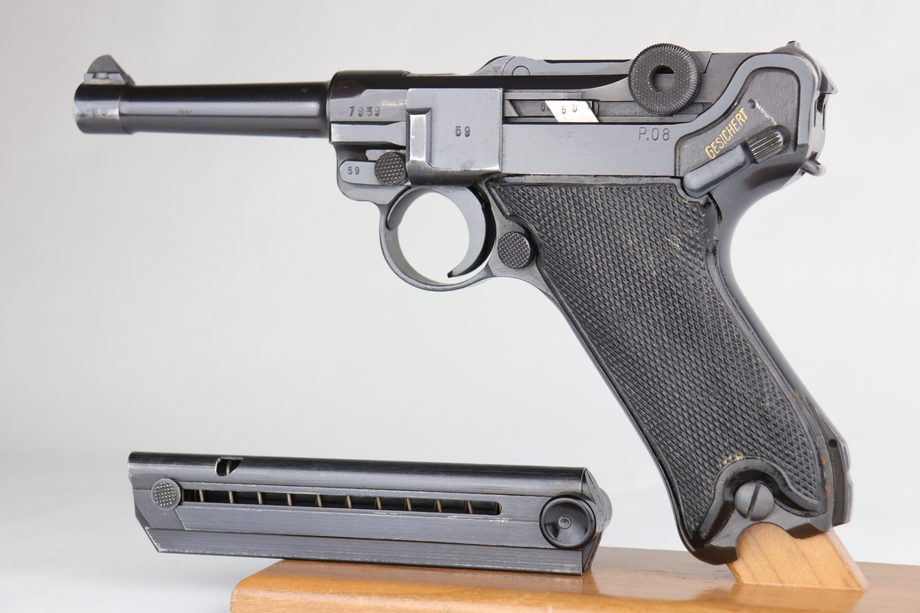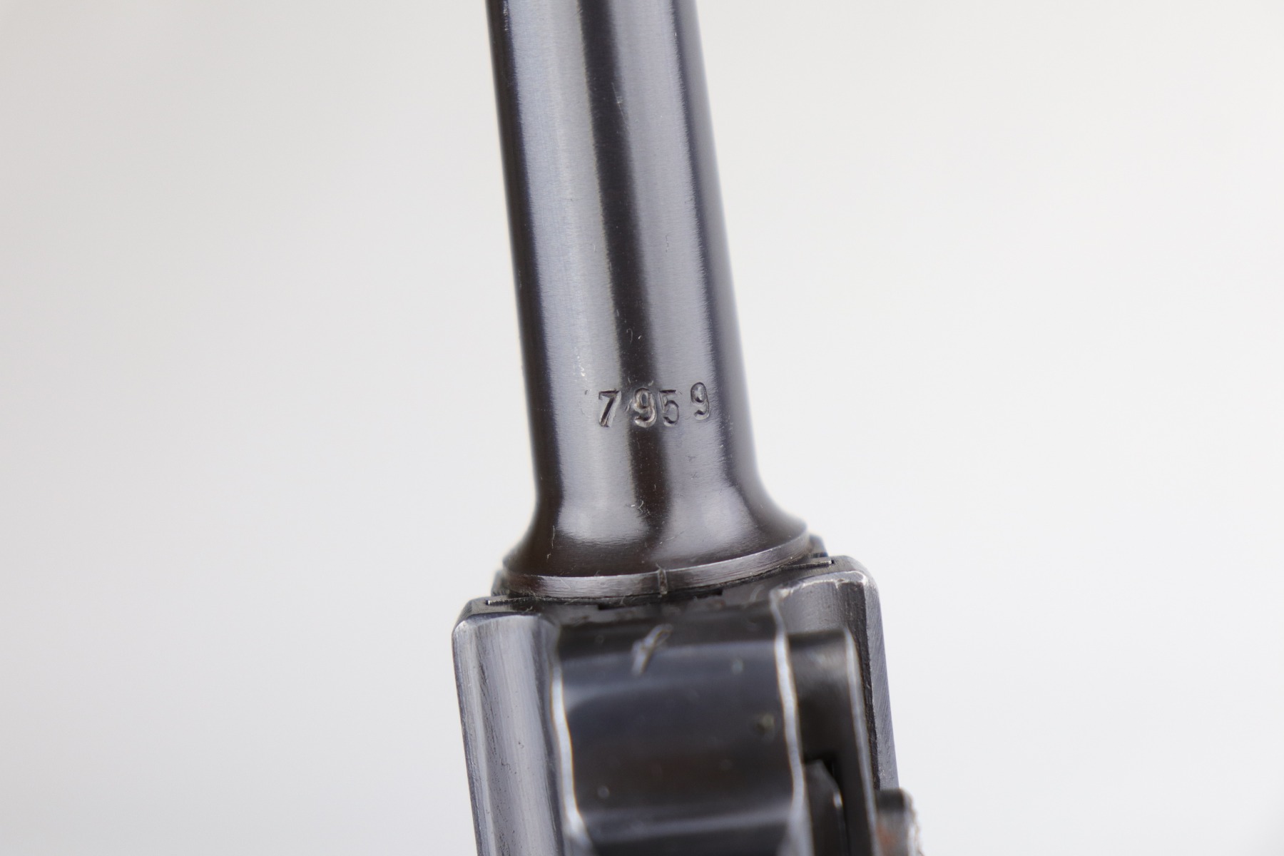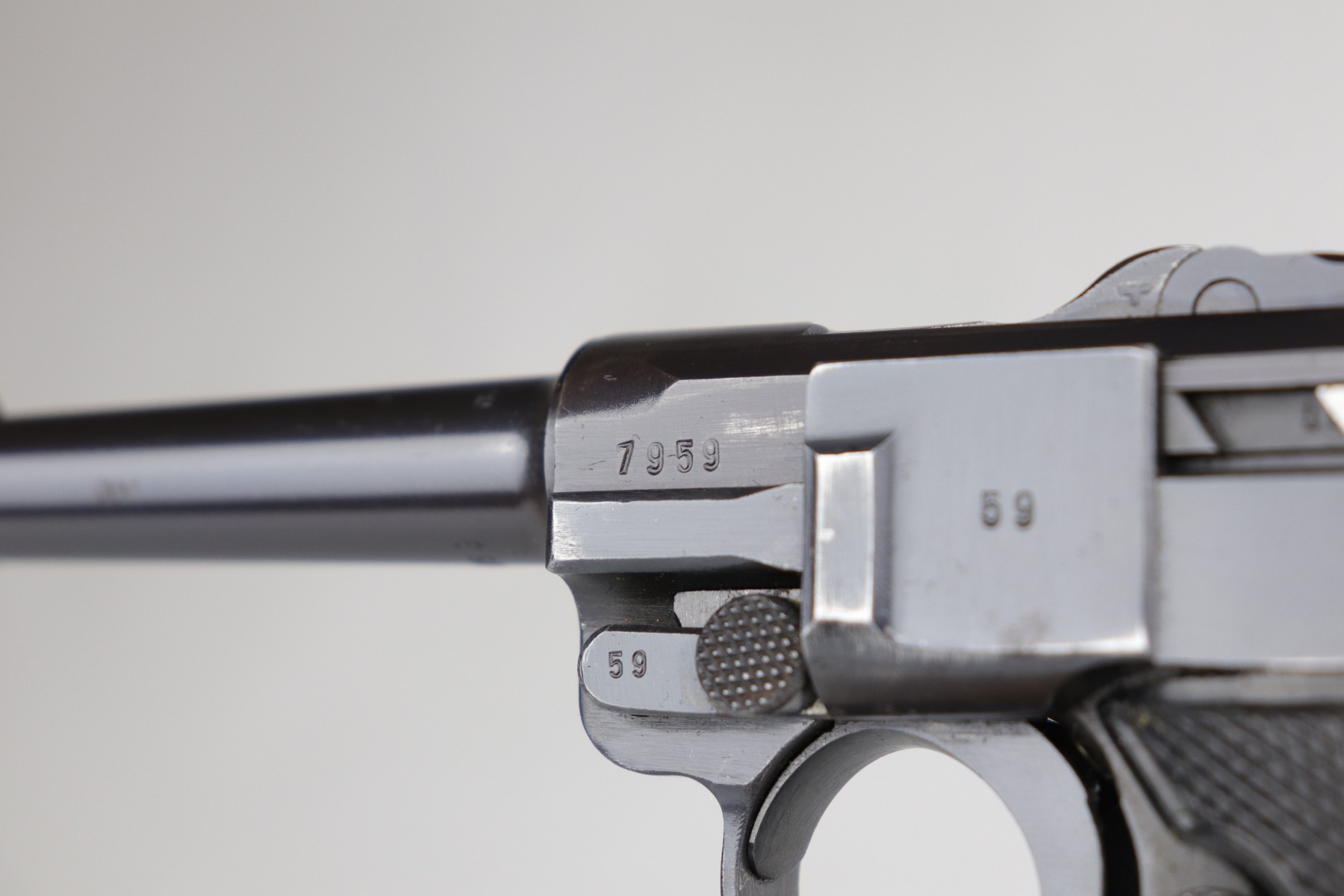 7/21/20 – This is a Mauser-made byf 42 luger, nicknamed the Black Widow due to its black grips and black plastic bottom on the magazine.  This one is all correct and matching.  The original finish on this pistol rates at about 96-97%, with very minor wear near the muzzle, one small spot on the right side of the frame, and two very small spots on the straps near the butt.  Correct fxo magazine. Bore is shiny with strong rifling.