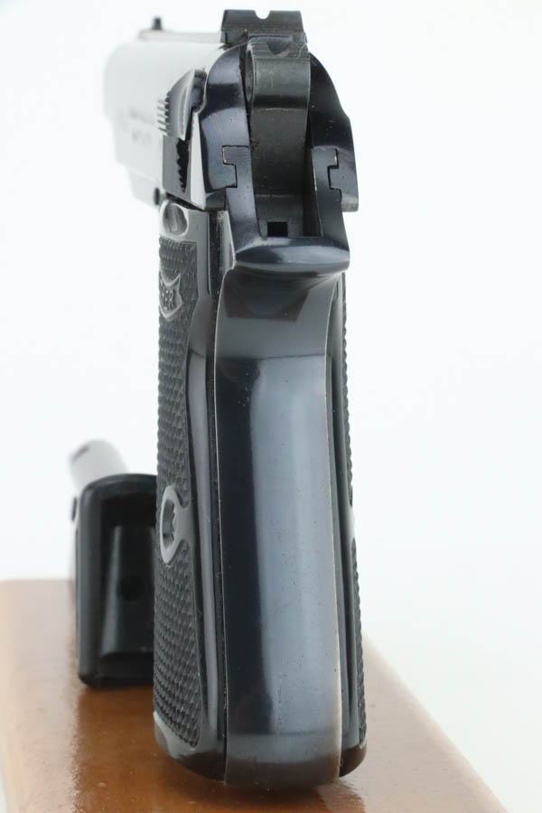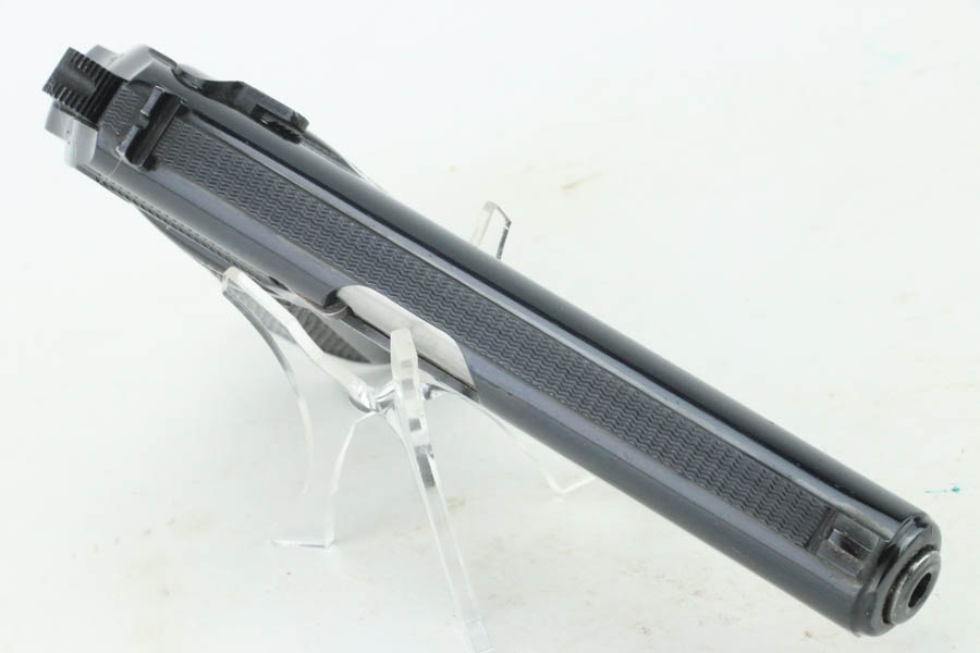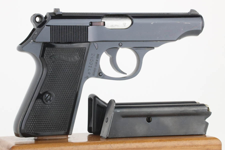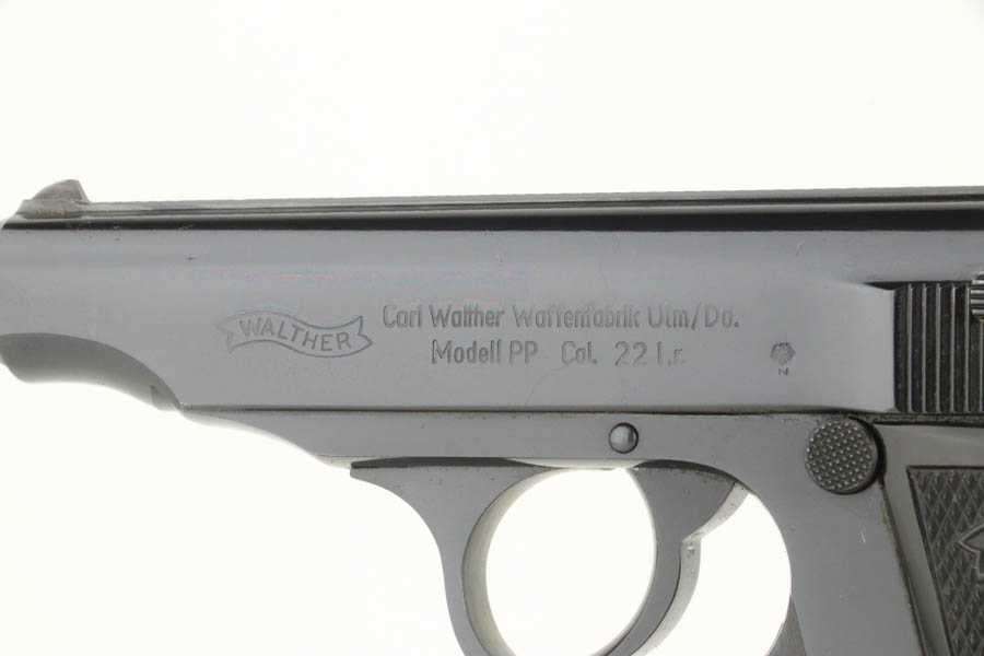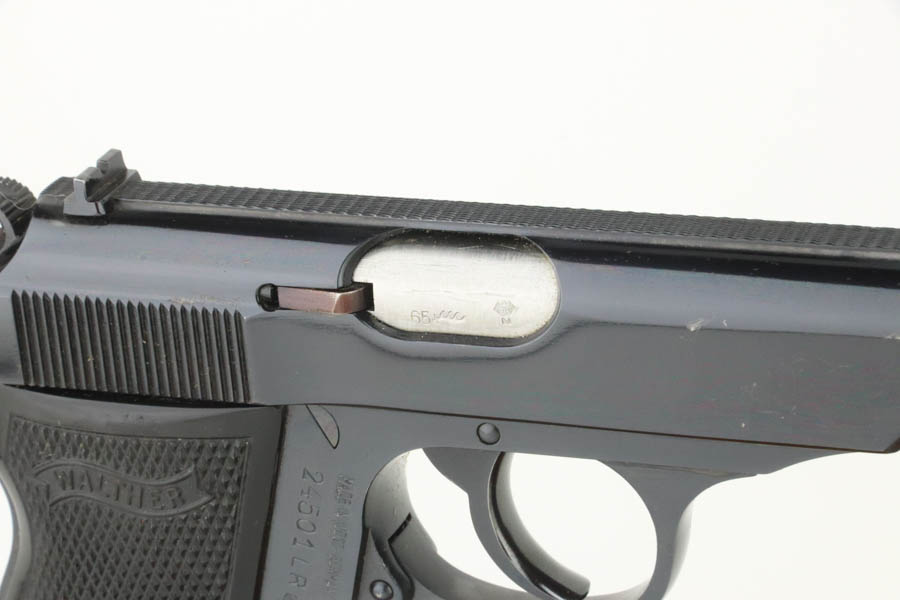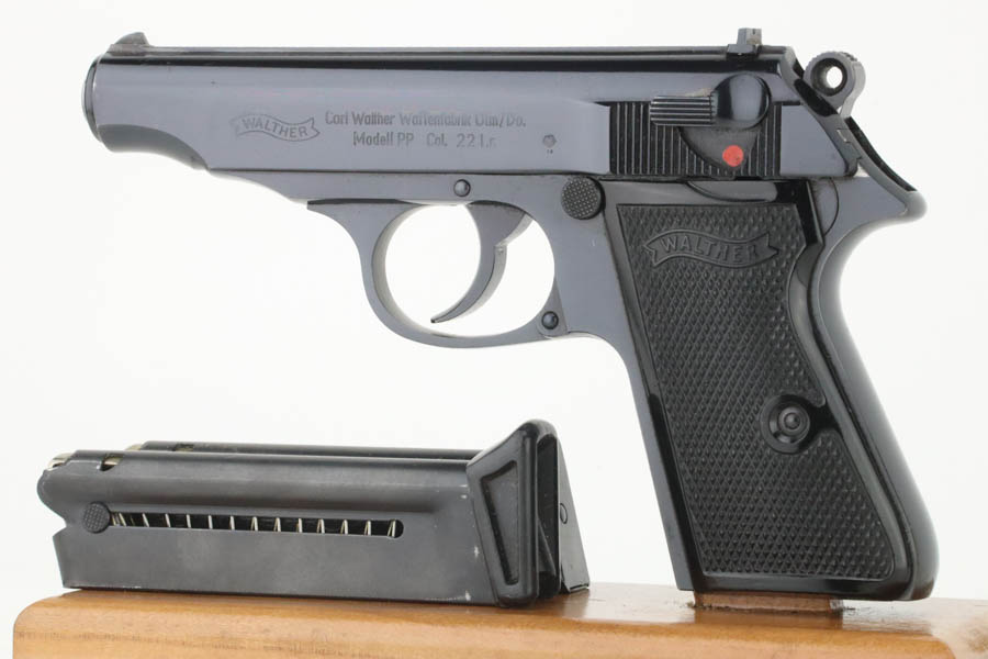 8/20/24 – This is an excellent example of a Walther PP, manufactured in 1965 and chambered in .22 LR. All matching with a “Made in West-Germany” marking on the right side of the frame. No import marks. It comes with its original matching-numbered box, one finger extension magazine, and one flat-bottom magazine. There is almost no actual finish loss, but there are a few scratches on the right side of the slide. Fitted with nice black plastic grips. Minty bore.