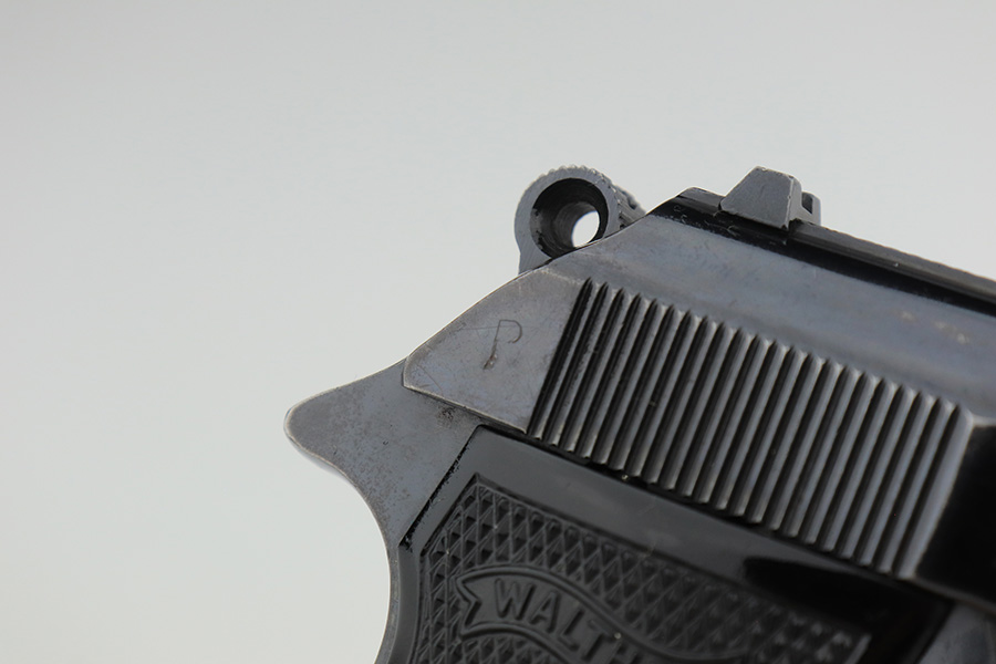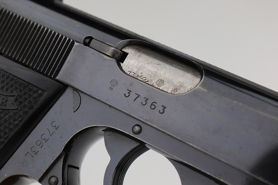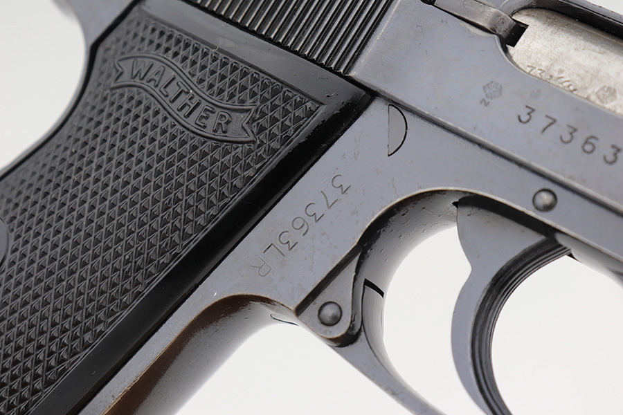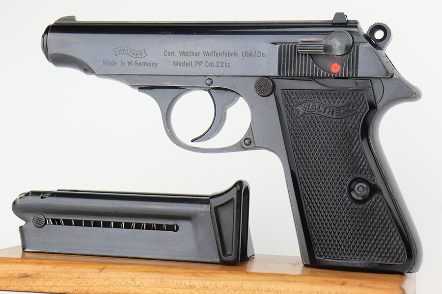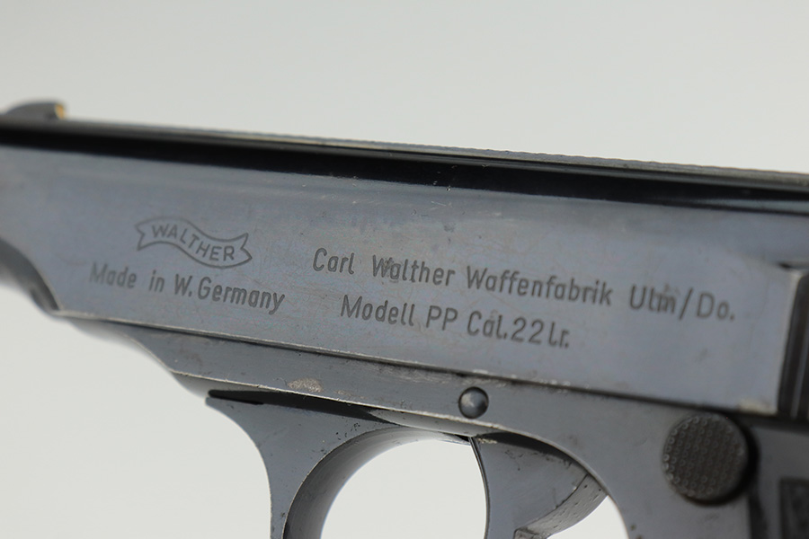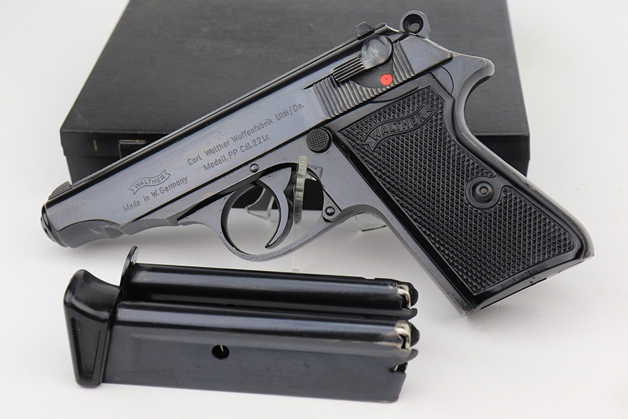 1/23/23 – This is an excellent example of a Walther PP manufactured in 1973 and chambered in .22 LR. It is all matching and has the proper West German proofs. Very faint import mark on the butt of the frame around the magazine well. The gun comes with a period-correct box, one finger extension magazine, and one flat-bottom magazine. Most of the label on the box has torn away, so we cannot tell if it was matching. The gun has retained about 97% of its bluing. There is just very minor wear on some of the high edges and some tiny handling marks here and there. A series of small dings on the back strap. Fitted with very nice black plastic grips. Mint bore.