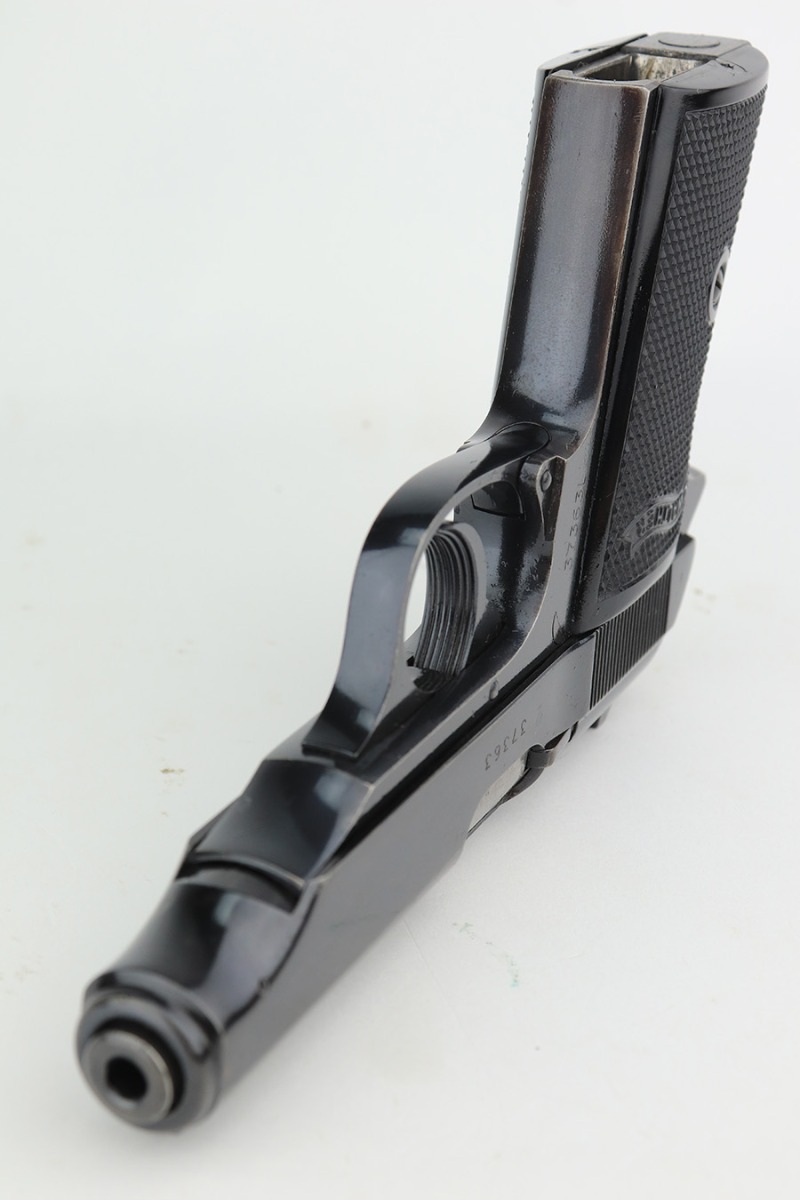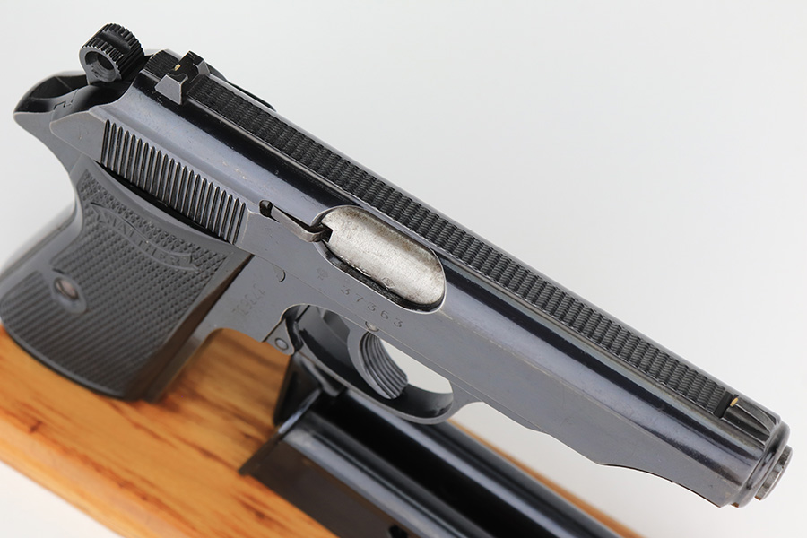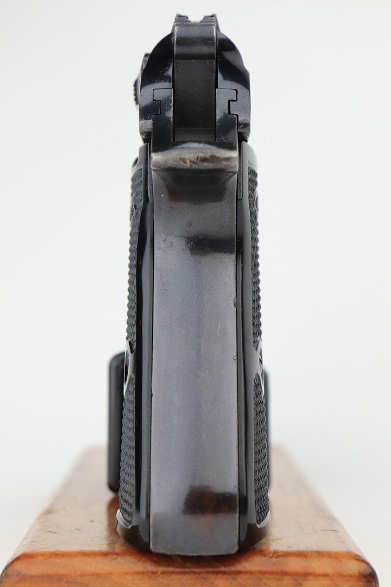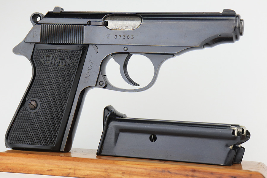 1/23/23 – This is an excellent example of a Walther PP manufactured in 1973 and chambered in .22 LR. It is all matching and has the proper West German proofs. Very faint import mark on the butt of the frame around the magazine well. The gun comes with a period-correct box, one finger extension magazine, and one flat-bottom magazine. Most of the label on the box has torn away, so we cannot tell if it was matching. The gun has retained about 97% of its bluing. There is just very minor wear on some of the high edges and some tiny handling marks here and there. A series of small dings on the back strap. Fitted with very nice black plastic grips. Mint bore.