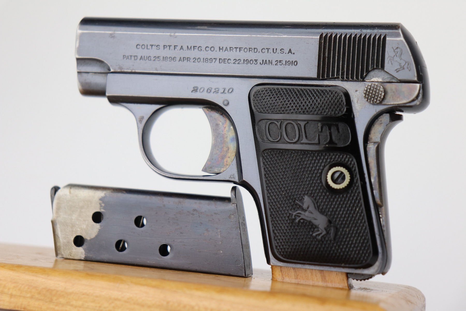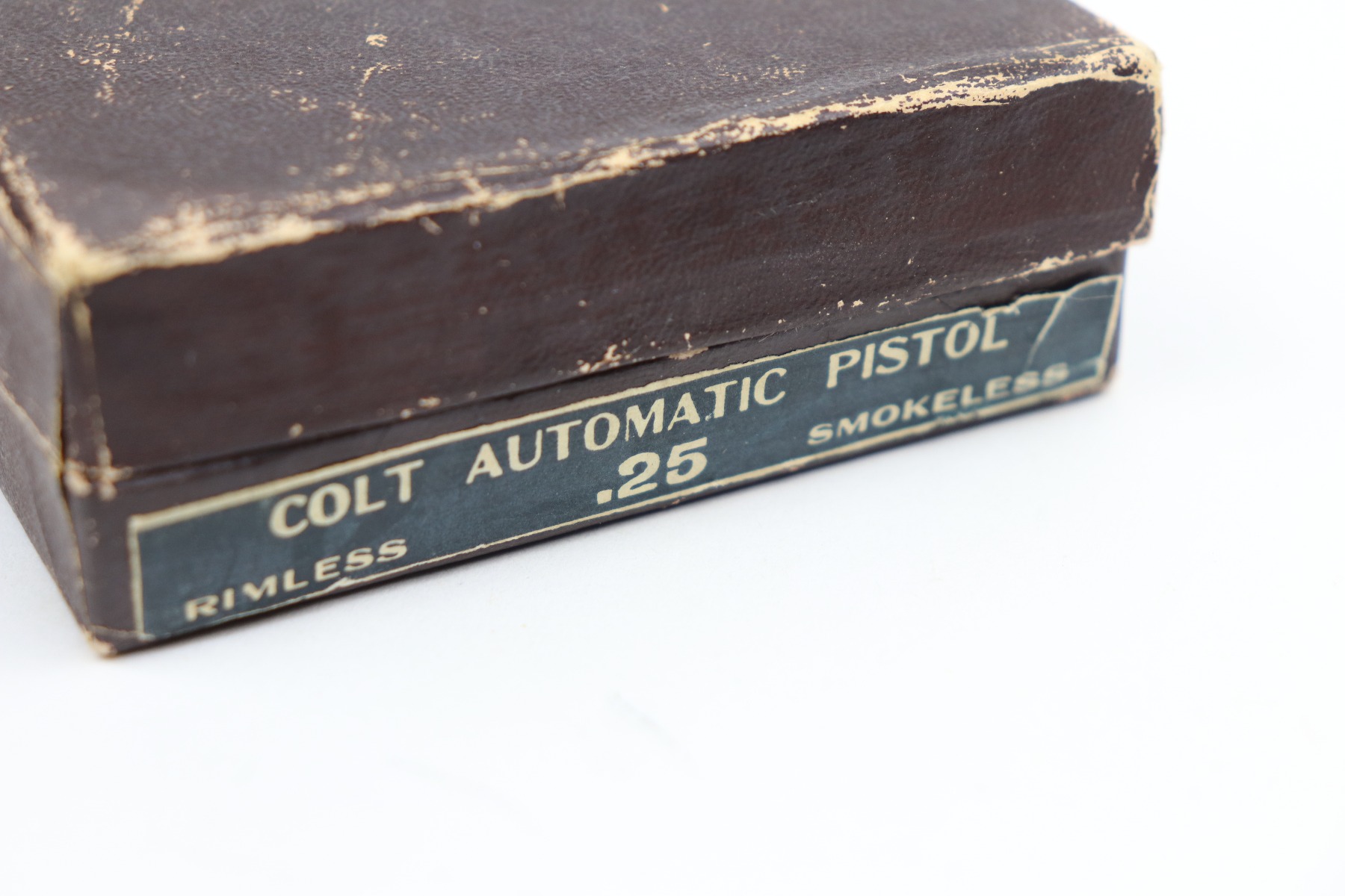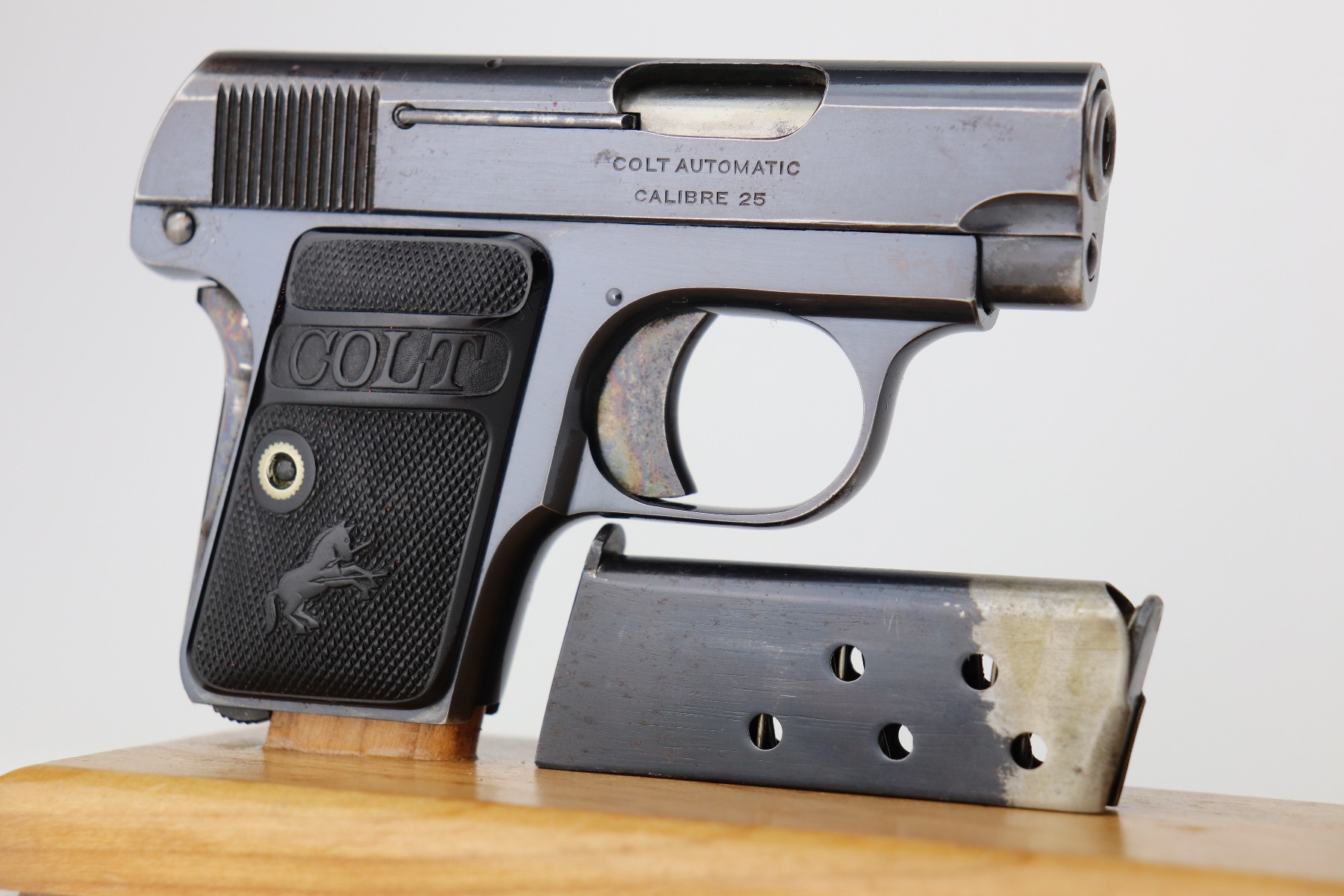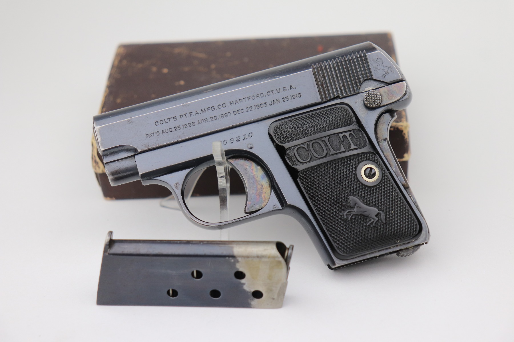 3/26/21 – This is an excellent example of a Colt Model 1908 Vest Pocket manufactured in 1919. The gun is all correct and comes with a period-correct box (not serialized to the gun). The gun has beautiful case hardening and has retained about 98% of its original bluing. There is just a hint of wear around the muzzle and on the high edges of the slide. Tiny dots of oxidation here and there. A few very light scratches on the top of the slide. Comes with excellent grips and a period-correct magazine. The bore has decent rifling with pitting throughout. The box has light tears along the edges.