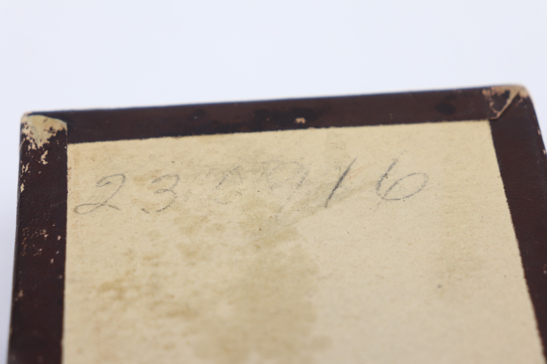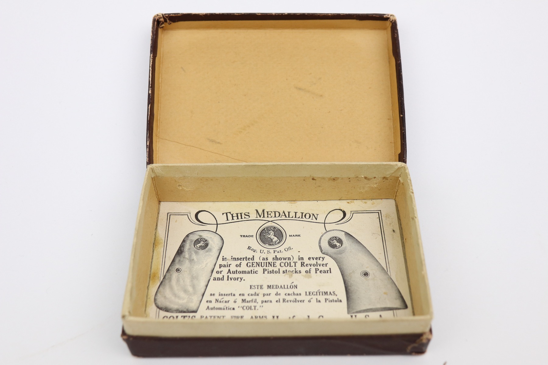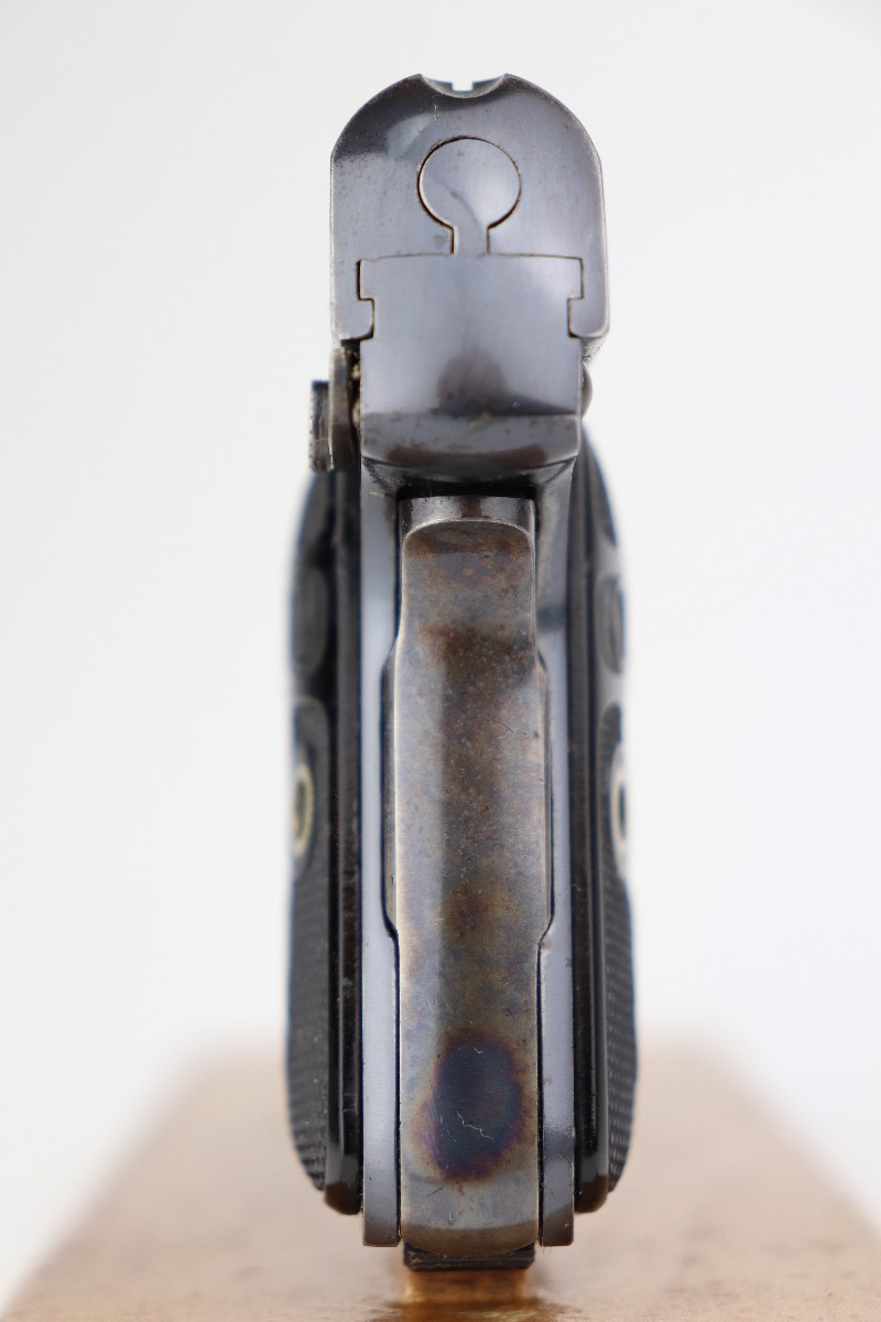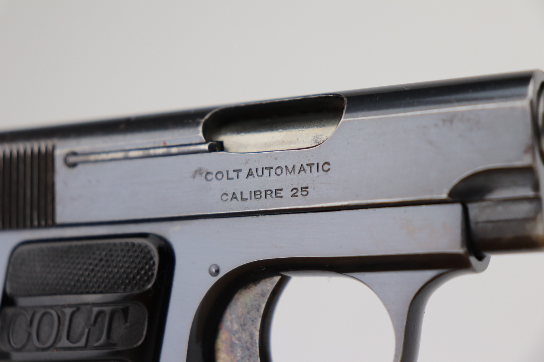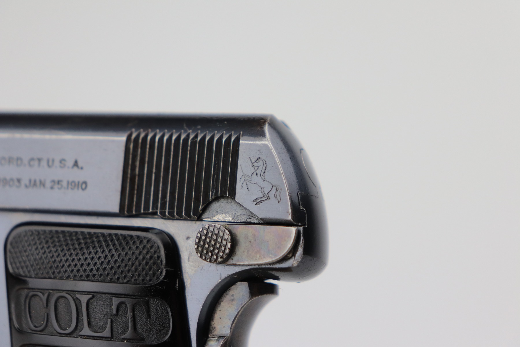 3/26/21 – This is an excellent example of a Colt Model 1908 Vest Pocket manufactured in 1919. The gun is all correct and comes with a period-correct box (not serialized to the gun). The gun has beautiful case hardening and has retained about 98% of its original bluing. There is just a hint of wear around the muzzle and on the high edges of the slide. Tiny dots of oxidation here and there. A few very light scratches on the top of the slide. Comes with excellent grips and a period-correct magazine. The bore has decent rifling with pitting throughout. The box has light tears along the edges.