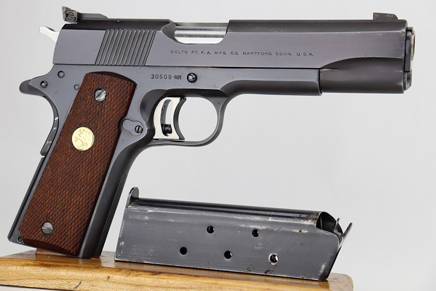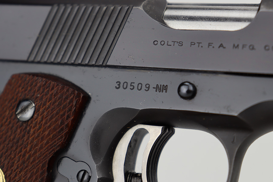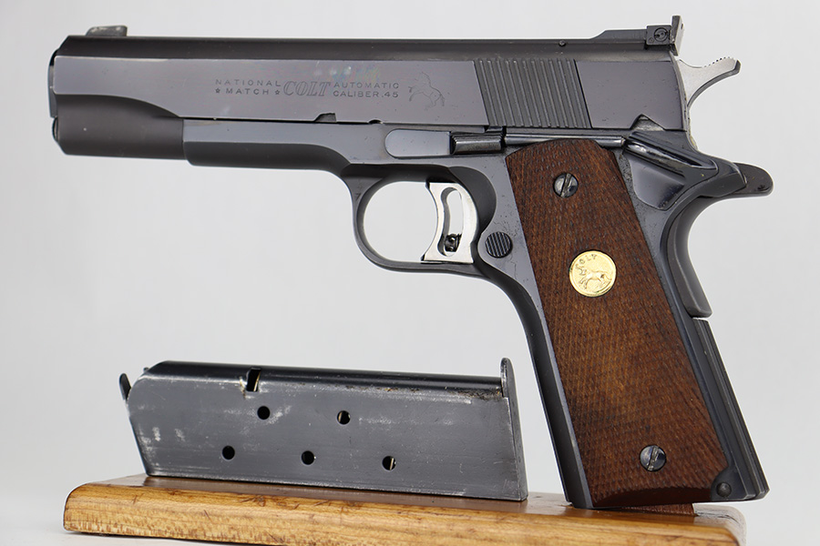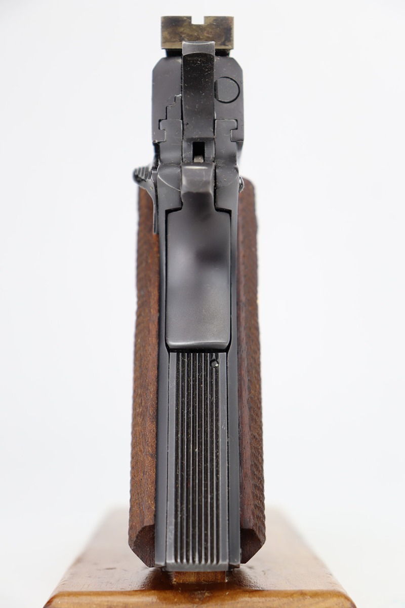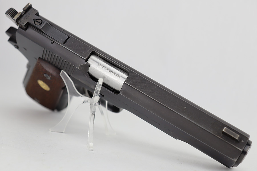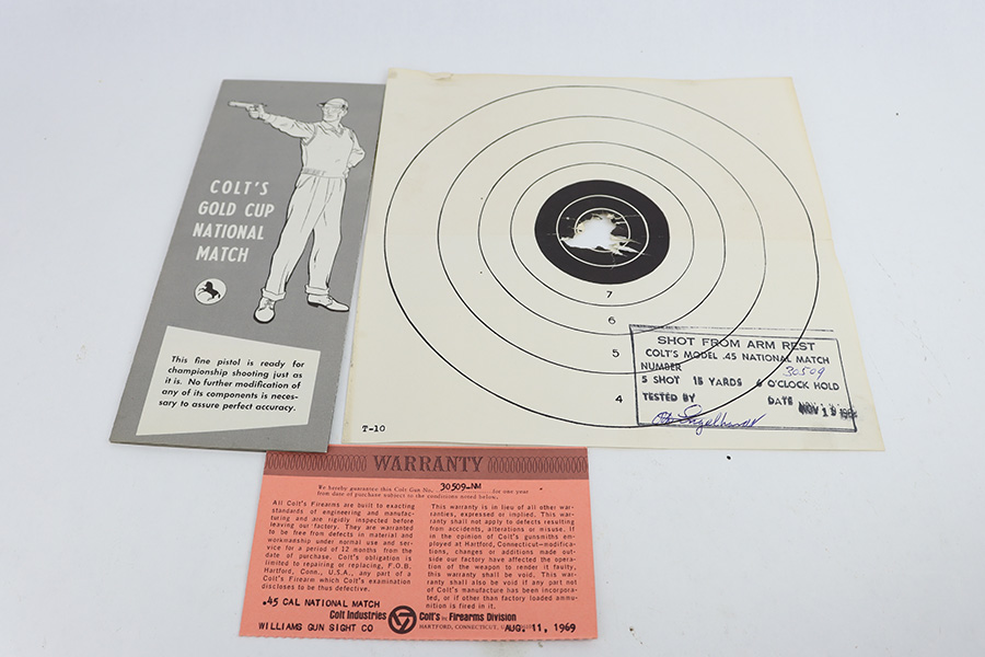 6/12/23 – This is an excellent Colt National Match pistol from 1968 in the original box. It has about 97% of the original blue remaining, with a few minor spots of finish loss on the left side of the slide and a few minor surface scuffs on the right side. Mint bore and excellent wood grips. The box has the original, matching test target and comes with a manual. Proper box with insert intact. C&R eligible.