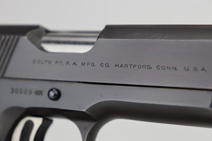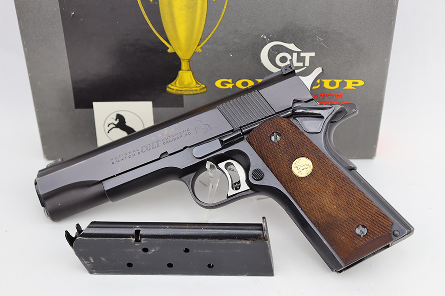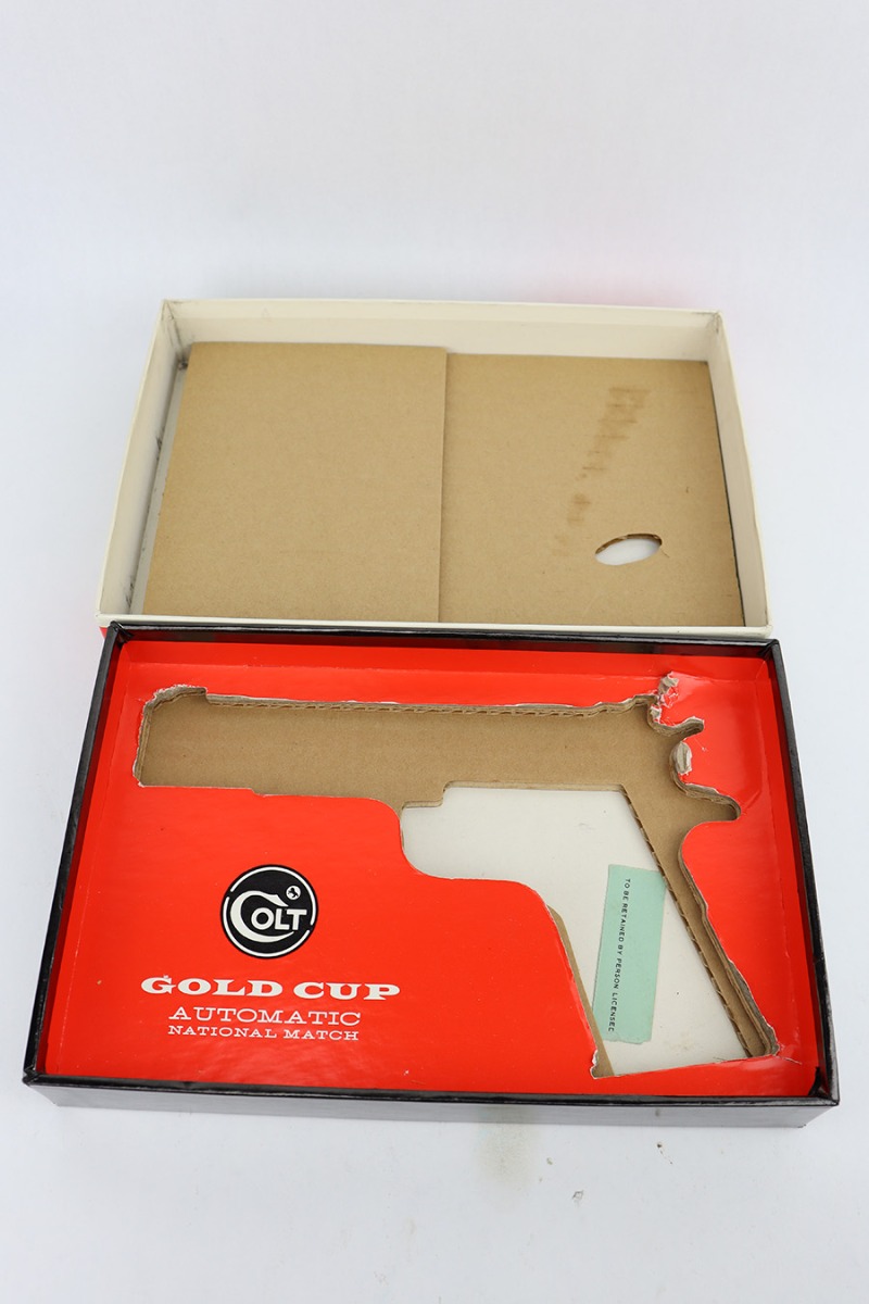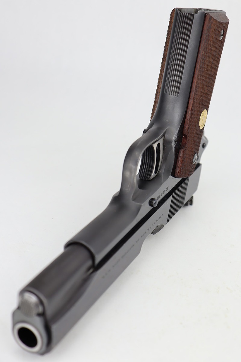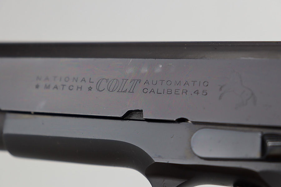 6/12/23 – This is an excellent Colt National Match pistol from 1968 in the original box. It has about 97% of the original blue remaining, with a few minor spots of finish loss on the left side of the slide and a few minor surface scuffs on the right side. Mint bore and excellent wood grips. The box has the original, matching test target and comes with a manual. Proper box with insert intact. C&R eligible.