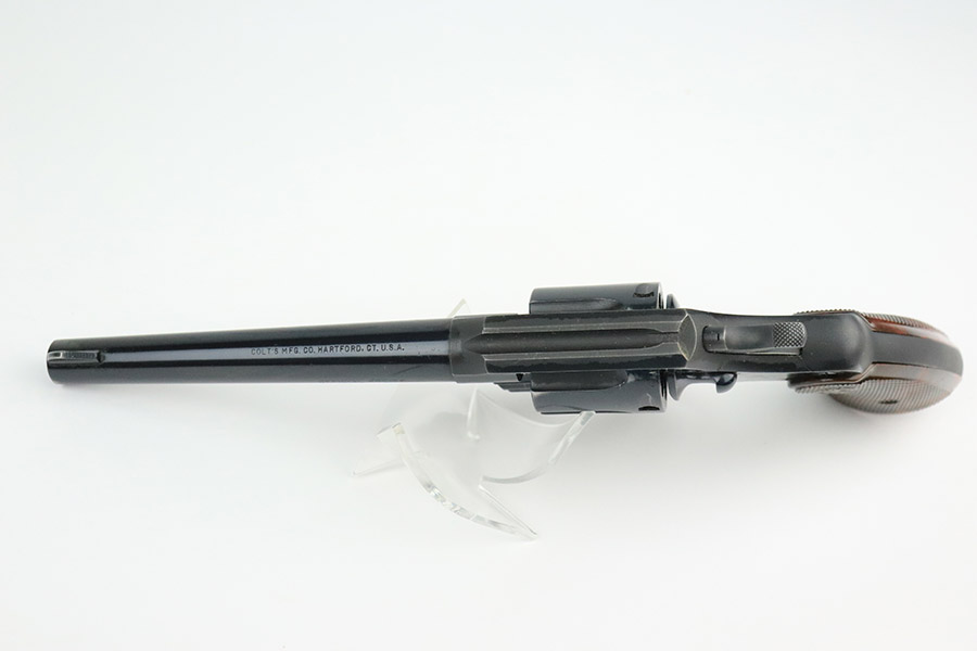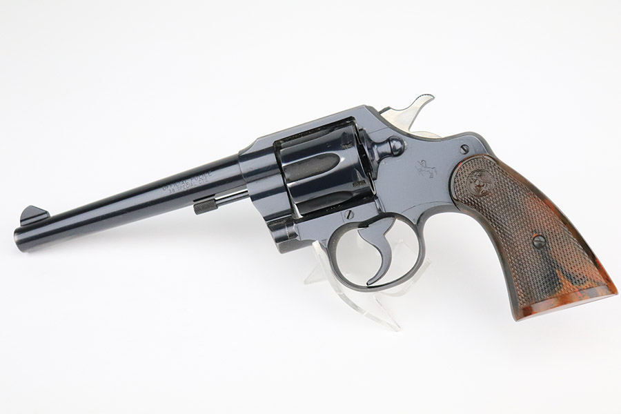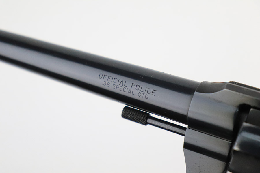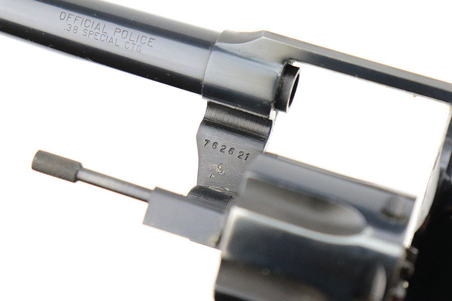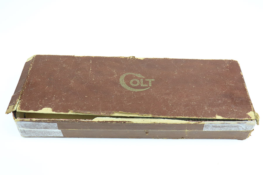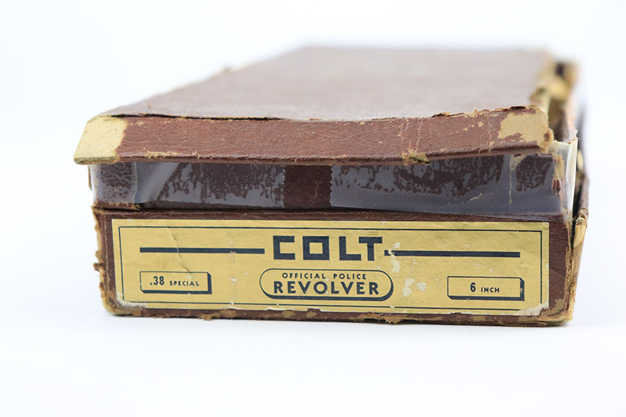 11/16/22 – This is an excellent example of a Colt Official Police revolver, manufactured in 1949 and chambered in .38 Special. This one comes with a period-correct box that is not number. The side panels on the lid have mostly ripped away and the side panels of the box are fairly torn (being held together with scotch tape). The gun itself is all matching and has retained about 97% of its original finish. There is very wear around the muzzle and on the high edges of the cylinder. Very light roll mark on the cylinder as well. A few small handling marks along the right side of the barrel. Comes with excellent marbled brown and black plastic grips. Minty bore. The cylinder is tight and the action is smooth.