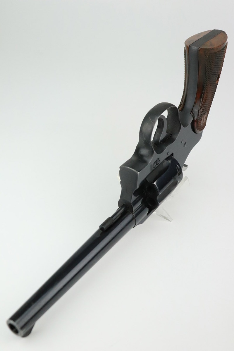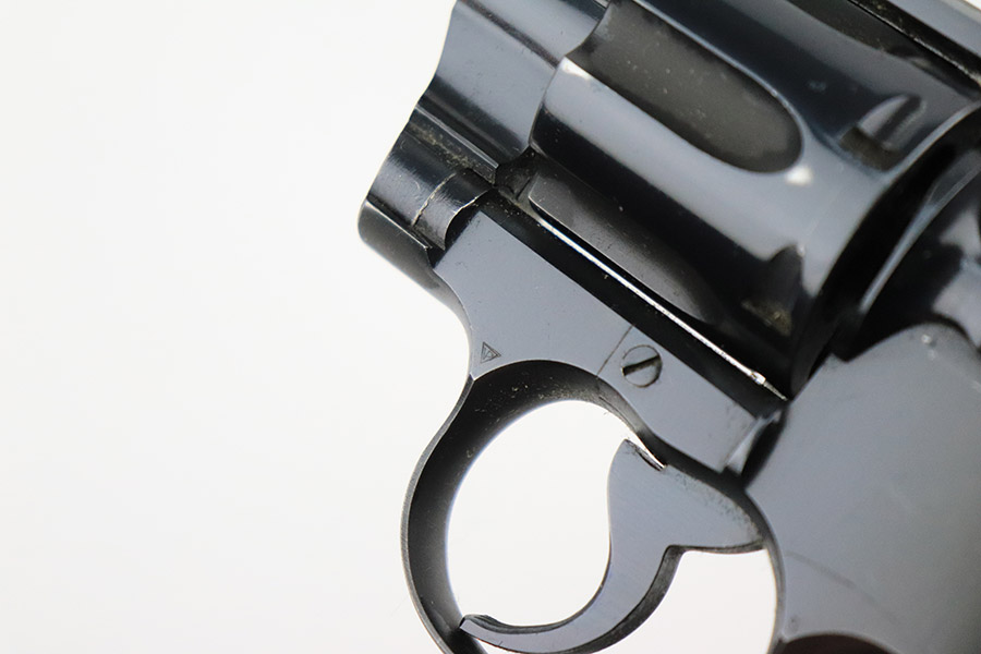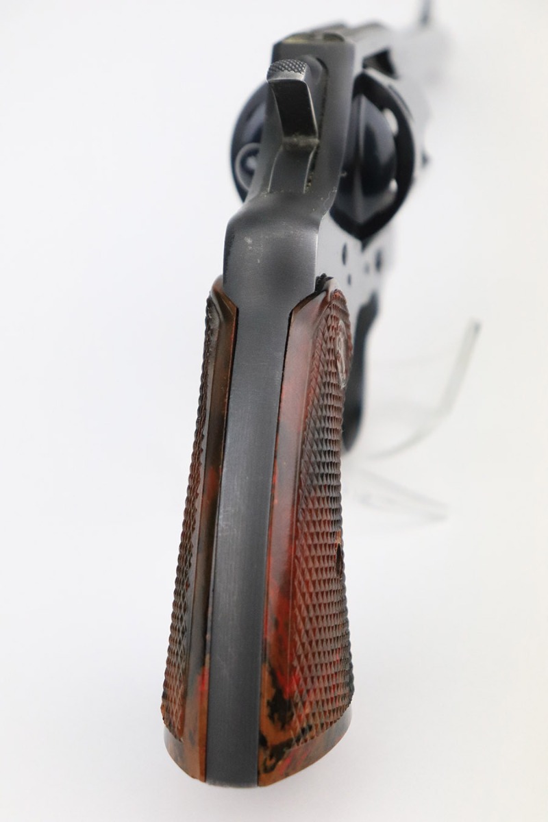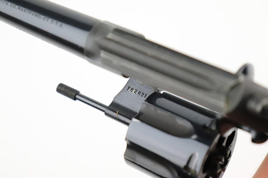11/16/22 – This is an excellent example of a Colt Official Police revolver, manufactured in 1949 and chambered in .38 Special. This one comes with a period-correct box that is not number. The side panels on the lid have mostly ripped away and the side panels of the box are fairly torn (being held together with scotch tape). The gun itself is all matching and has retained about 97% of its original finish. There is very wear around the muzzle and on the high edges of the cylinder. Very light roll mark on the cylinder as well. A few small handling marks along the right side of the barrel. Comes with excellent marbled brown and black plastic grips. Minty bore. The cylinder is tight and the action is smooth.