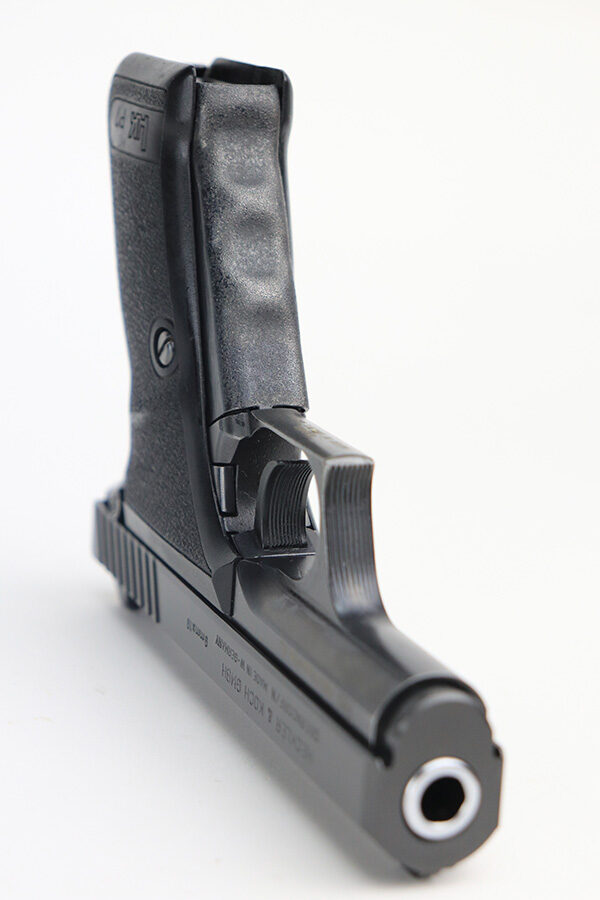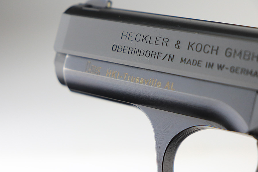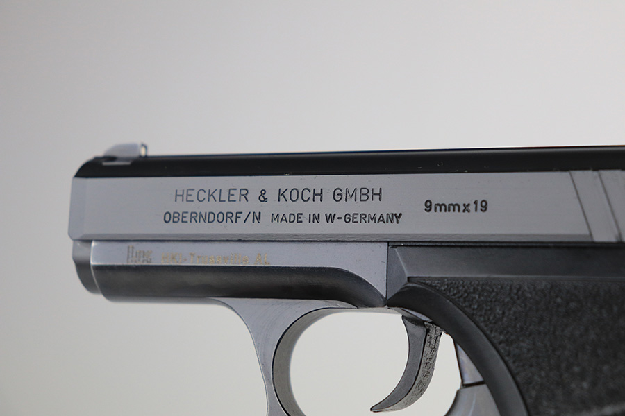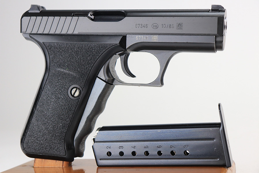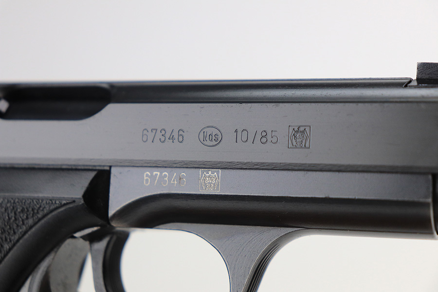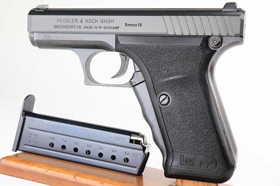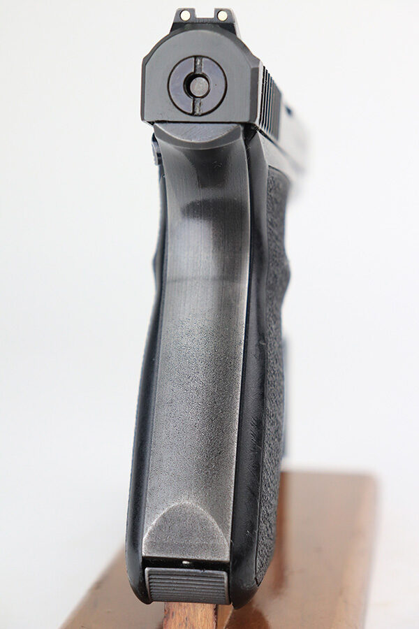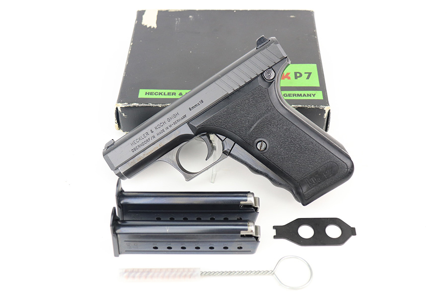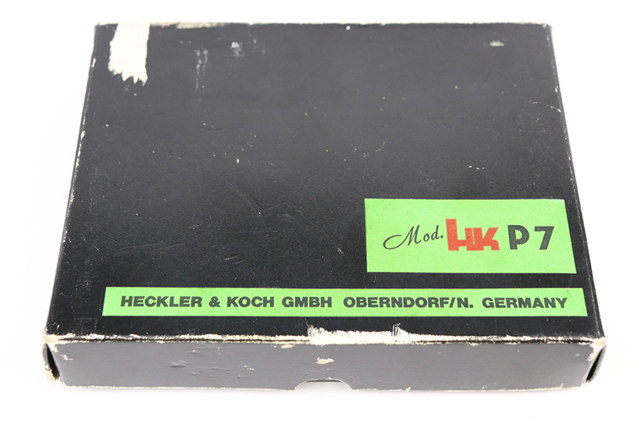 12/16/21 – This is an excellent example of an HK P7 that was manufactured in October of 1985. It is all matching and has the proper HK proofs. Import mark on the left side of the frame. It comes with a period-correct cardboard box (not numbered), a cleaning rod, multi-tool, owners manual, and two proper magazines. Overall, the gun is in excellent condition. There is just some very minor thinning on the back grip strap and on the underside of the trigger guard. Comes with excellent black plastic grips. The bore is near-mint – shiny with great rifling.