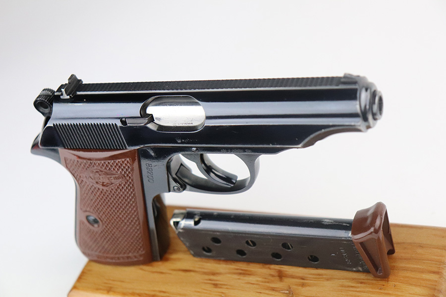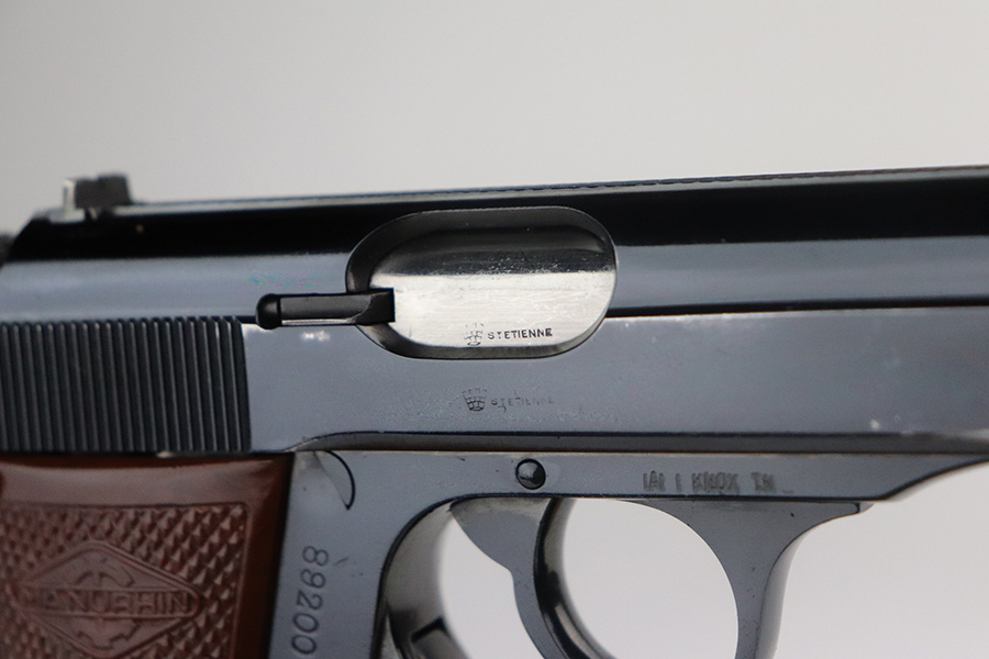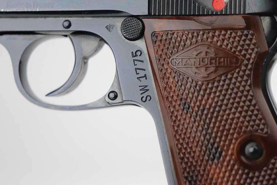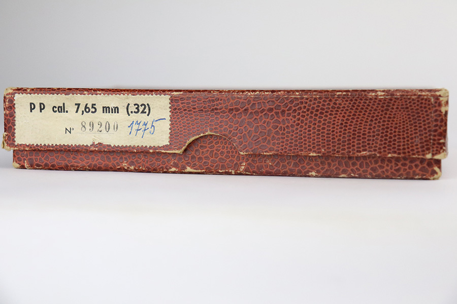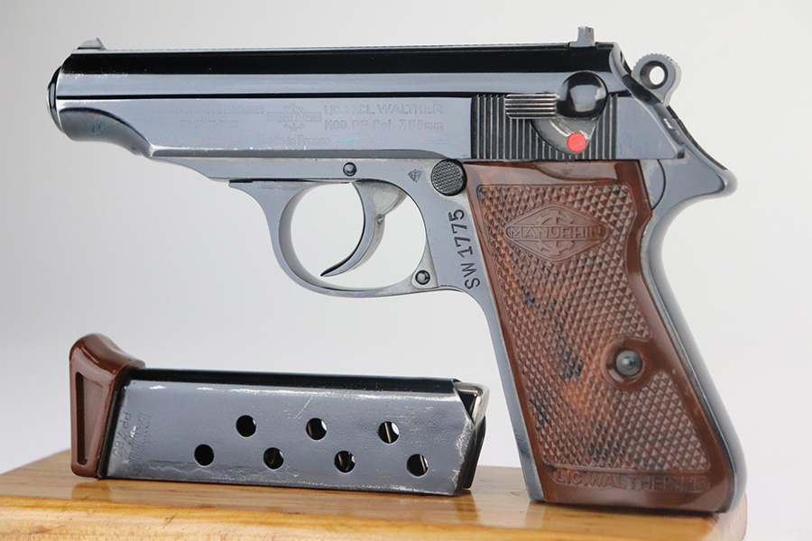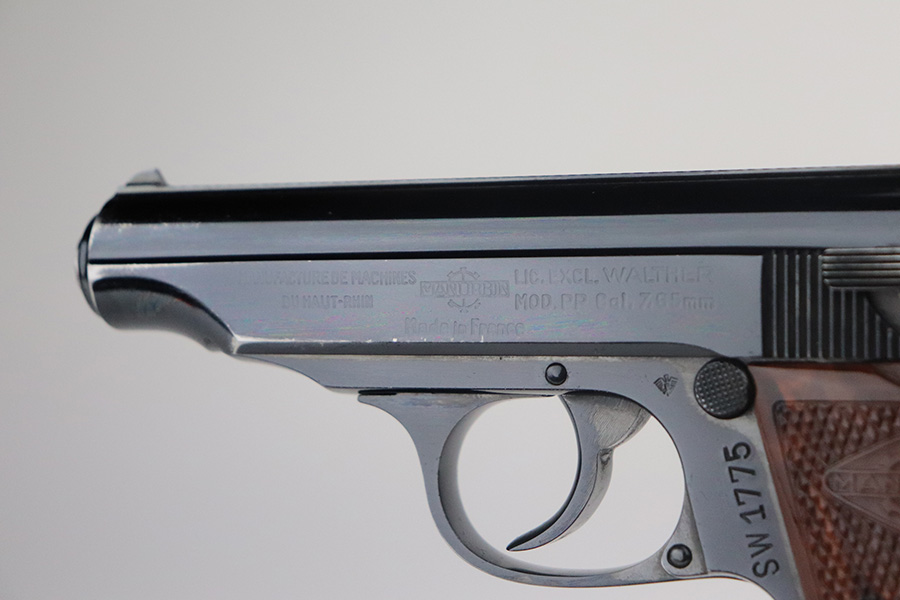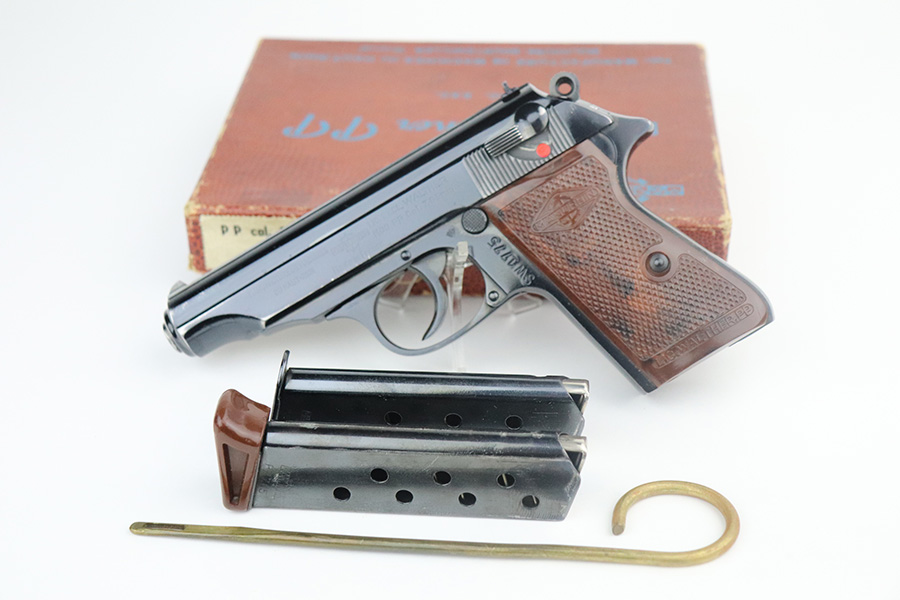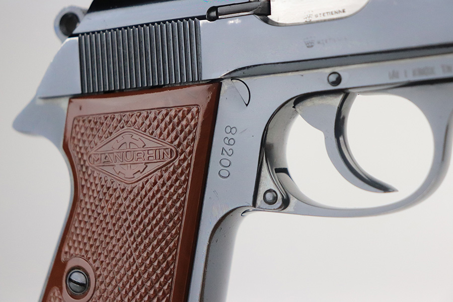 7/13/21 – This is an excellent example of a French Manurhin Walther PP issued to the Austrian Police Force in the late 1950’s. It is all matching and has an “SW 1775” Austrian police marking. Import mark on the right side of the frame. The gun comes with the original matching box, a matching finger extension magazine, a matching flat-bottom magazine, an original cleaning rod, and a nice leather shoulder holster. It has retained about 97-98% of its high polish finish. There is minor wear on the high edges of the slide and around the muzzle. Some minor freckling on the straps. Comes with excellent brown Manurhin grips. Mint bore.