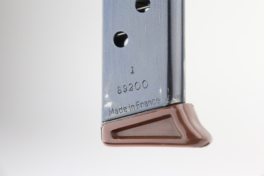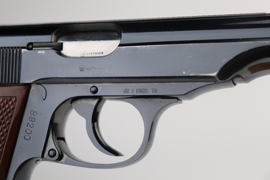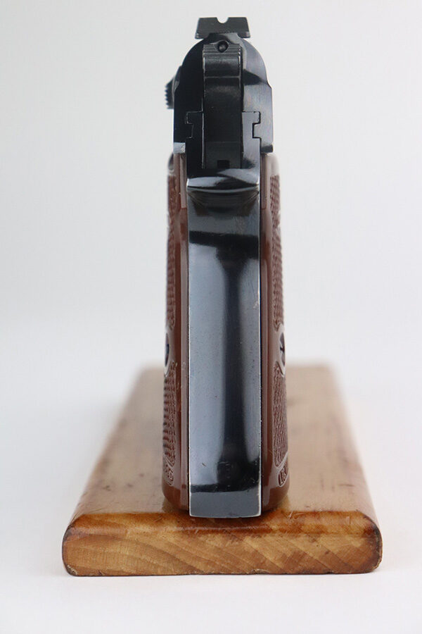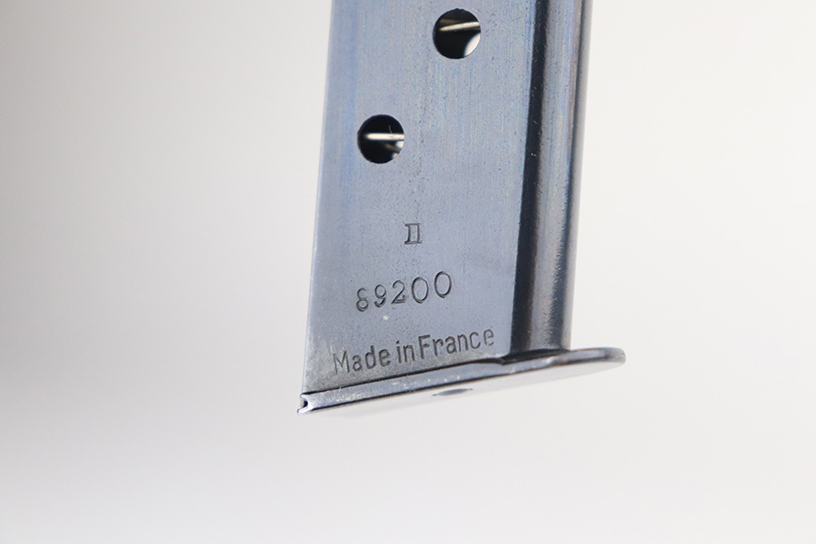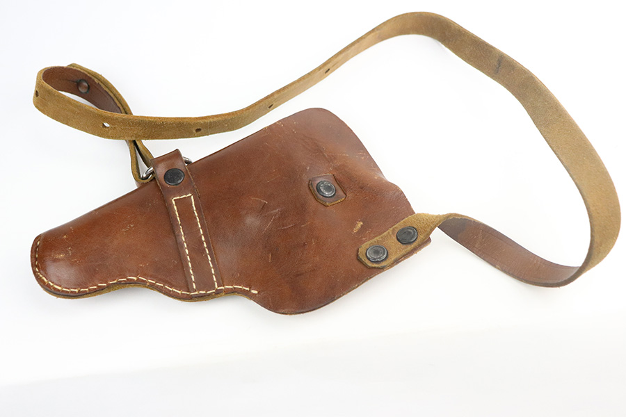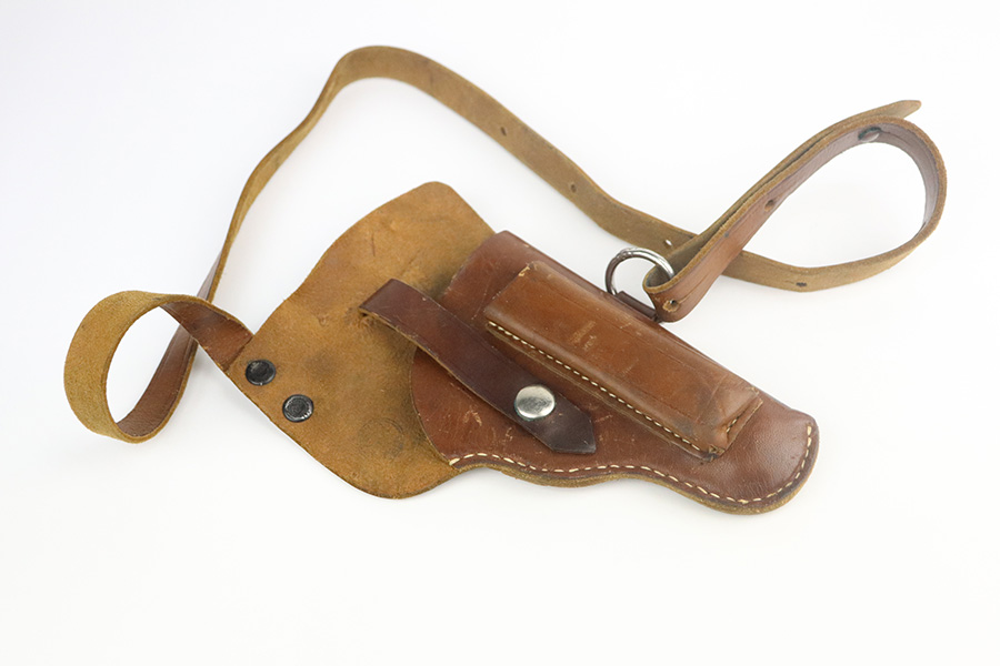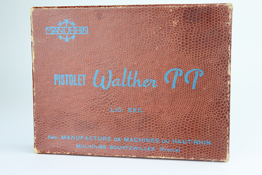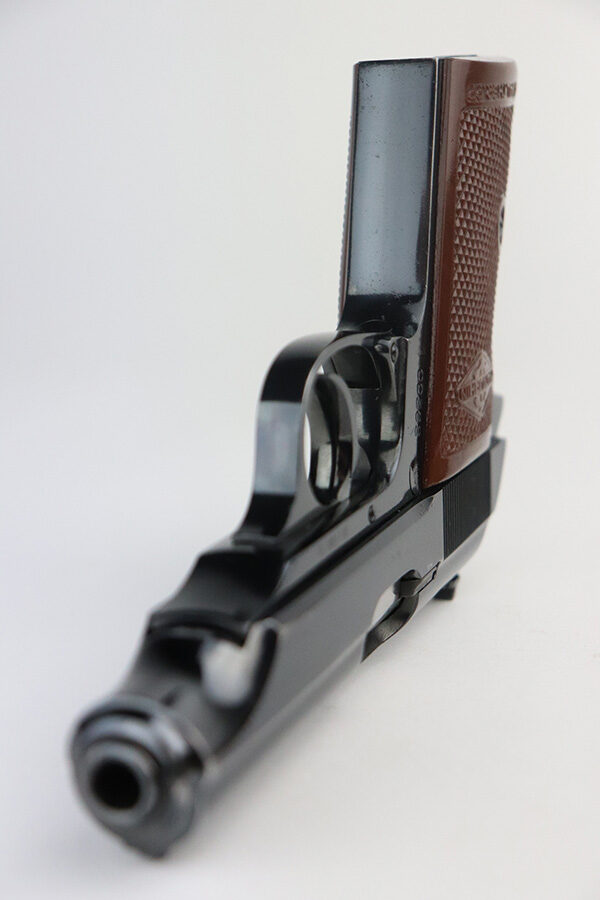 7/13/21 – This is an excellent example of a French Manurhin Walther PP issued to the Austrian Police Force in the late 1950’s. It is all matching and has an “SW 1775” Austrian police marking. Import mark on the right side of the frame. The gun comes with the original matching box, a matching finger extension magazine, a matching flat-bottom magazine, an original cleaning rod, and a nice leather shoulder holster. It has retained about 97-98% of its high polish finish. There is minor wear on the high edges of the slide and around the muzzle. Some minor freckling on the straps. Comes with excellent brown Manurhin grips. Mint bore.