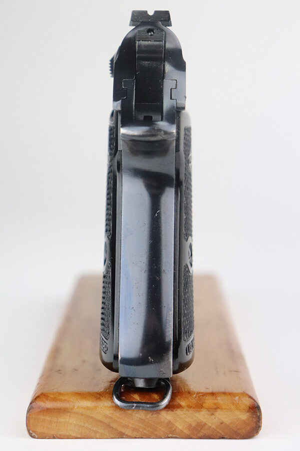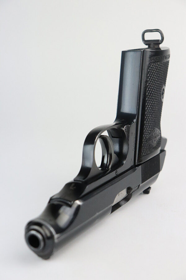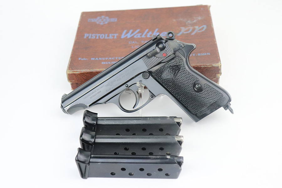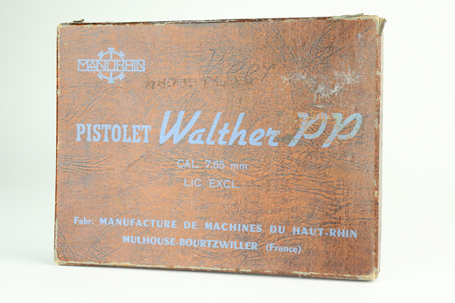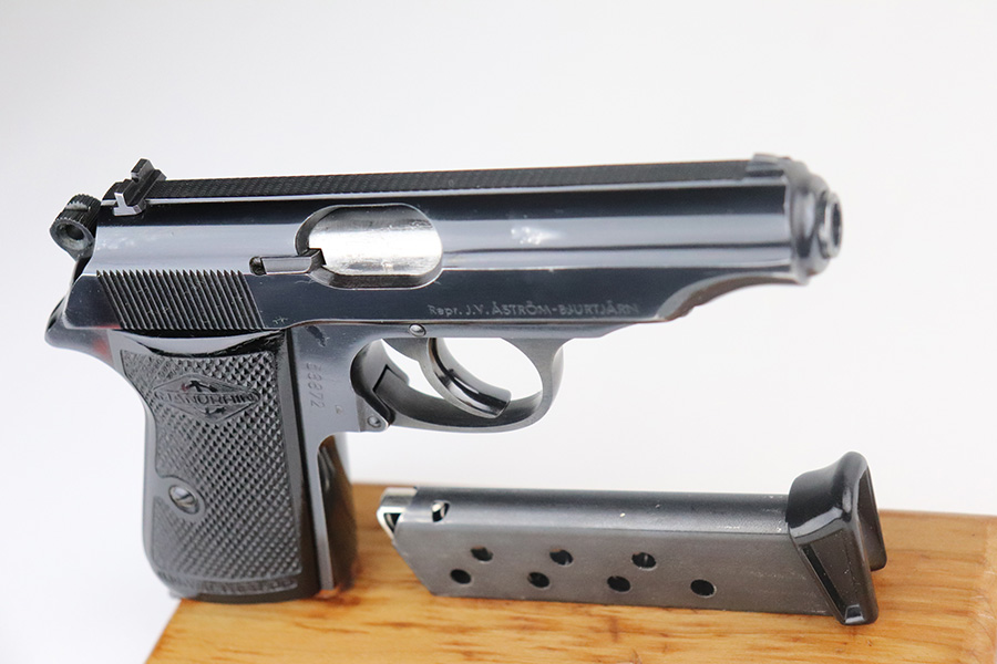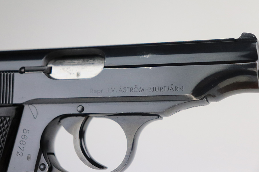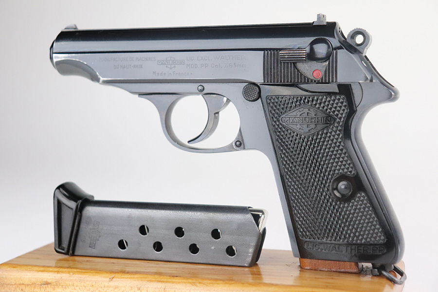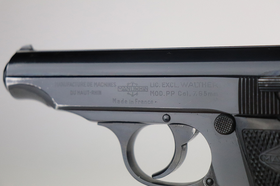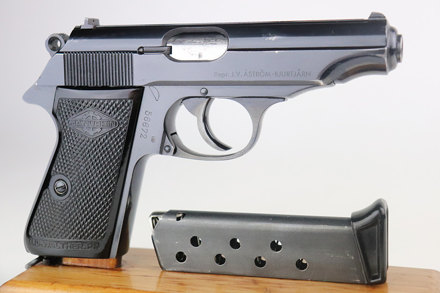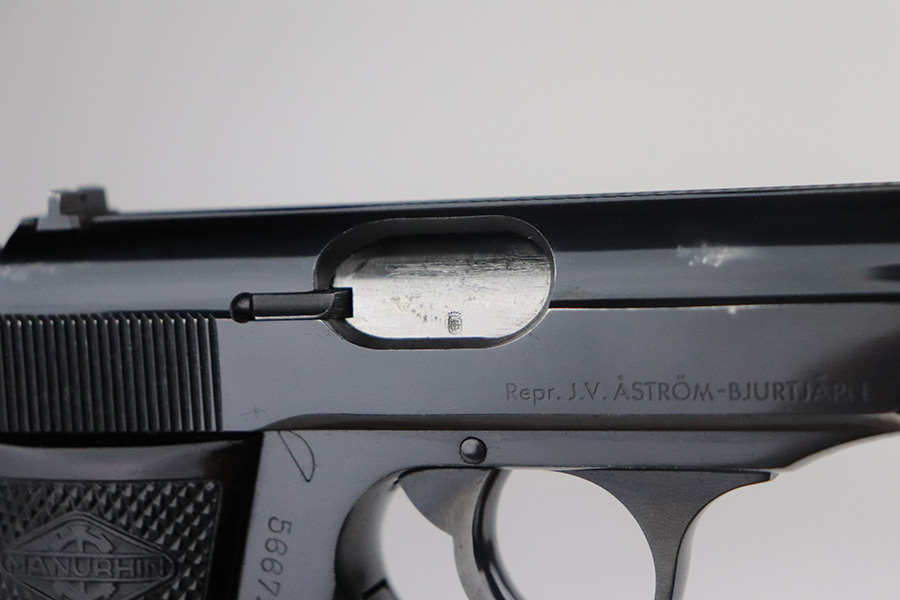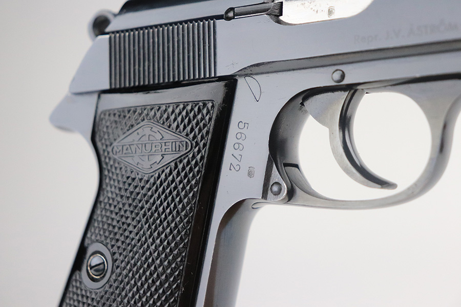 7/13/21 – This is an excellent example of a French Manurhin PP manufactured in the mid-1950’s. It is all matching and has a “Repr. J.V. Astrom-Bjurtjarn” marking on the right side of the slide. This is marking represents the Swedish importer responsible for distributing guns to the Swedish police forces. Import mark on the underside of the frame. The gun comes with a period-correct Manurhin PP box (not numbered) and three Manurhin PP finger extension magazines. The gun has retained about 97-98% of its high polish finish. There is minor wear around the muzzle and a spot of wear on the right side of the slide. Some minor freckling on the back strap. Comes with excellent black Manurhin grips. Mint bore.