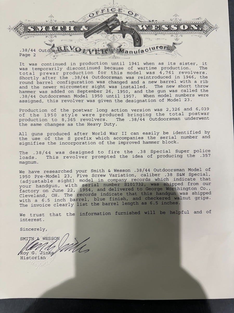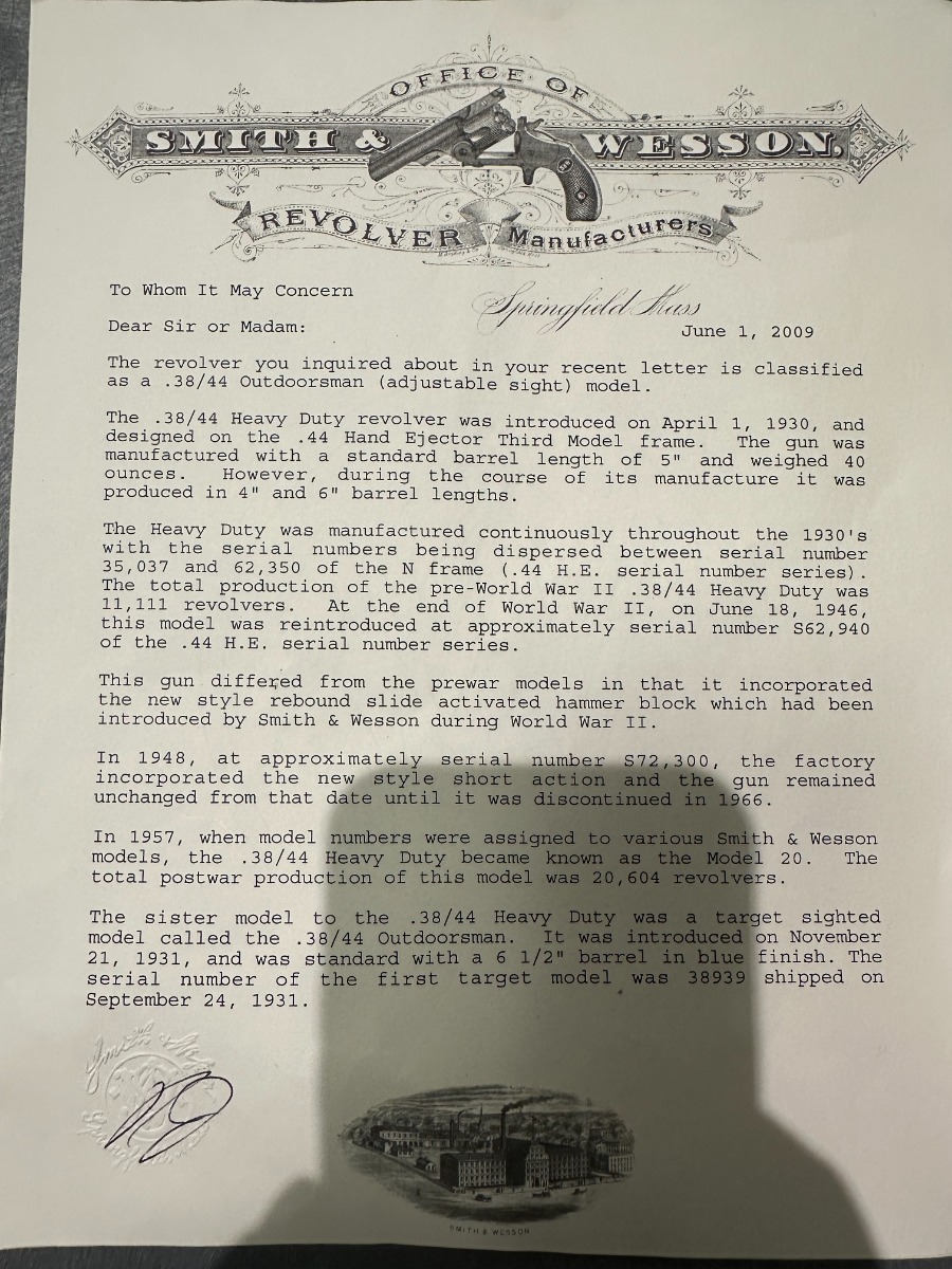 SOLD – Excellent, Boxed Smith & Wesson .38/44 Outdoorsman Model – With Factory Letter