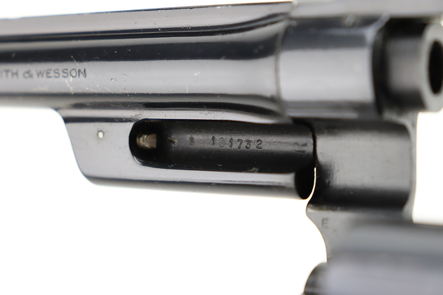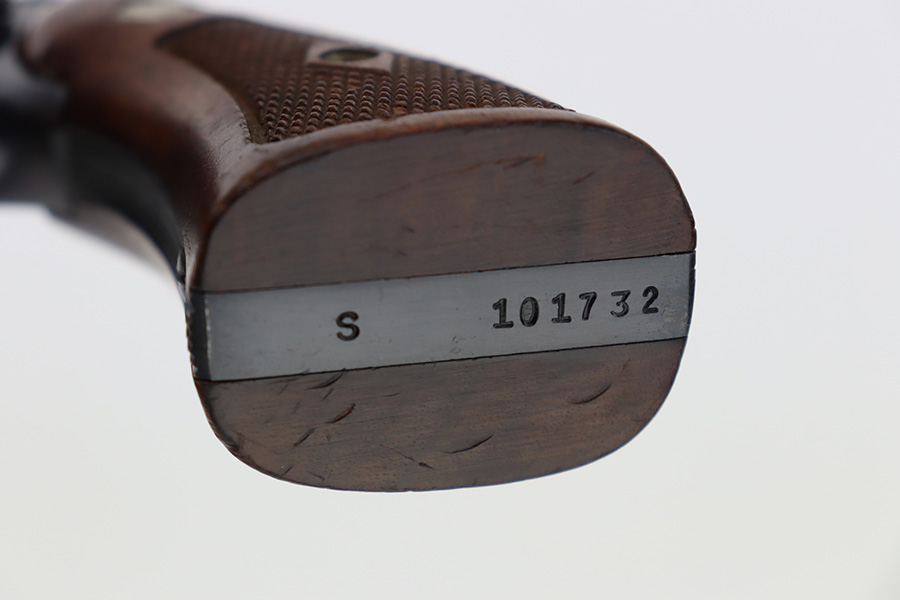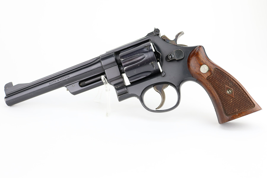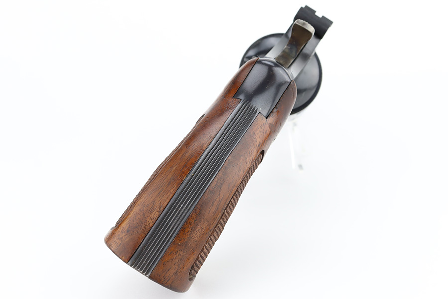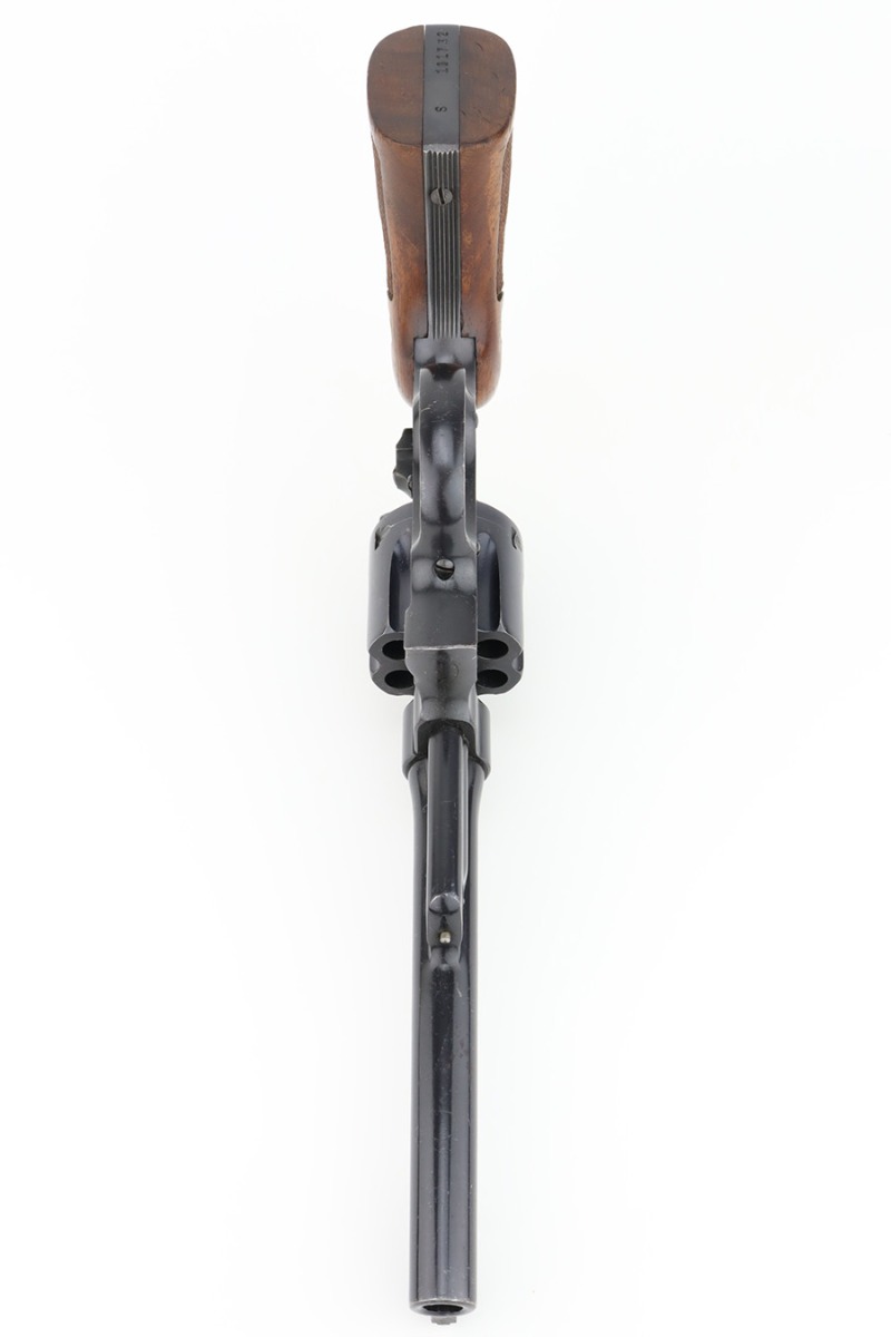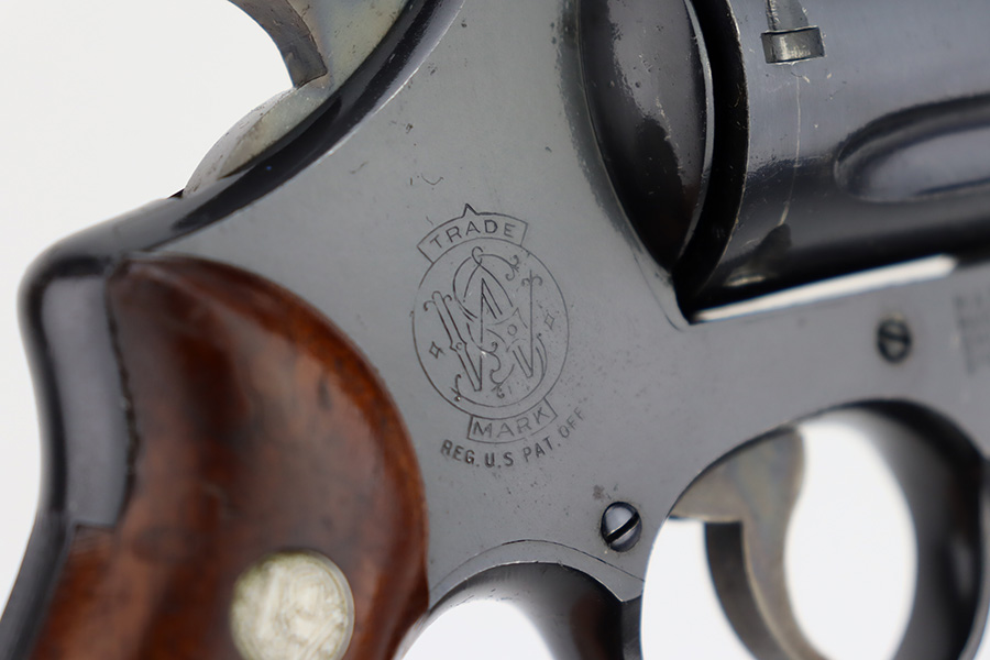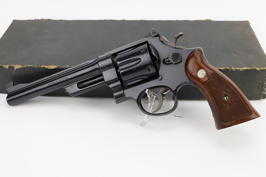12/5/23 – This is an excellent Smith & Wesson .38/44 Outdoorsman Model, chambered in .38 Special. According to the included S&W factory letter, it was shipped to George Washington Co in Cleveland, OH on June 22, 1954. It is matching and comes with a period-correct but mismatched box. The gun itself has retained about 97% of its high polish finish with minor wear around the muzzle, minor wear on the high edges of the cylinder, a very light roll mark on the cylinder, and some tiny scratches and handling marks here and there. Fitted with excellent checkered Walnut grips. Mint bore.