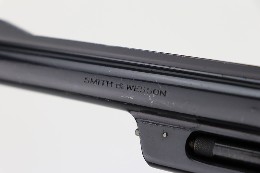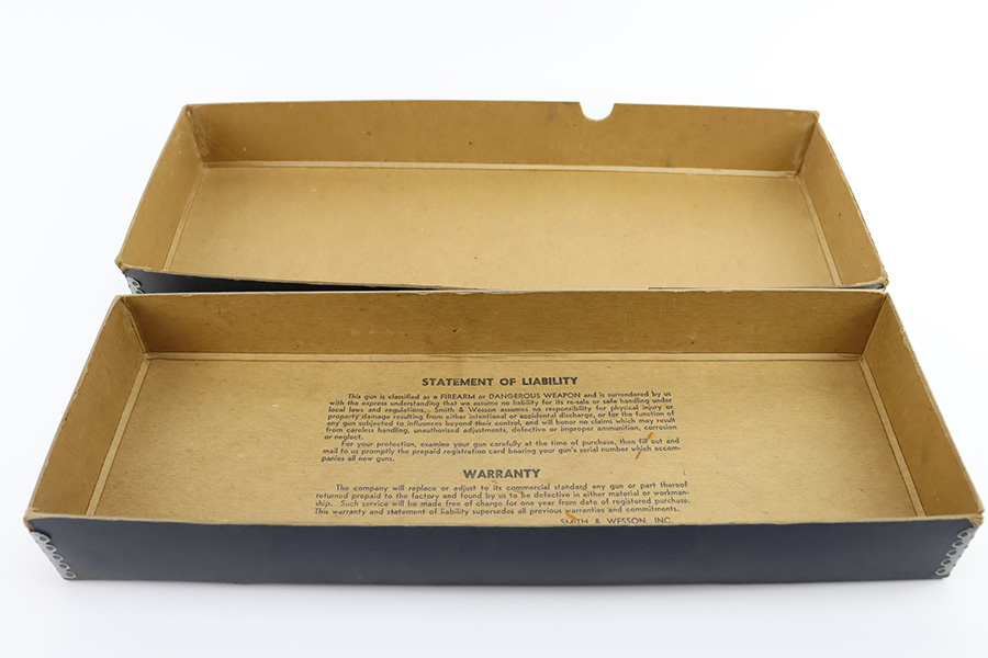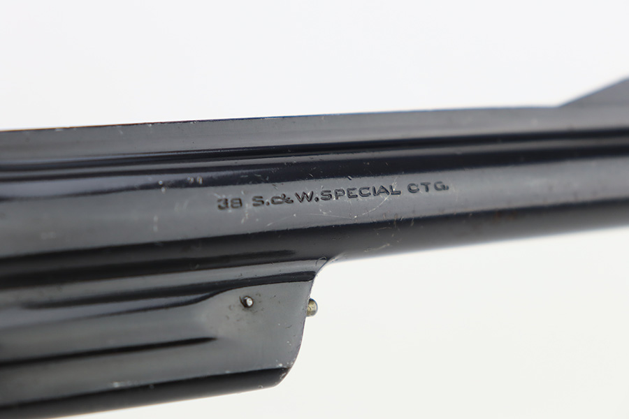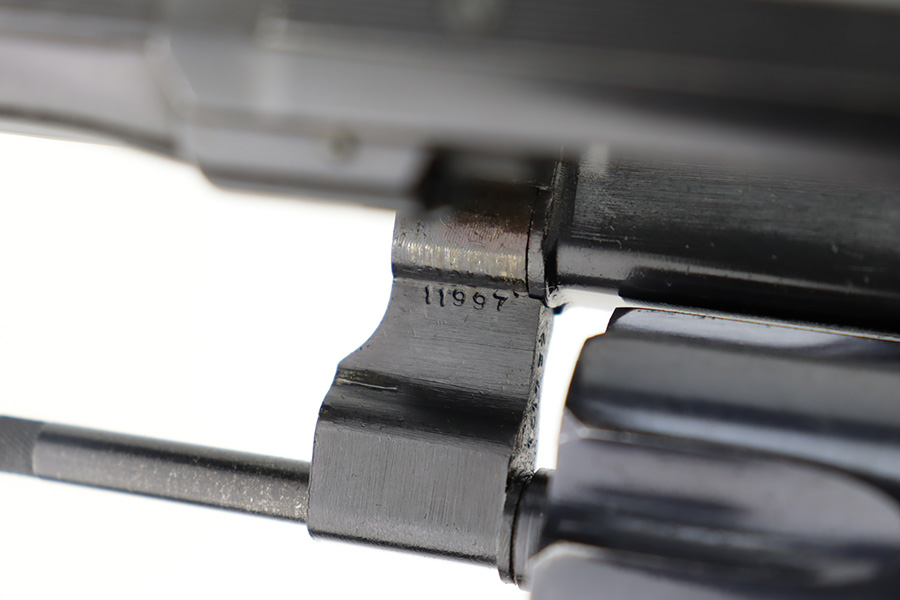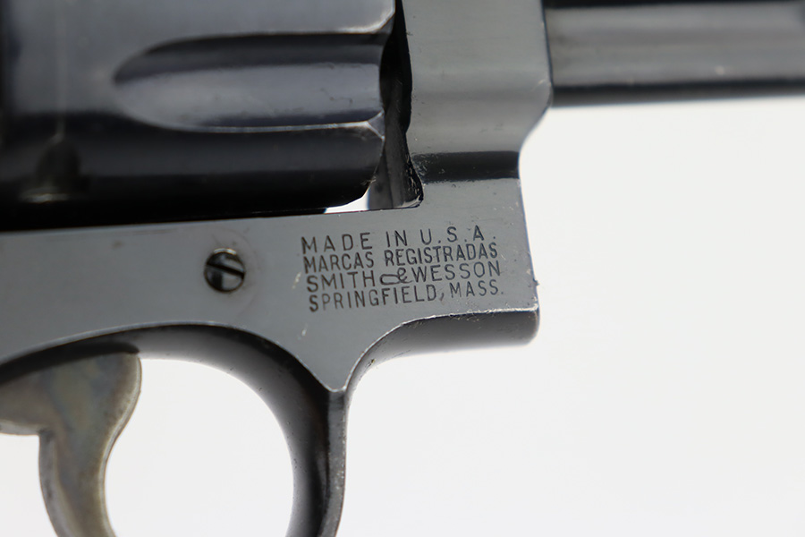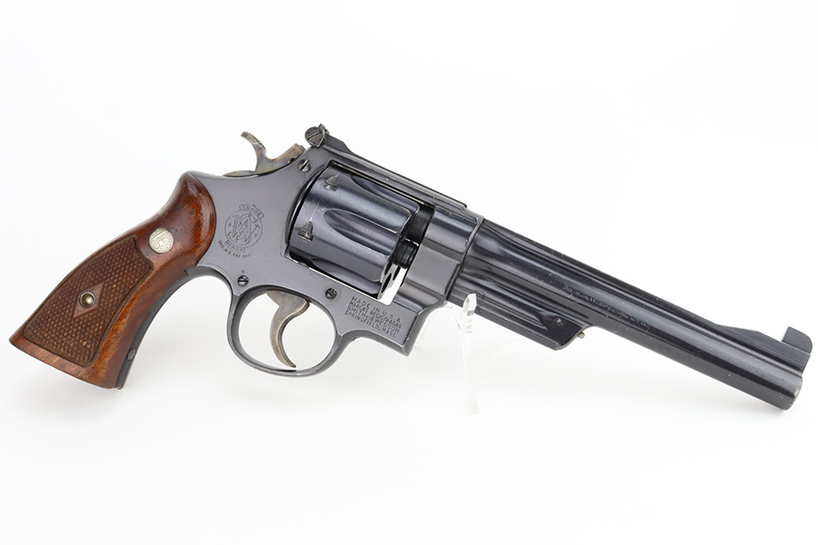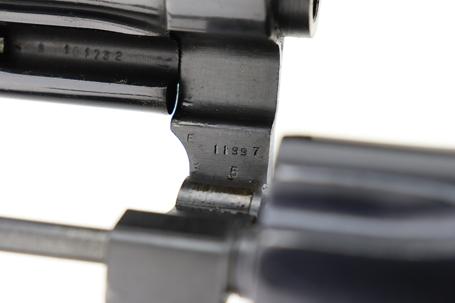12/5/23 – This is an excellent Smith & Wesson .38/44 Outdoorsman Model, chambered in .38 Special. According to the included S&W factory letter, it was shipped to George Washington Co in Cleveland, OH on June 22, 1954. It is matching and comes with a period-correct but mismatched box. The gun itself has retained about 97% of its high polish finish with minor wear around the muzzle, minor wear on the high edges of the cylinder, a very light roll mark on the cylinder, and some tiny scratches and handling marks here and there. Fitted with excellent checkered Walnut grips. Mint bore.