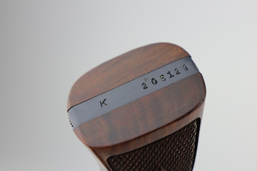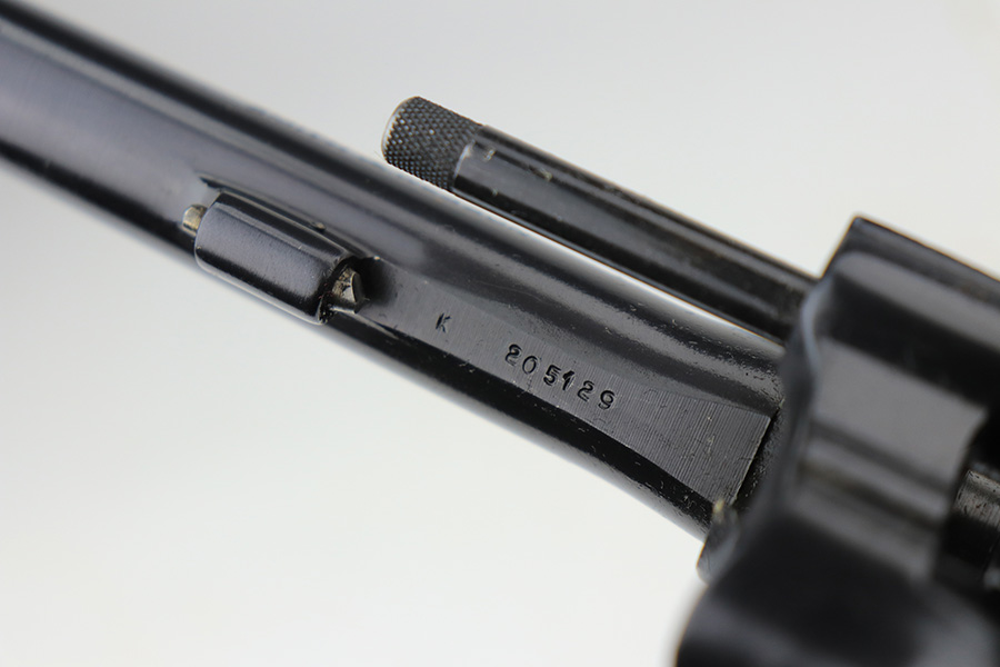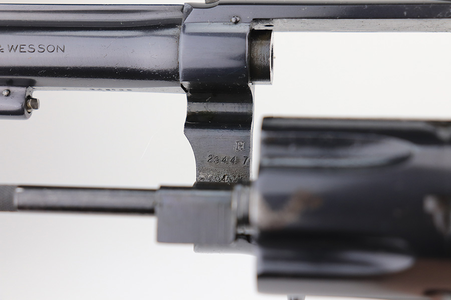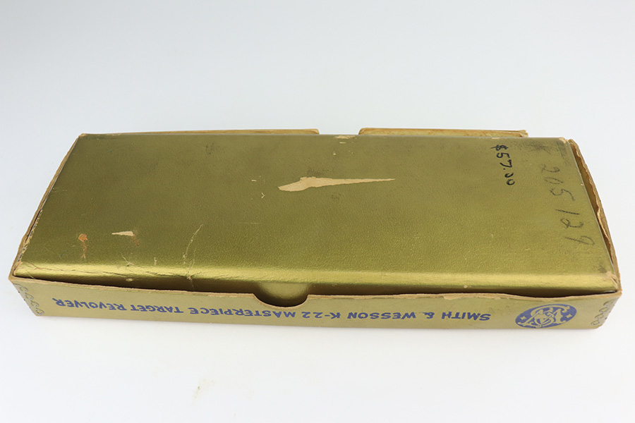 2/22/22 – This is a minty, original Smith & Wesson K-22 Masterpiece in its original box. Made in 1954, the gun has just a spot of finish loss on the cylinder and top of frame, where maybe a little moisture got on the gun. Otherwise, it hardly has a turn line on the cylinder. Beautiful case hardening on the hammer and trigger. Sharply checkered grips with right panel correctly numbered and matching to the gun. Original box is hand-numbered on the bottom and matching to the gun. Correct, early gold S&W box.
