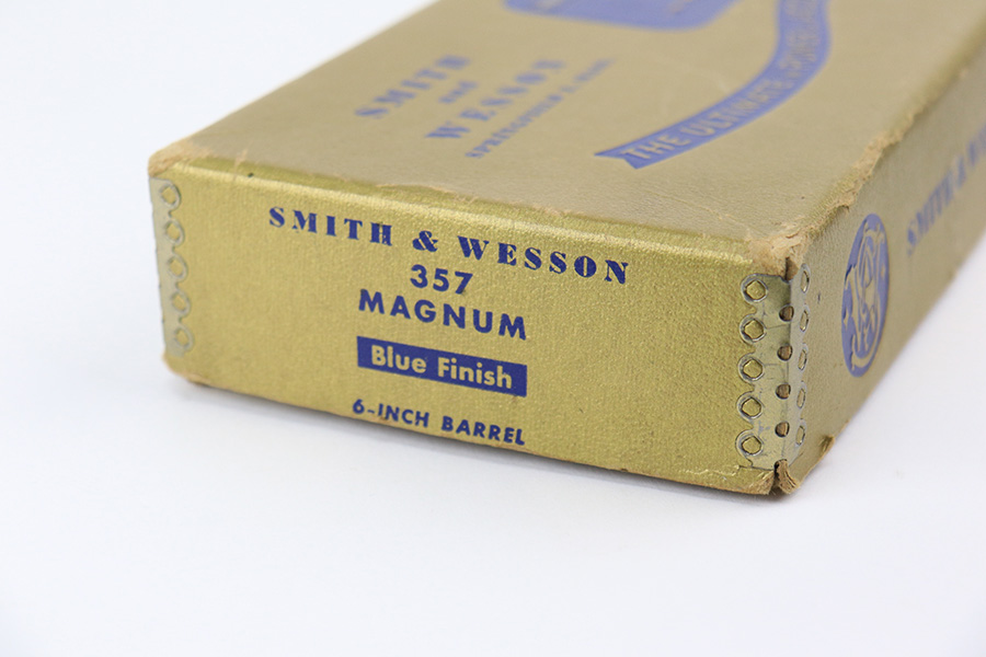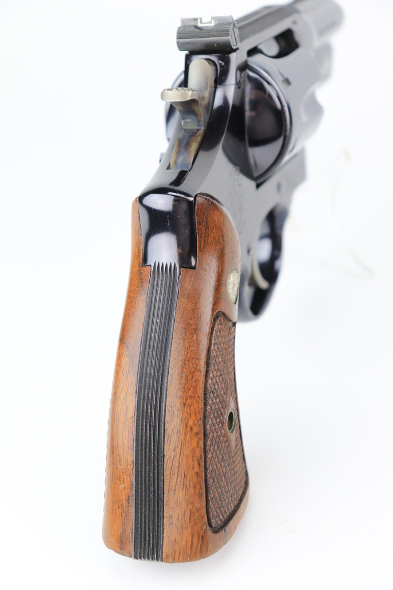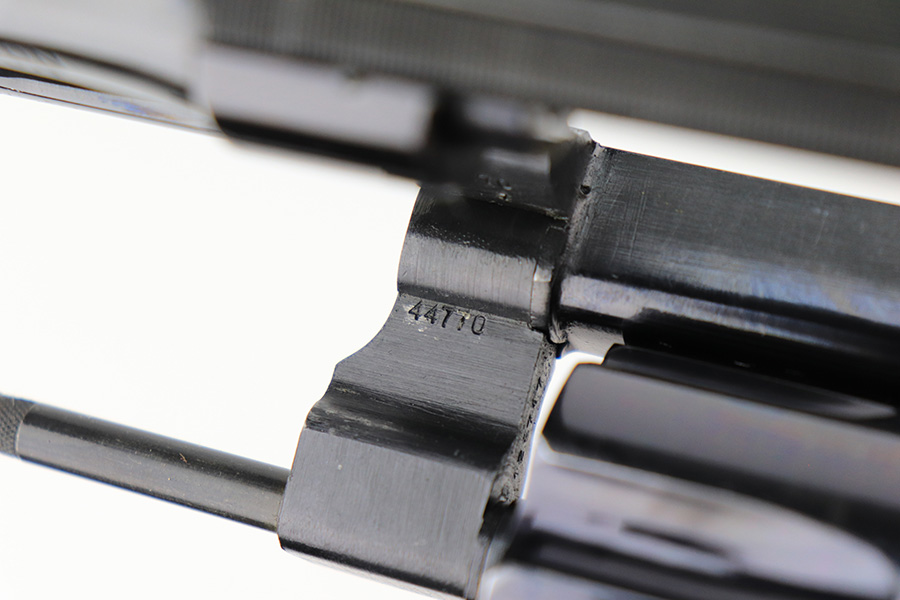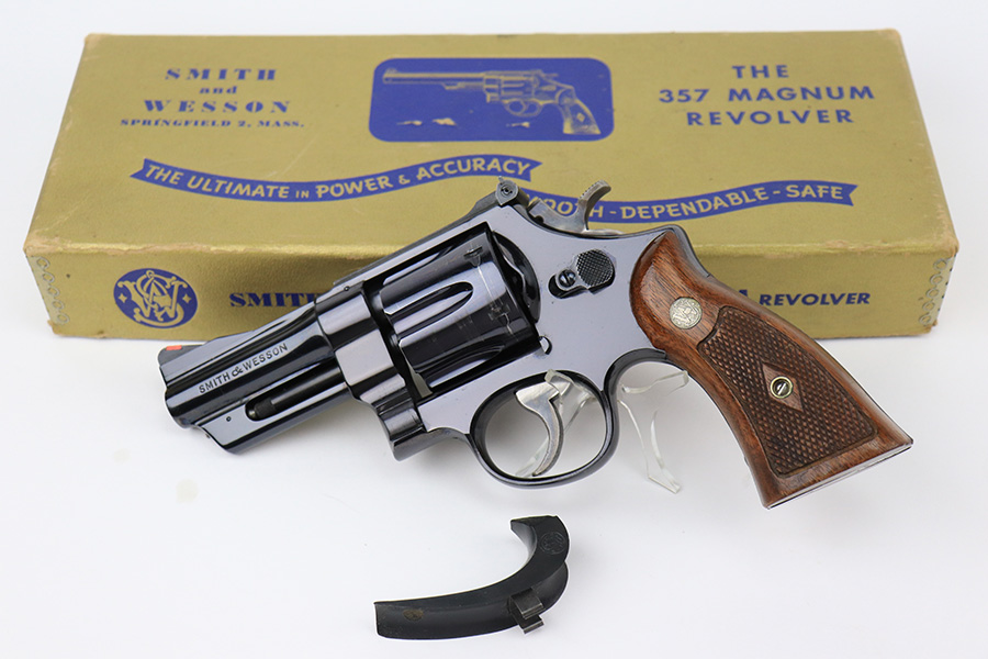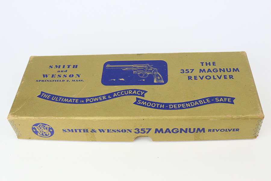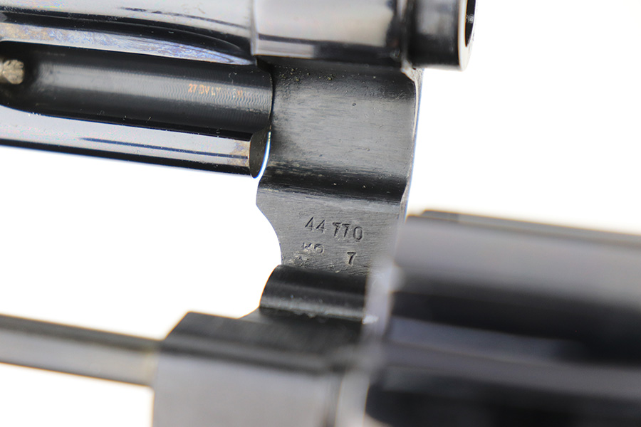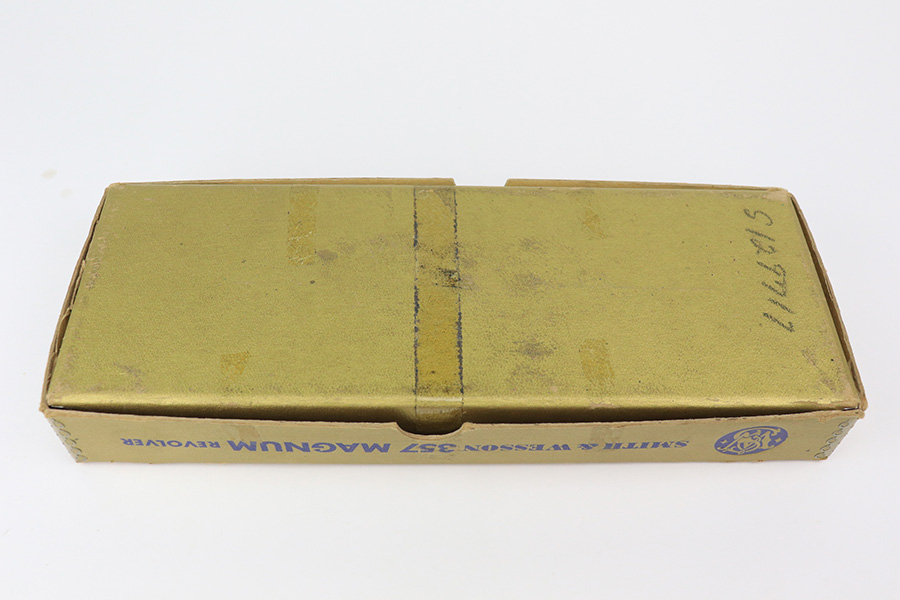 5/16/22 – This is an excellent example of a Smith & Wesson Pre-27 revolver manufactured in late 1953 – early 1954. Chambered in .357 Magnum and has a 3.5 inch barrel. It comes in a period-correct box that is numbered to match the gun. However, the box says 6 inch barrel, so we cannot say for sure if the numbering is original. The gun has retained about 97% of its original high polish finish with some roll marks on the cylinder and some tiny scratches on the butt of the frame. Comes with excellent wood grips and a rubber grip extension. Minty bore. The cylinder is tight and the action is smooth. There is a very light import mark in the well for the ejector rod.