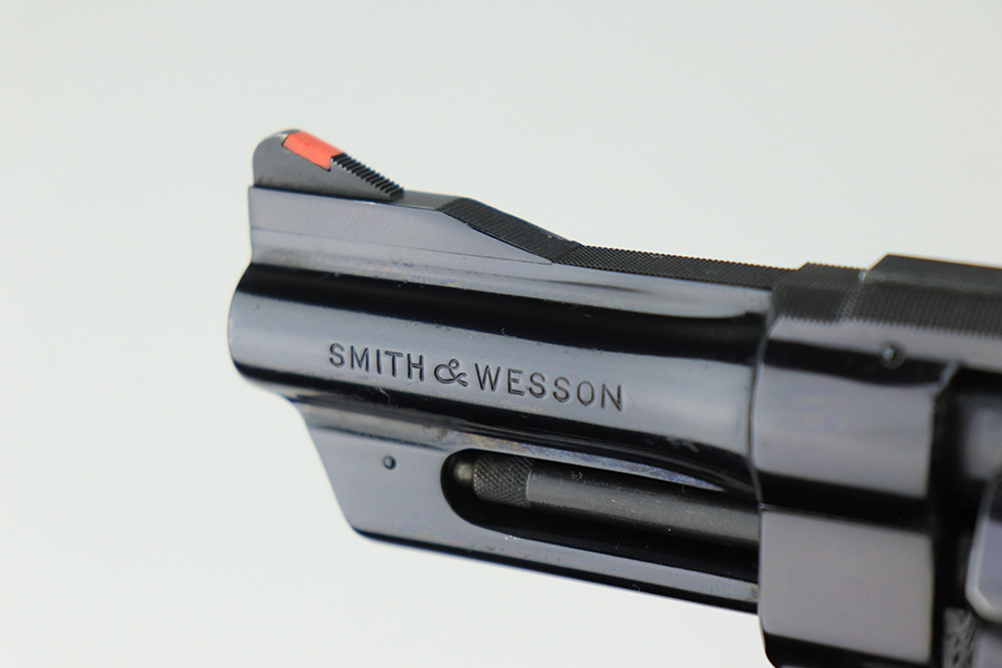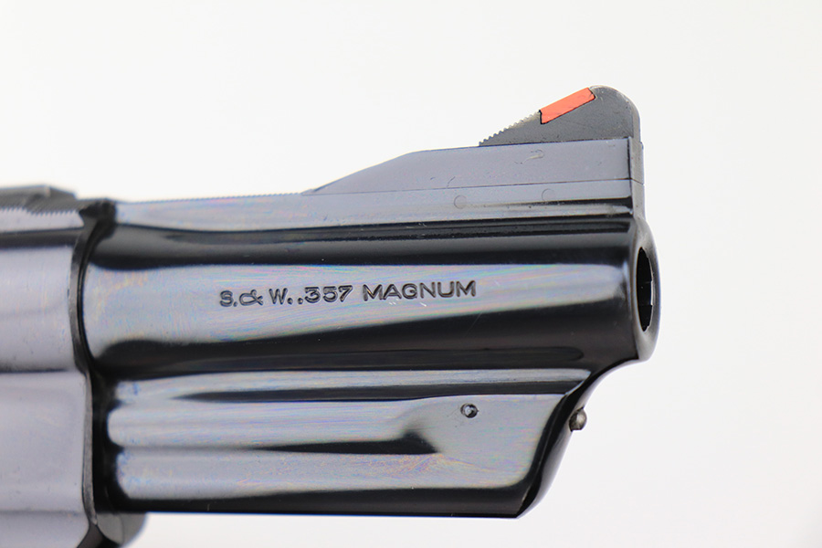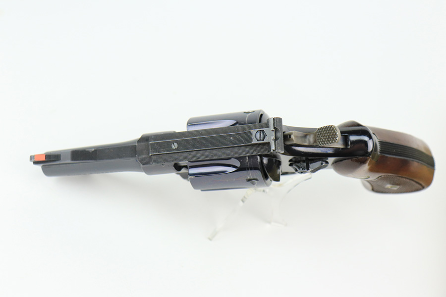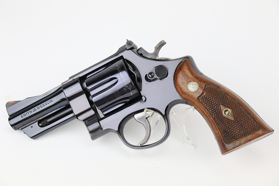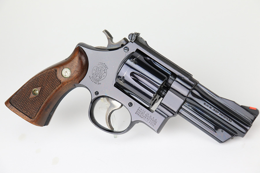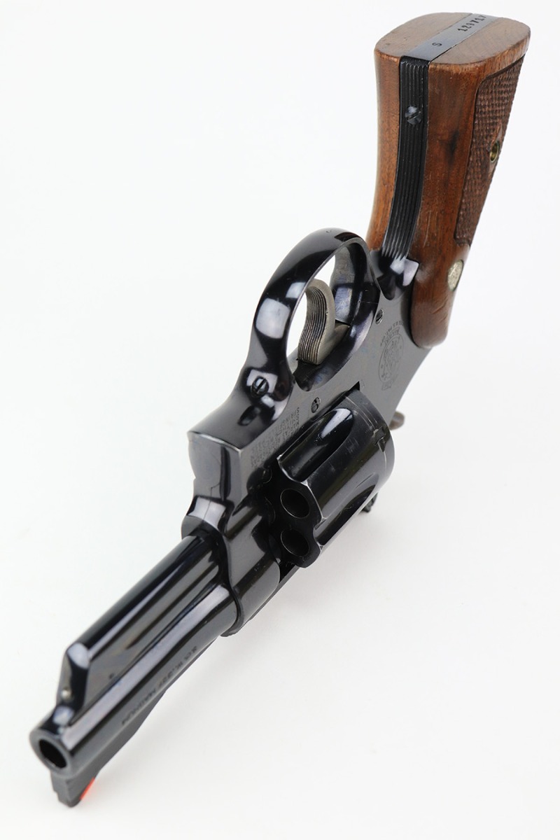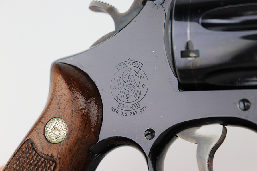 5/16/22 – This is an excellent example of a Smith & Wesson Pre-27 revolver manufactured in late 1953 – early 1954. Chambered in .357 Magnum and has a 3.5 inch barrel. It comes in a period-correct box that is numbered to match the gun. However, the box says 6 inch barrel, so we cannot say for sure if the numbering is original. The gun has retained about 97% of its original high polish finish with some roll marks on the cylinder and some tiny scratches on the butt of the frame. Comes with excellent wood grips and a rubber grip extension. Minty bore. The cylinder is tight and the action is smooth. There is a very light import mark in the well for the ejector rod.