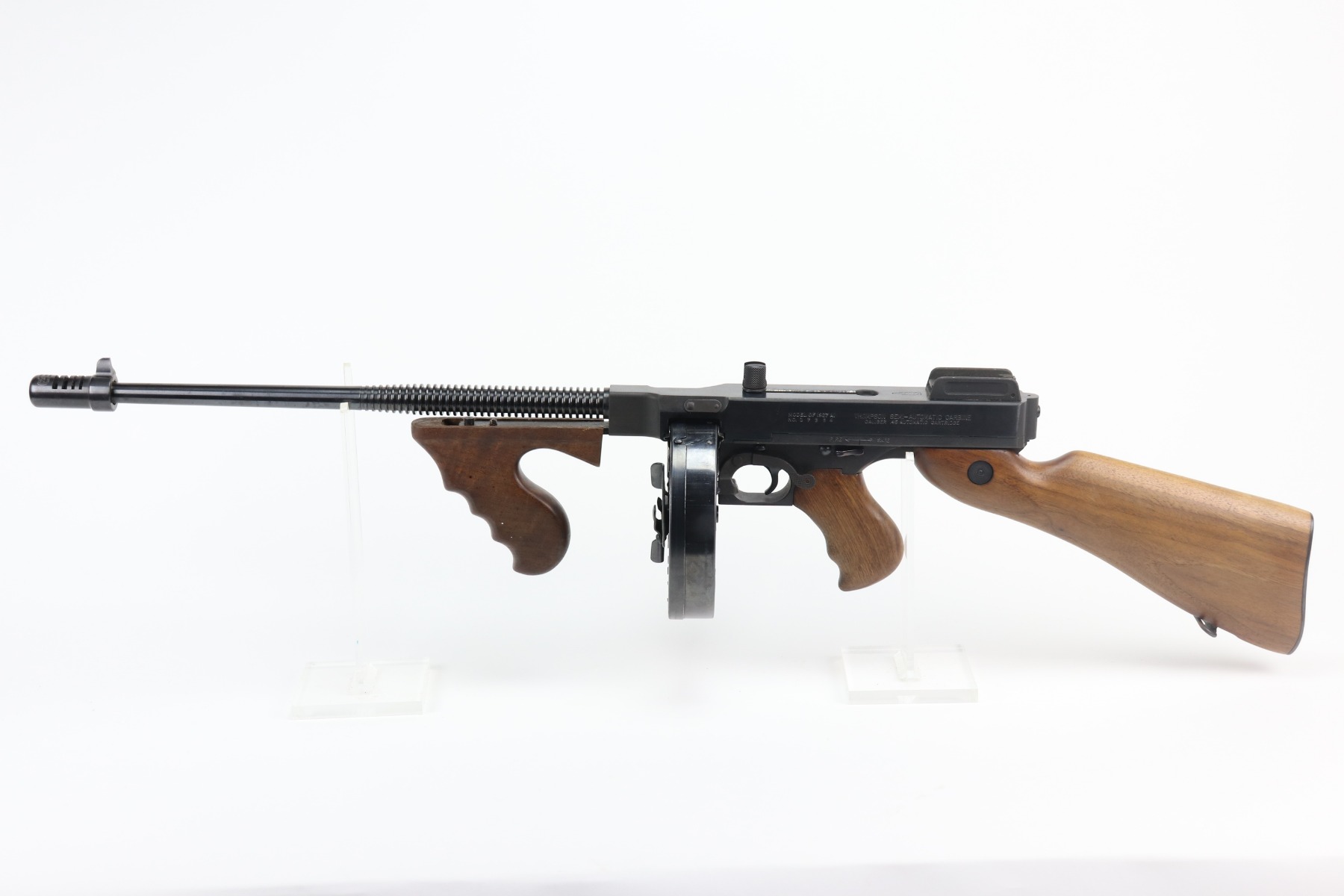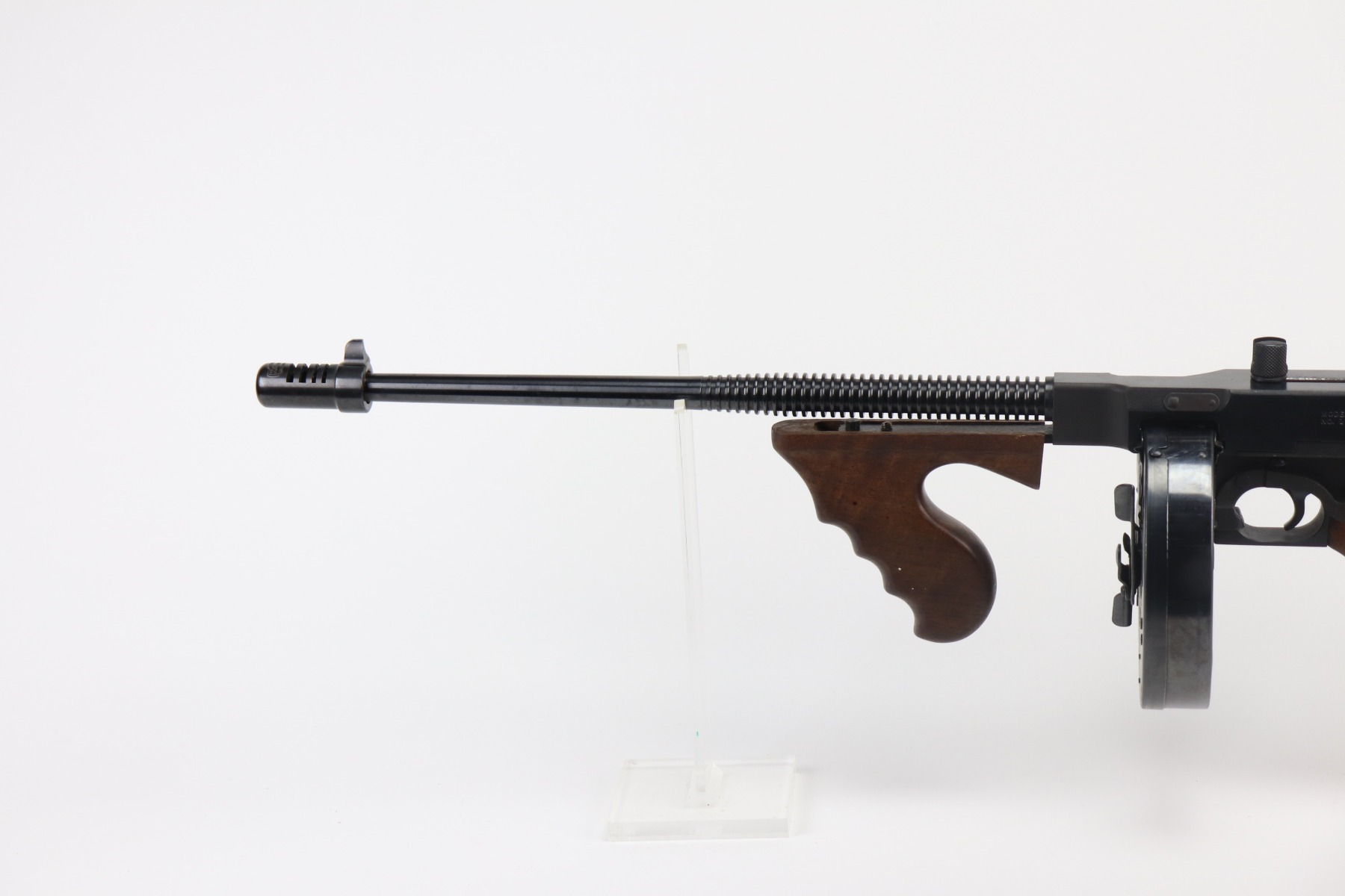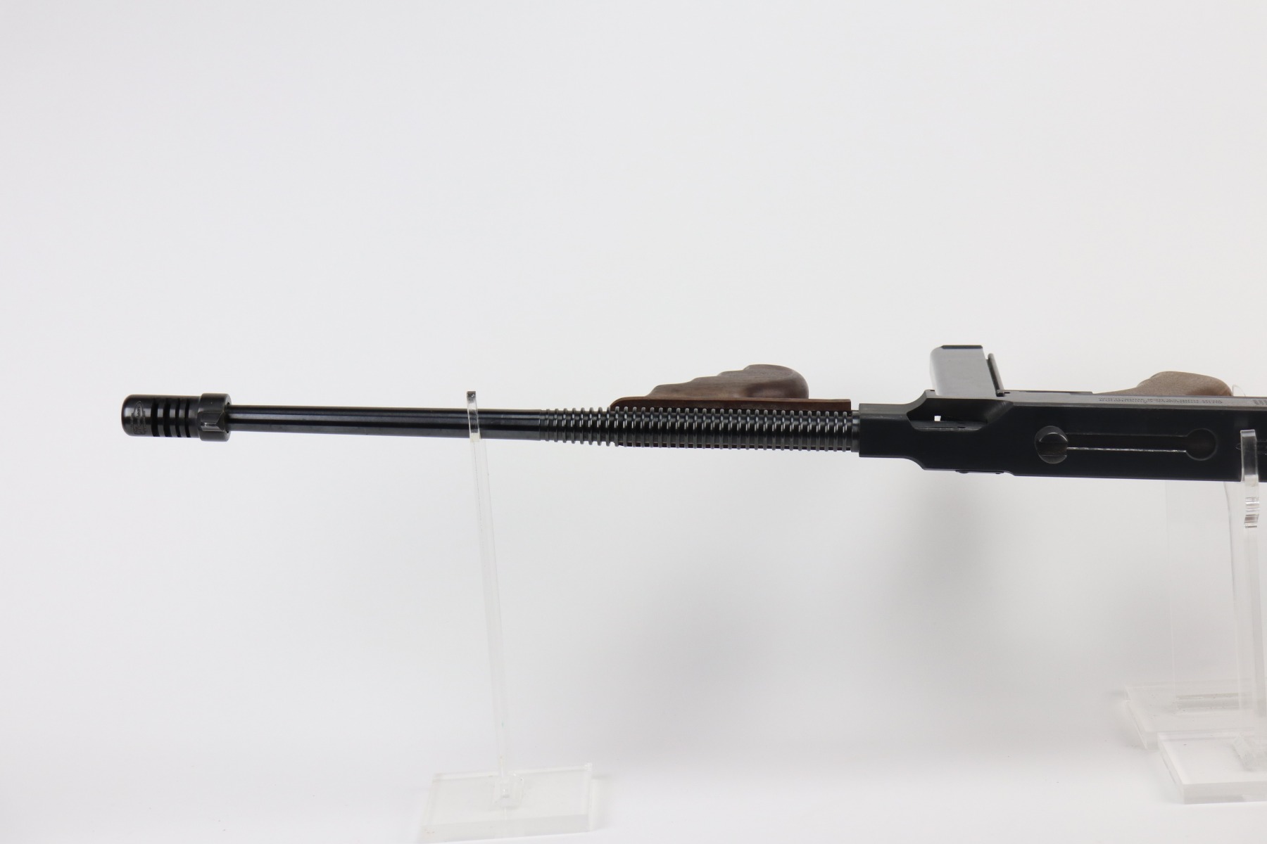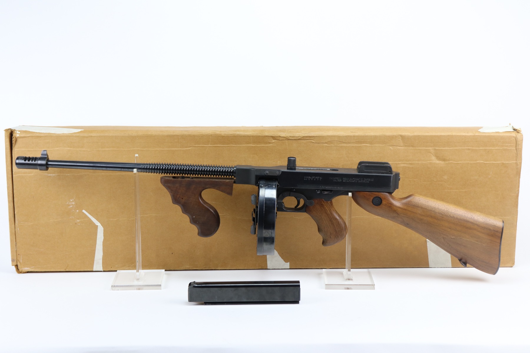 5/13/21 – This is a near-mint Auto Ordnance Thompson 1927A1 in the original box. It’s original and in semi-auto with the deluxe, longer 18in barrel with compensator on muzzle. Minty bore. The gun has no wear as the original buyer did not fire it, but it does have minor oxidation in several areas as it was not stored perfectly. Excellent wood parts with no cracks or chips. Comes with 50 round drum and some of the original manuals/paperwork.