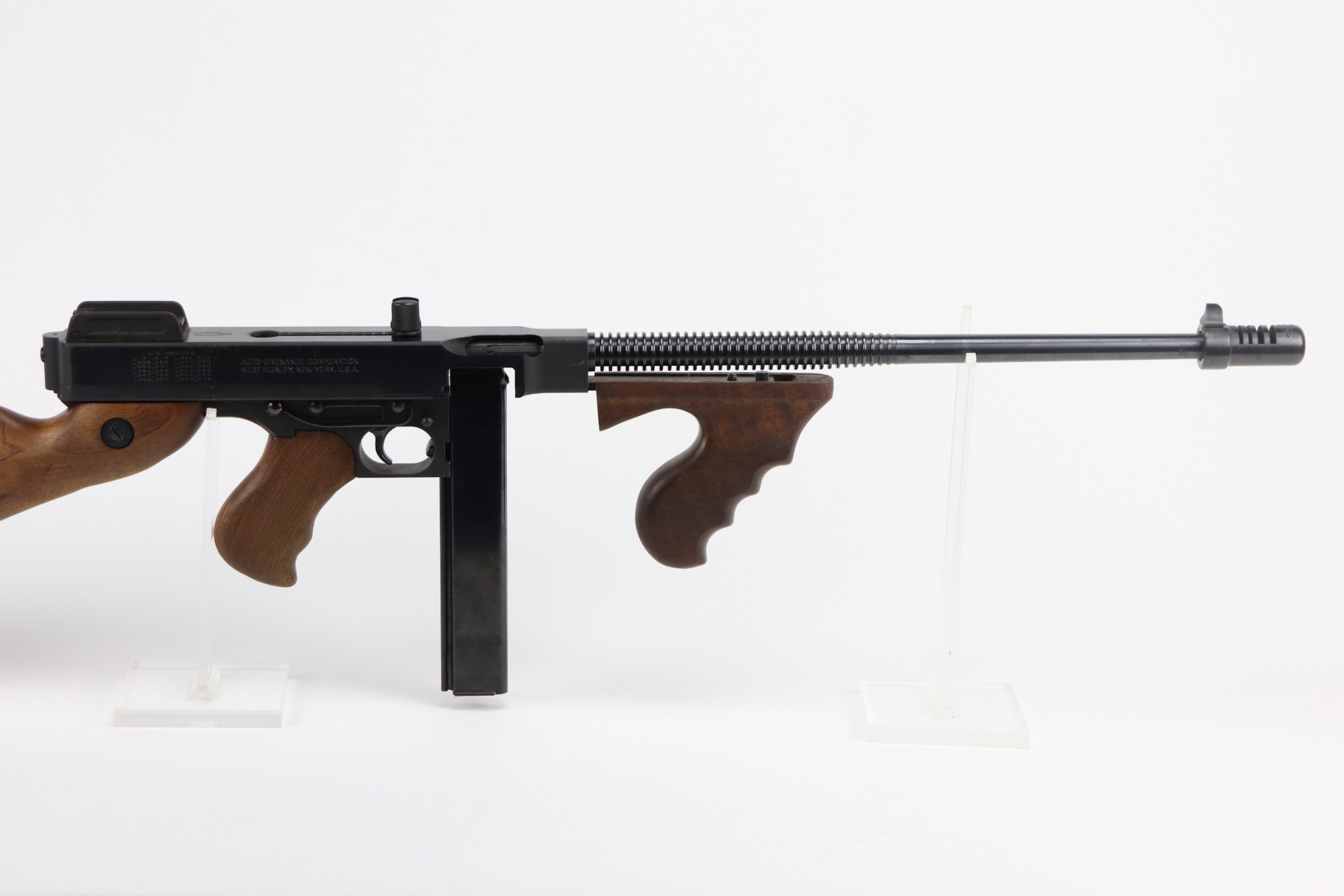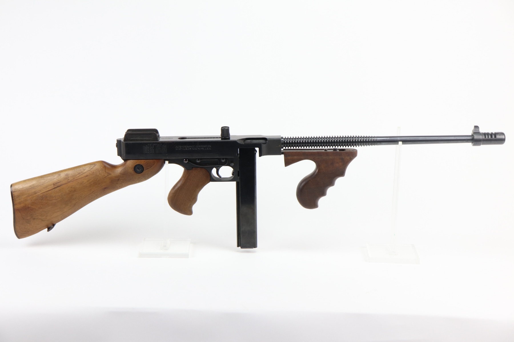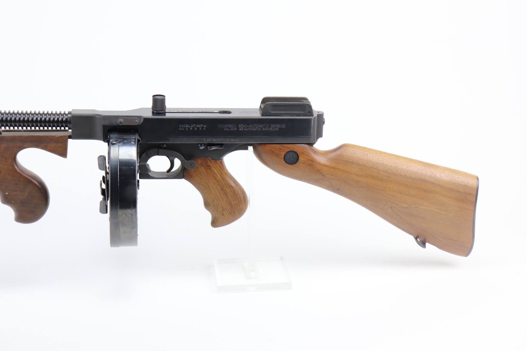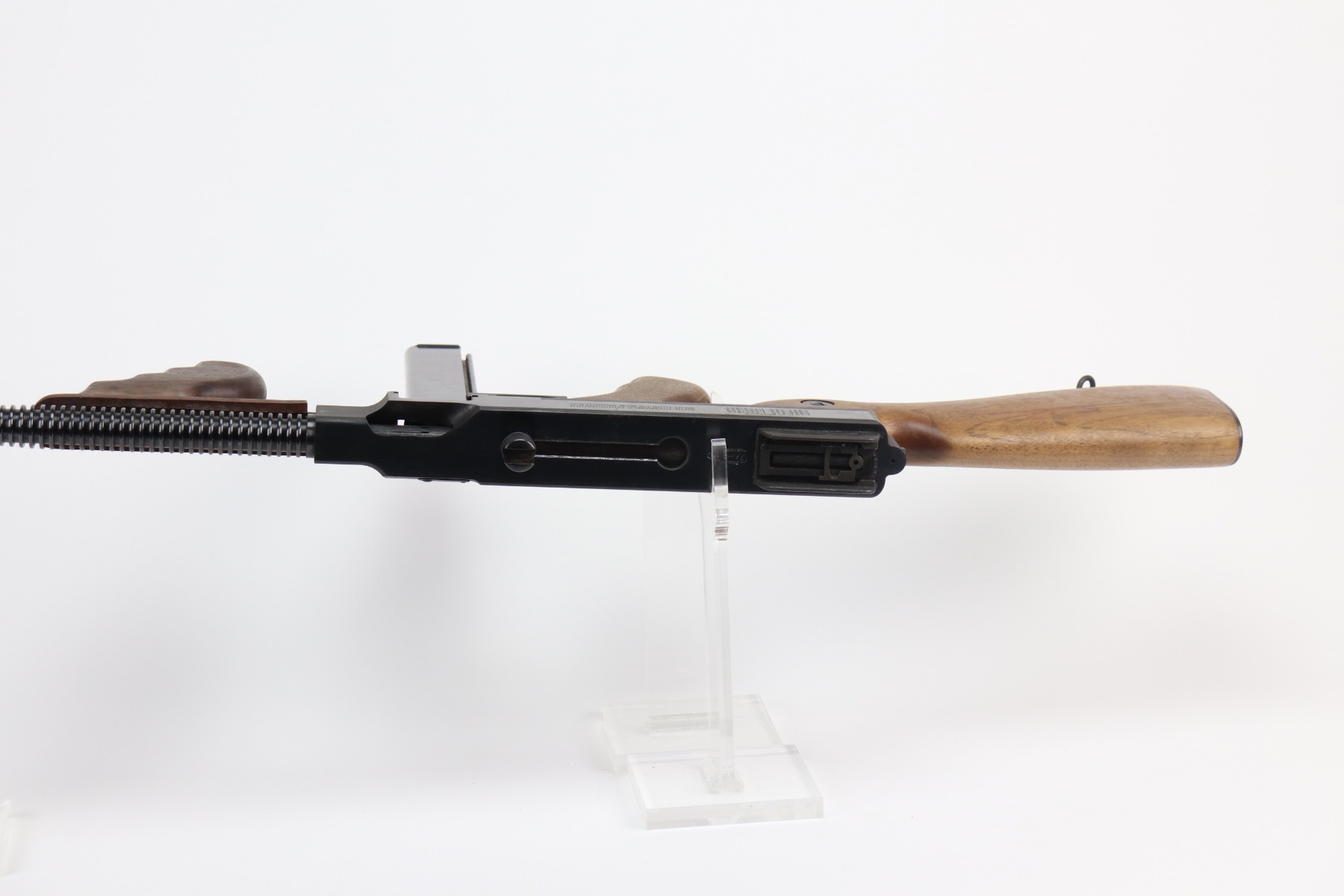 5/13/21 – This is a near-mint Auto Ordnance Thompson 1927A1 in the original box. It’s original and in semi-auto with the deluxe, longer 18in barrel with compensator on muzzle. Minty bore. The gun has no wear as the original buyer did not fire it, but it does have minor oxidation in several areas as it was not stored perfectly. Excellent wood parts with no cracks or chips. Comes with 50 round drum and some of the original manuals/paperwork.