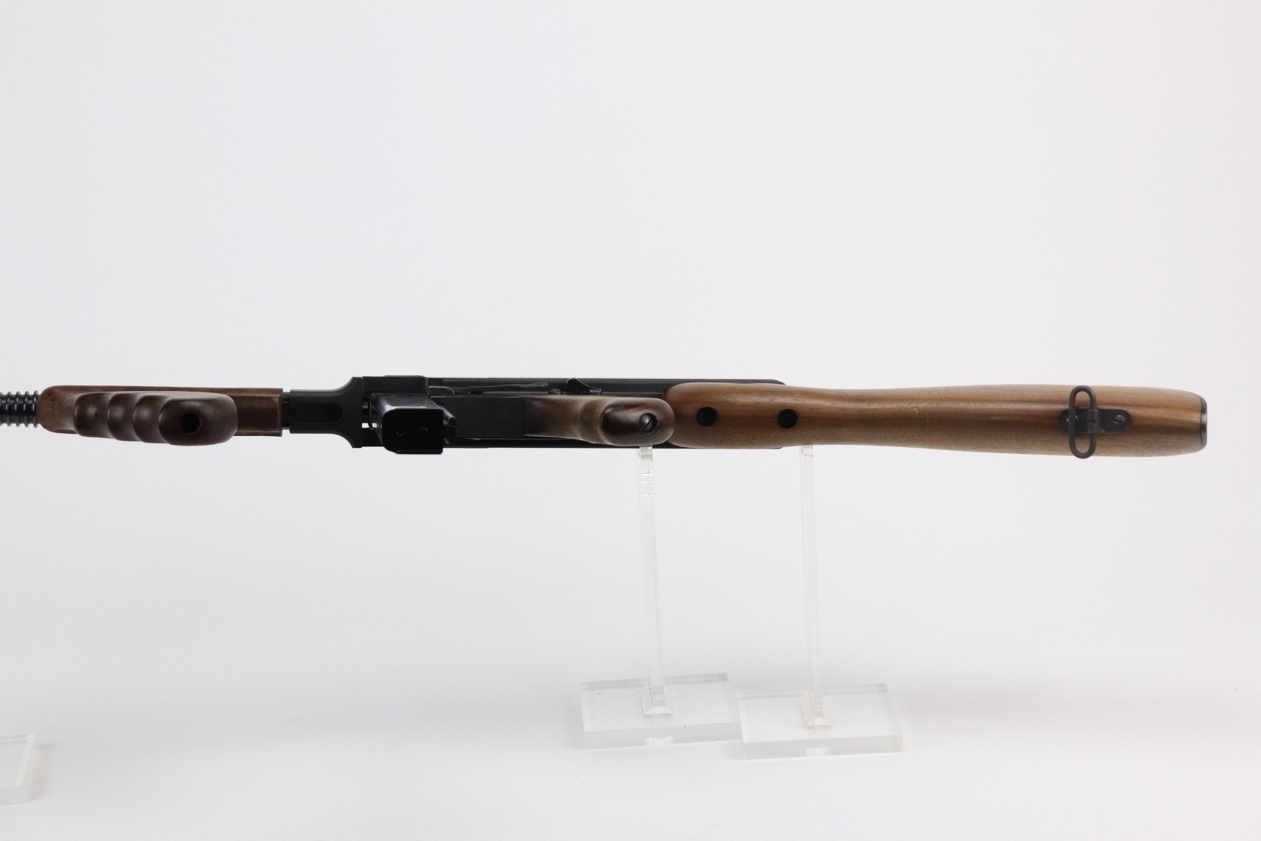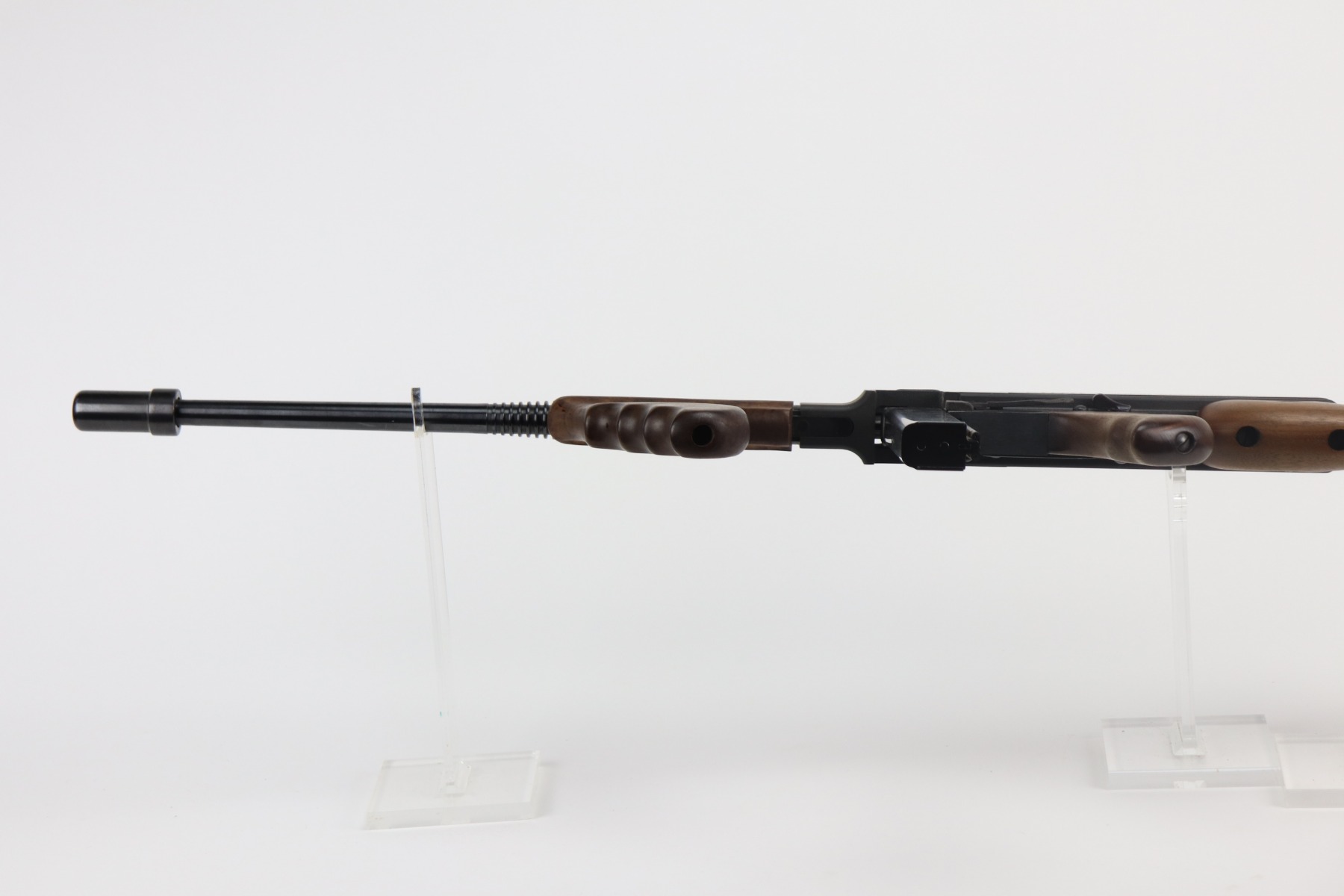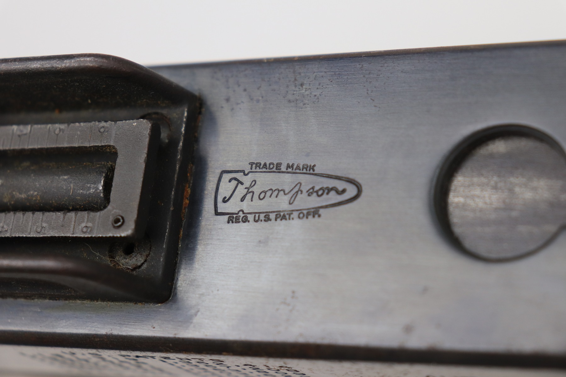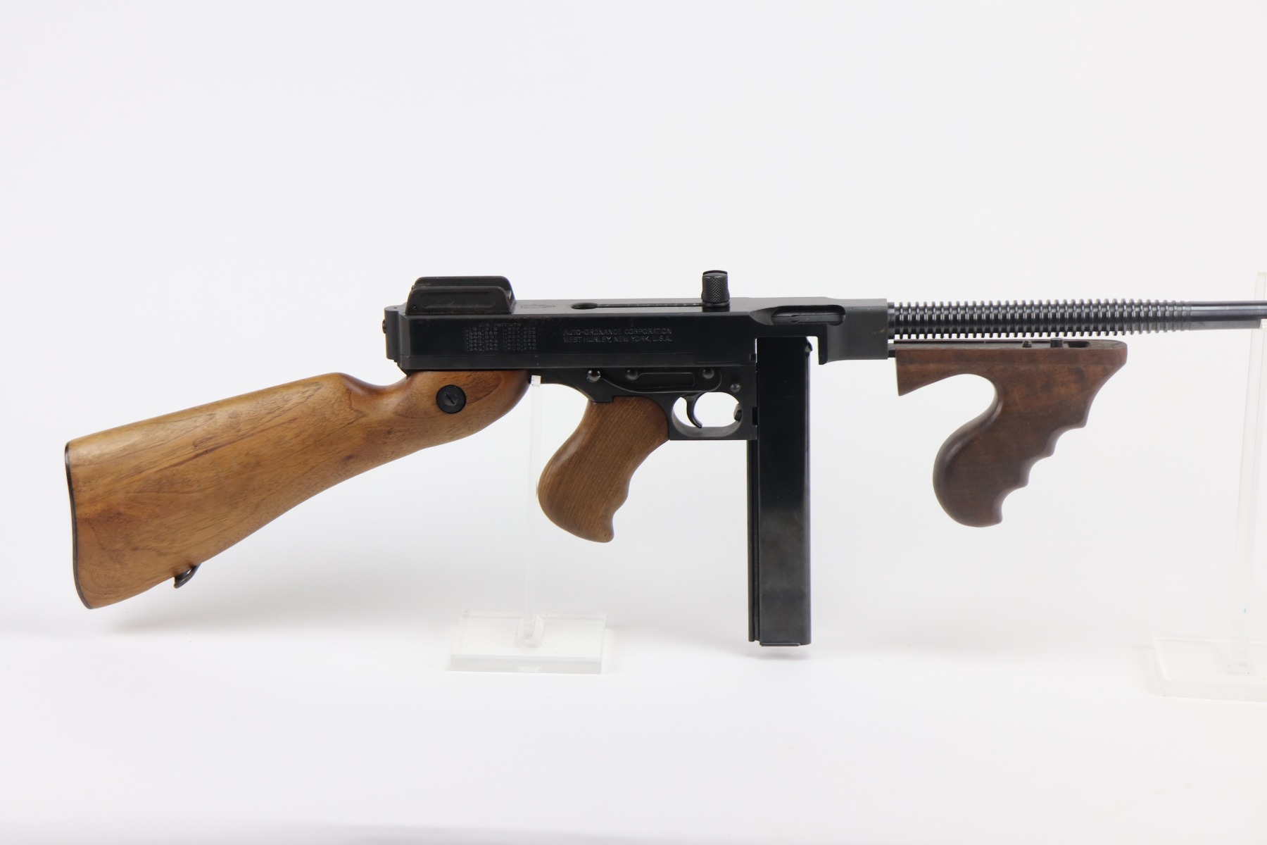 5/13/21 – This is a near-mint Auto Ordnance Thompson 1927A1 in the original box. It’s original and in semi-auto with the deluxe, longer 18in barrel with compensator on muzzle. Minty bore. The gun has no wear as the original buyer did not fire it, but it does have minor oxidation in several areas as it was not stored perfectly. Excellent wood parts with no cracks or chips. Comes with 50 round drum and some of the original manuals/paperwork.