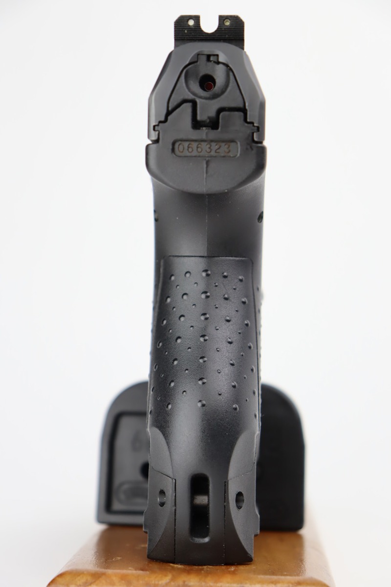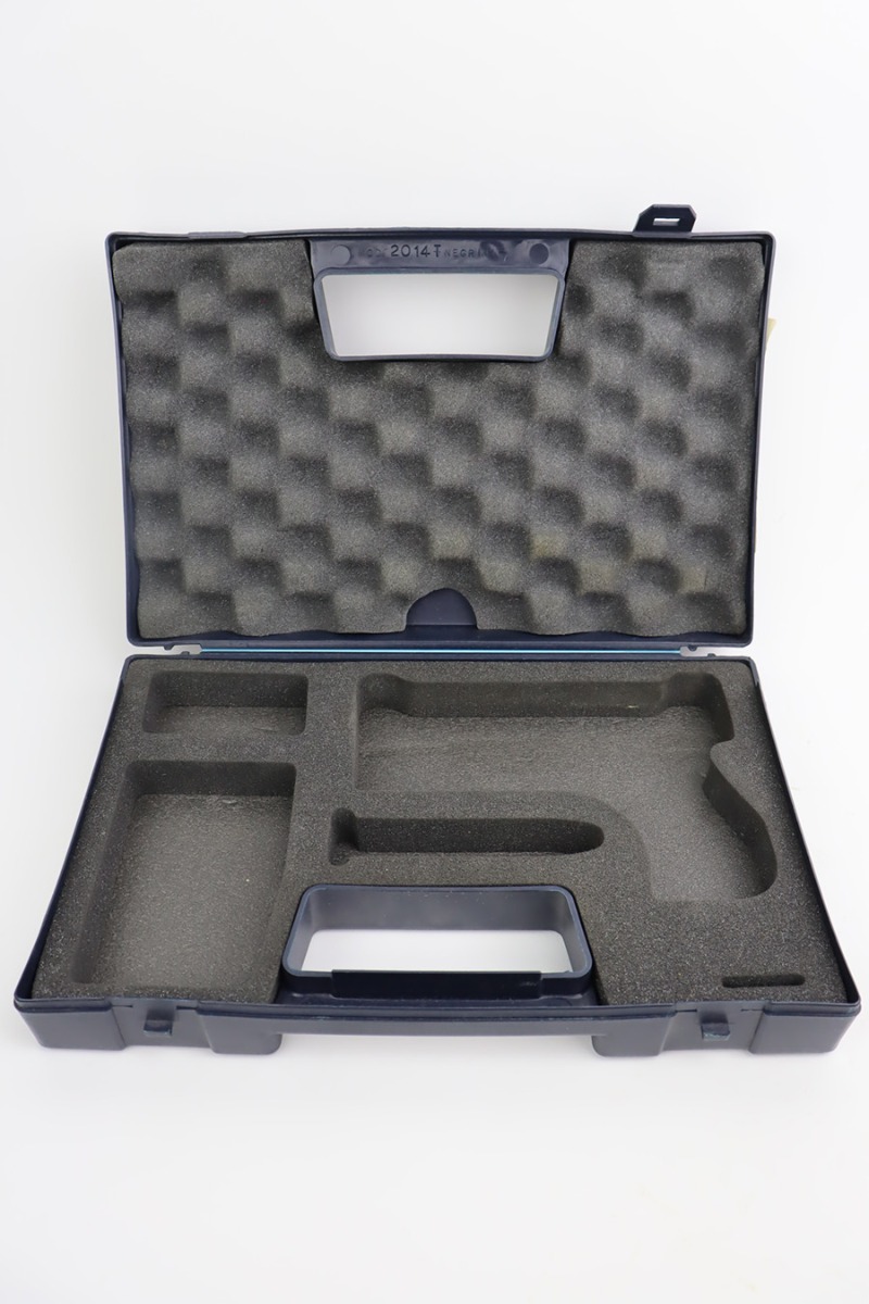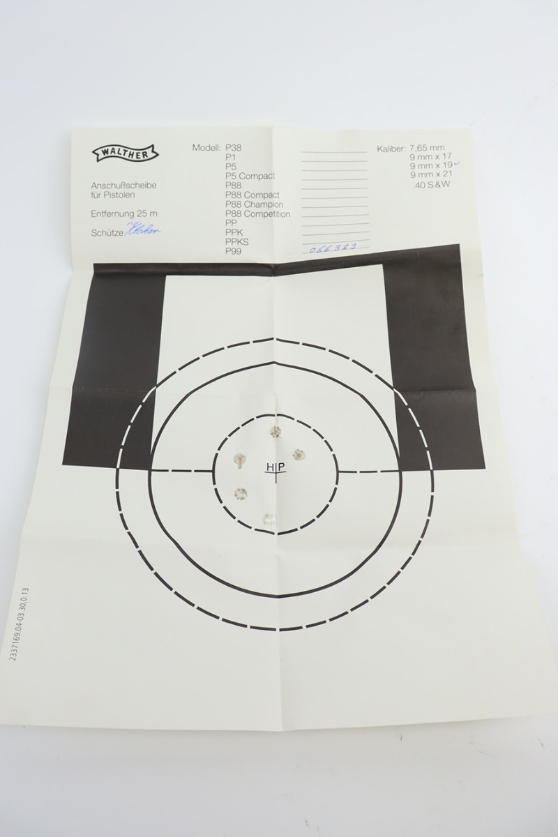 10/10/23 – This is a near-mint, first generation Walther P99 in the original box. Date code of 2003. Tiny bit of high edge wear with a mint bore. Comes with the original matching box and test target. Also has the grip extensions, spare mags, basic paperwork, etc. Comes with small leather holster.
