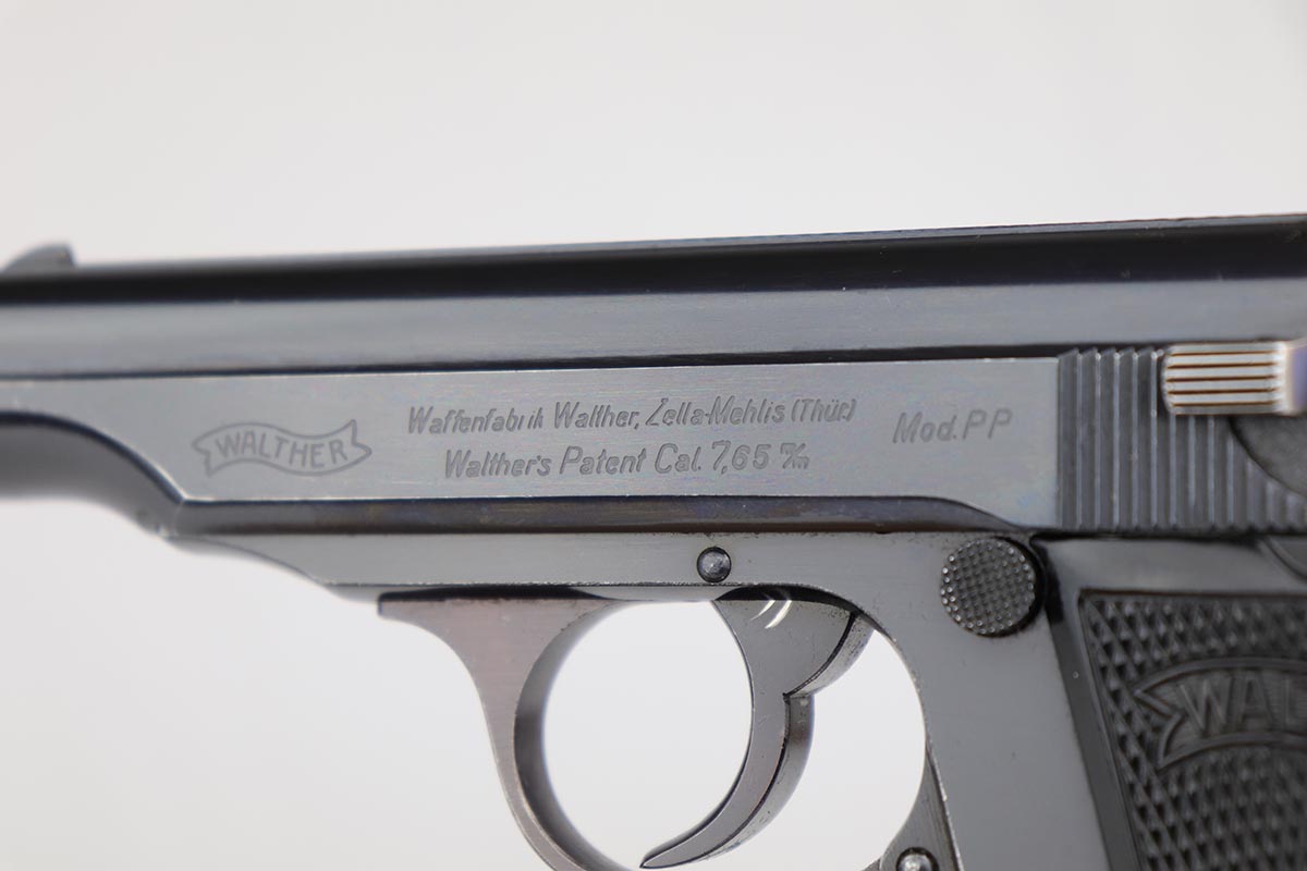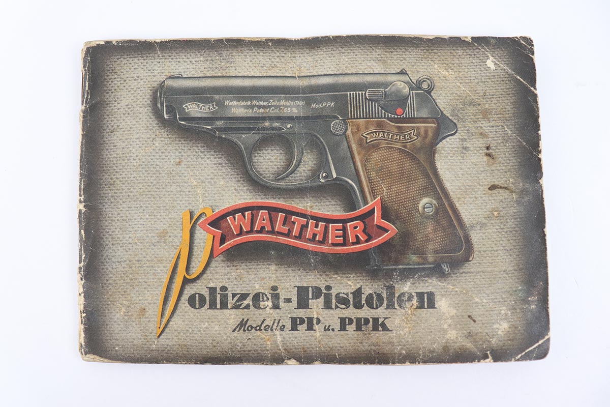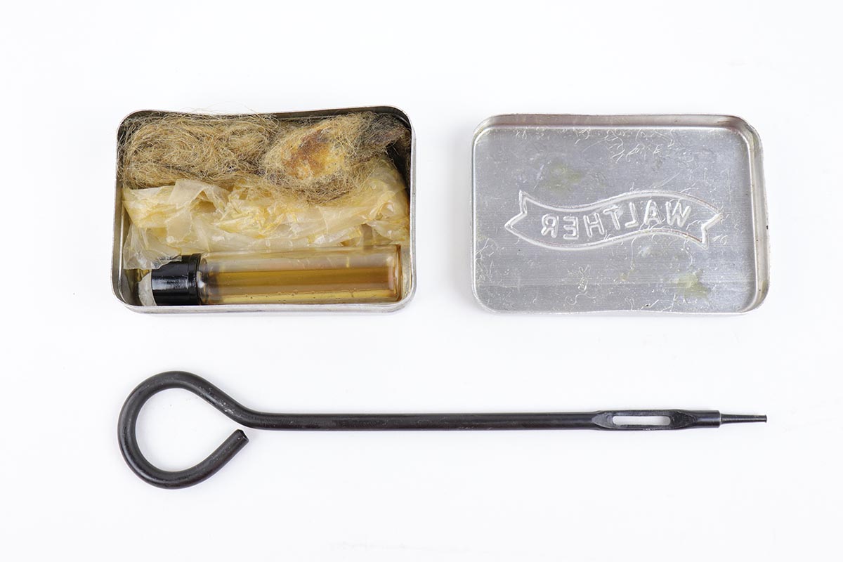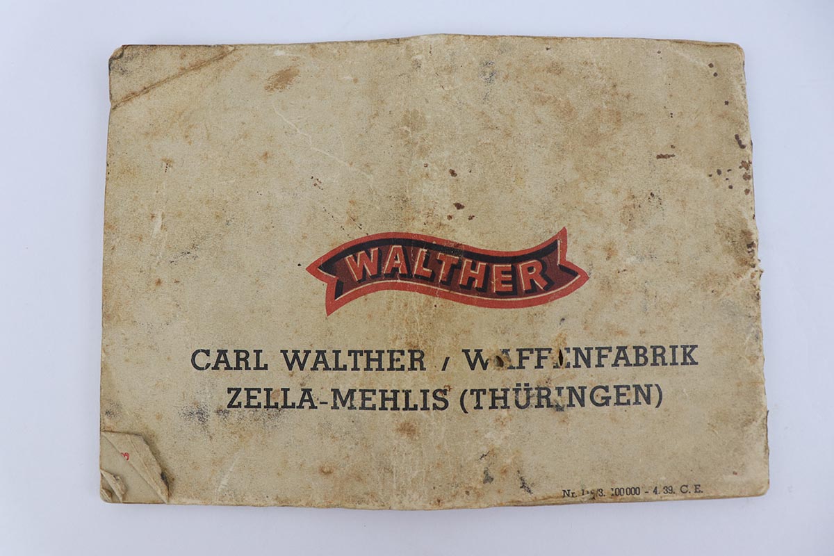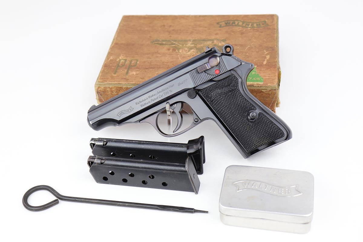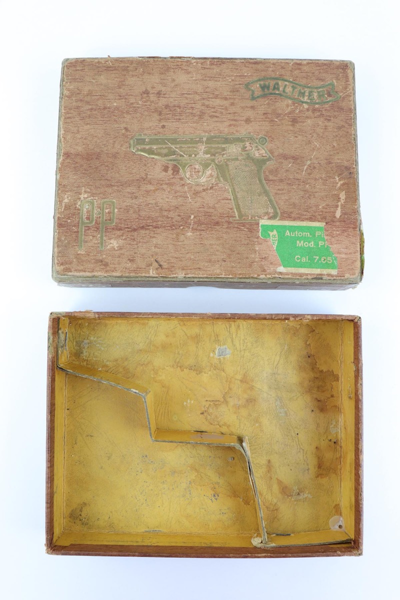 5/8/24 – This is an excellent Walther PP in the original matching box, with spare magazine, cleaning rod, cleaning tin and manual. The assembly was manufactured in 1940, and the pistol retains 97-98% original high-polish blue, with minor muzzle wear and an area of finish loss on the back strap. The original box is in good condition, though it has been repaired with glue in some areas, and label is clearly numbered to the gun. Excellent spare magazine. Minty bore. Correct and original cleaning rod, tin and manual.