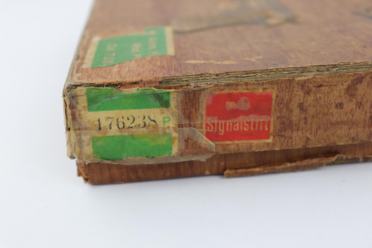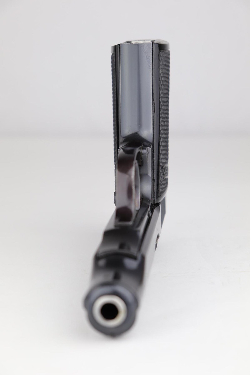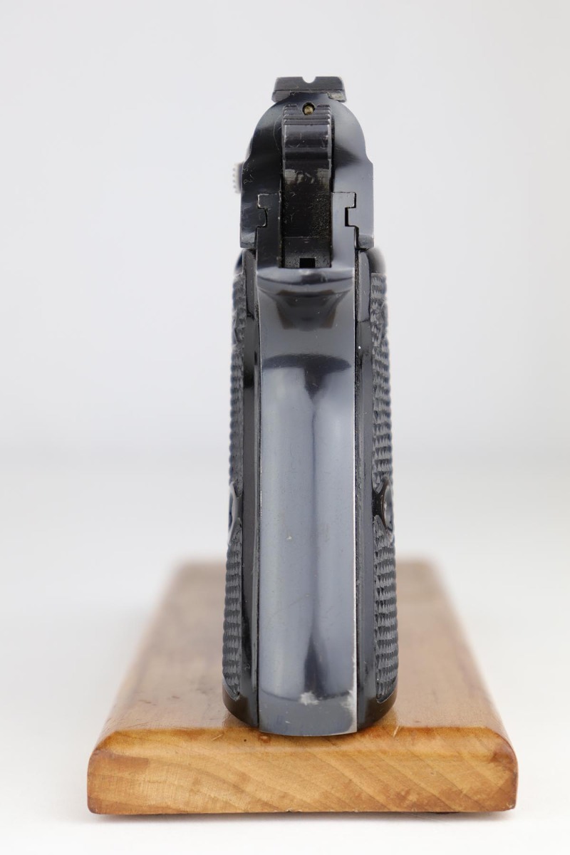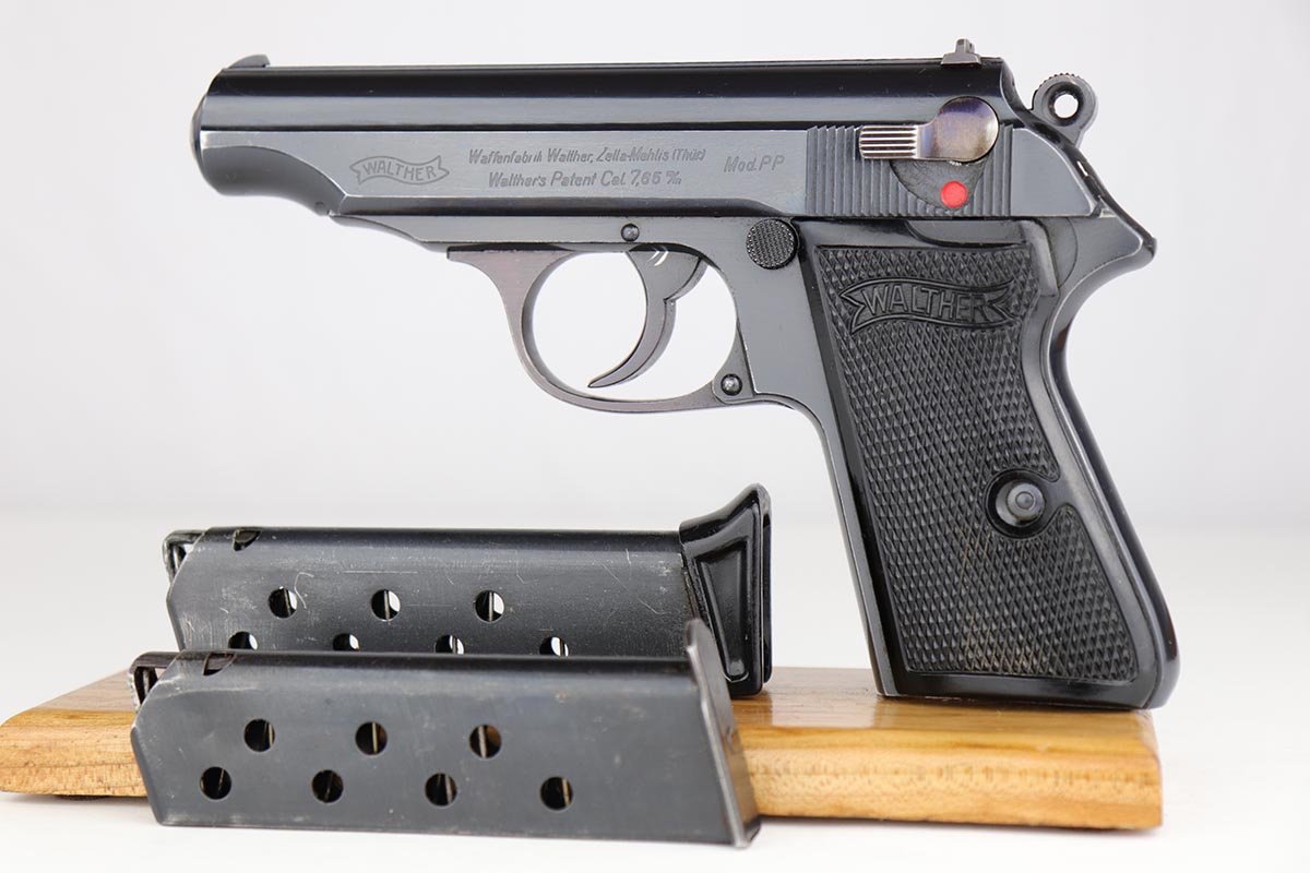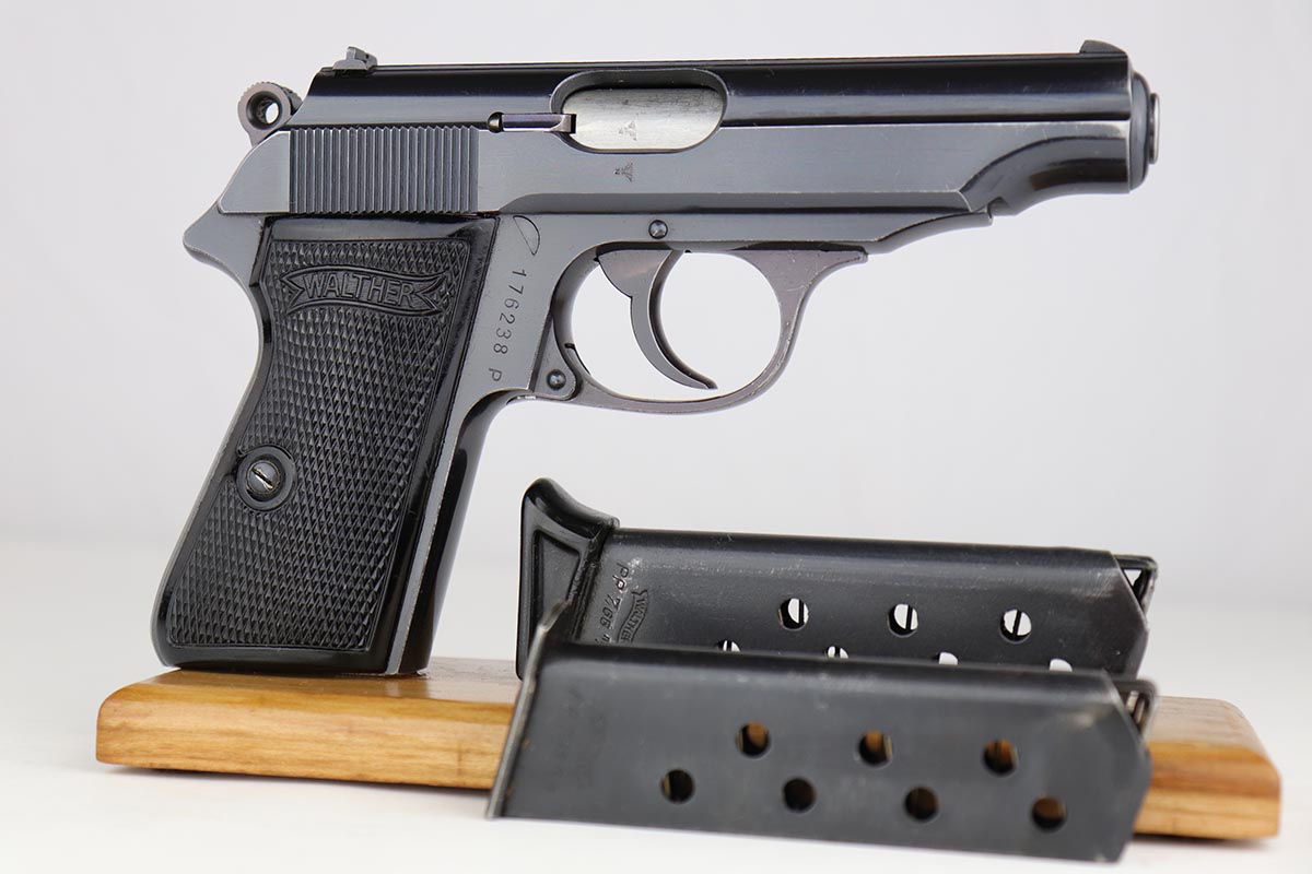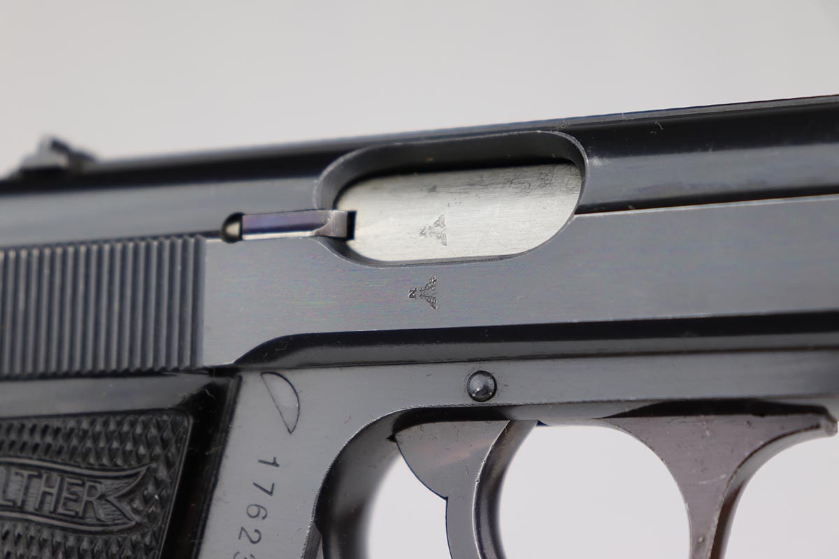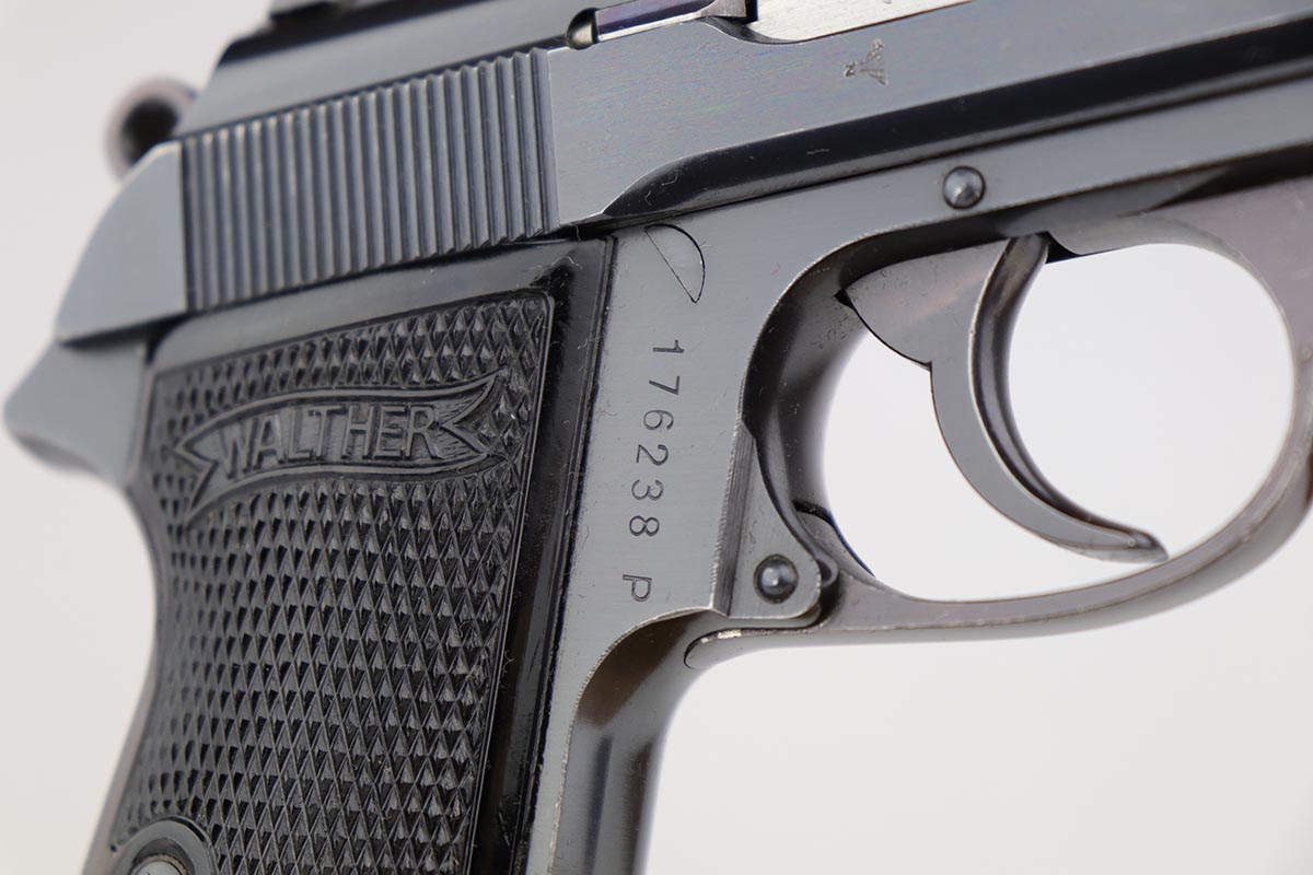 5/8/24 – This is an excellent Walther PP in the original matching box, with spare magazine, cleaning rod, cleaning tin and manual. The assembly was manufactured in 1940, and the pistol retains 97-98% original high-polish blue, with minor muzzle wear and an area of finish loss on the back strap. The original box is in good condition, though it has been repaired with glue in some areas, and label is clearly numbered to the gun. Excellent spare magazine. Minty bore. Correct and original cleaning rod, tin and manual.