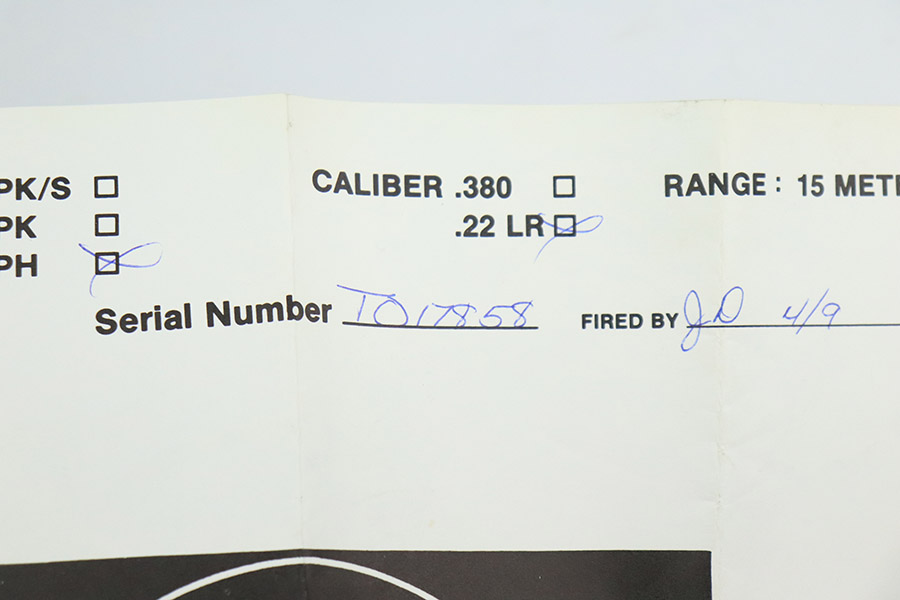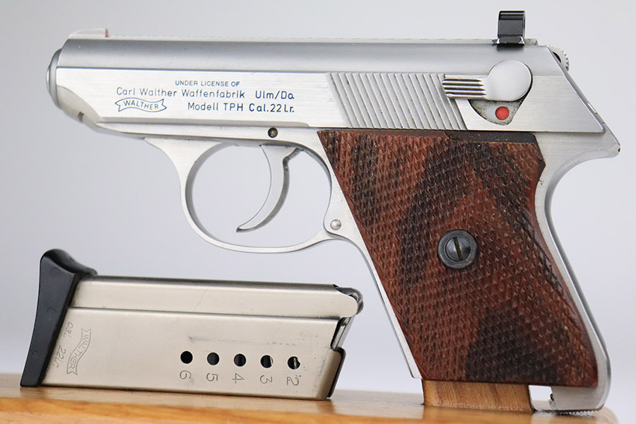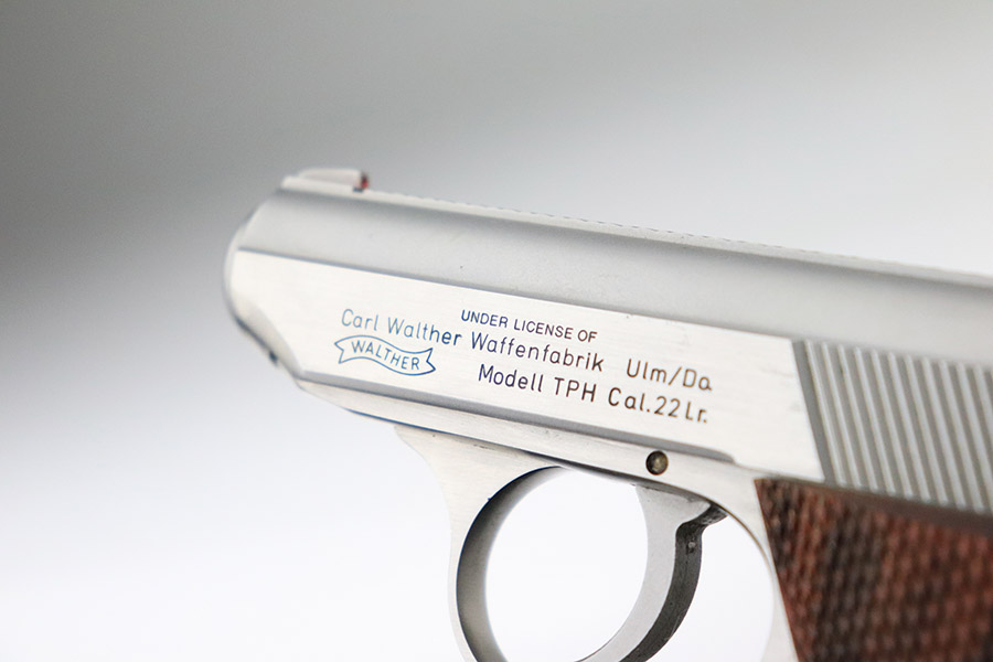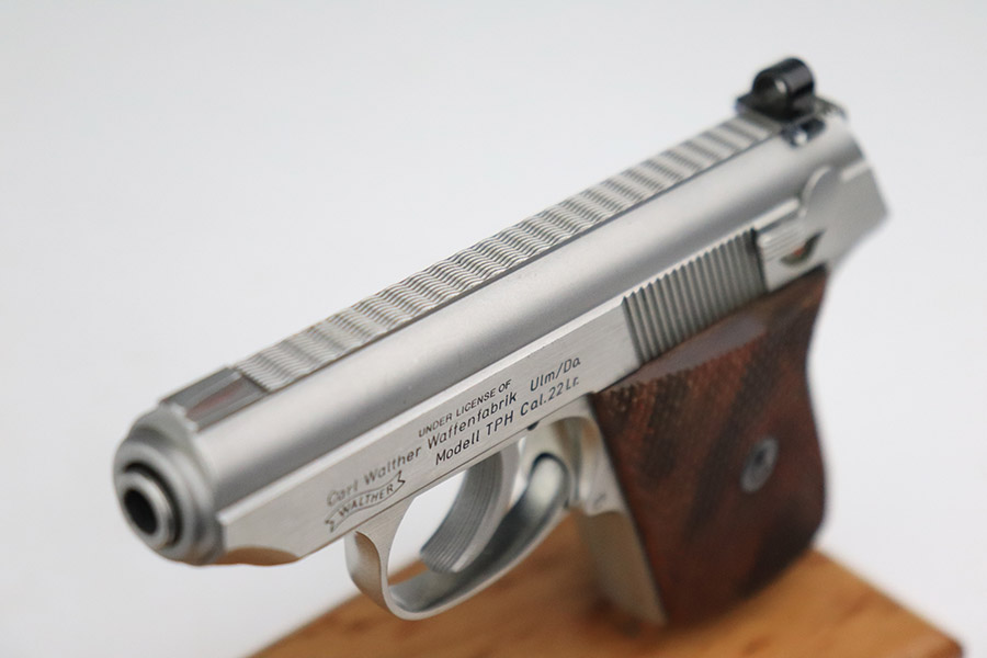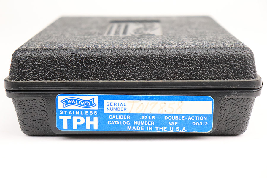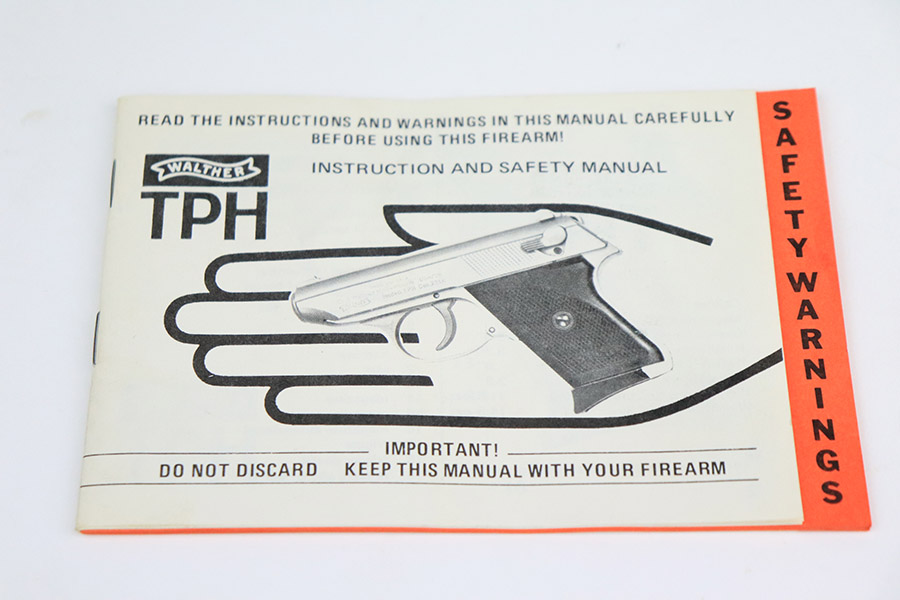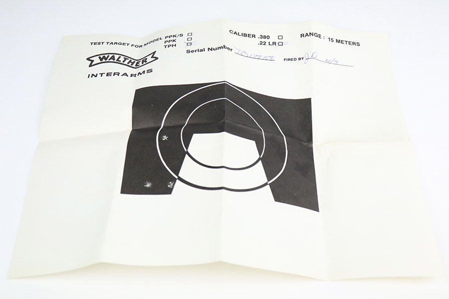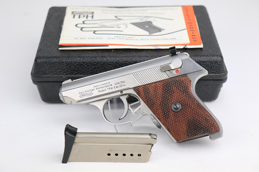 11/17/22 – This is an excellent example of a Walther Model TPH made in the US in the late 1980’s early 1990’s. Chambered in .22 LR. It is all matching and comes with its original matching box, original matching test target, owners manual, and one finger extension magazine. There are some small notches in the plastic mag base. The gun itself has a stainless finish and is in excellent condition. There are just some tiny scratches and handling marks along both sides of the slide. Comes with minty wood grips. The bore is near-mint.